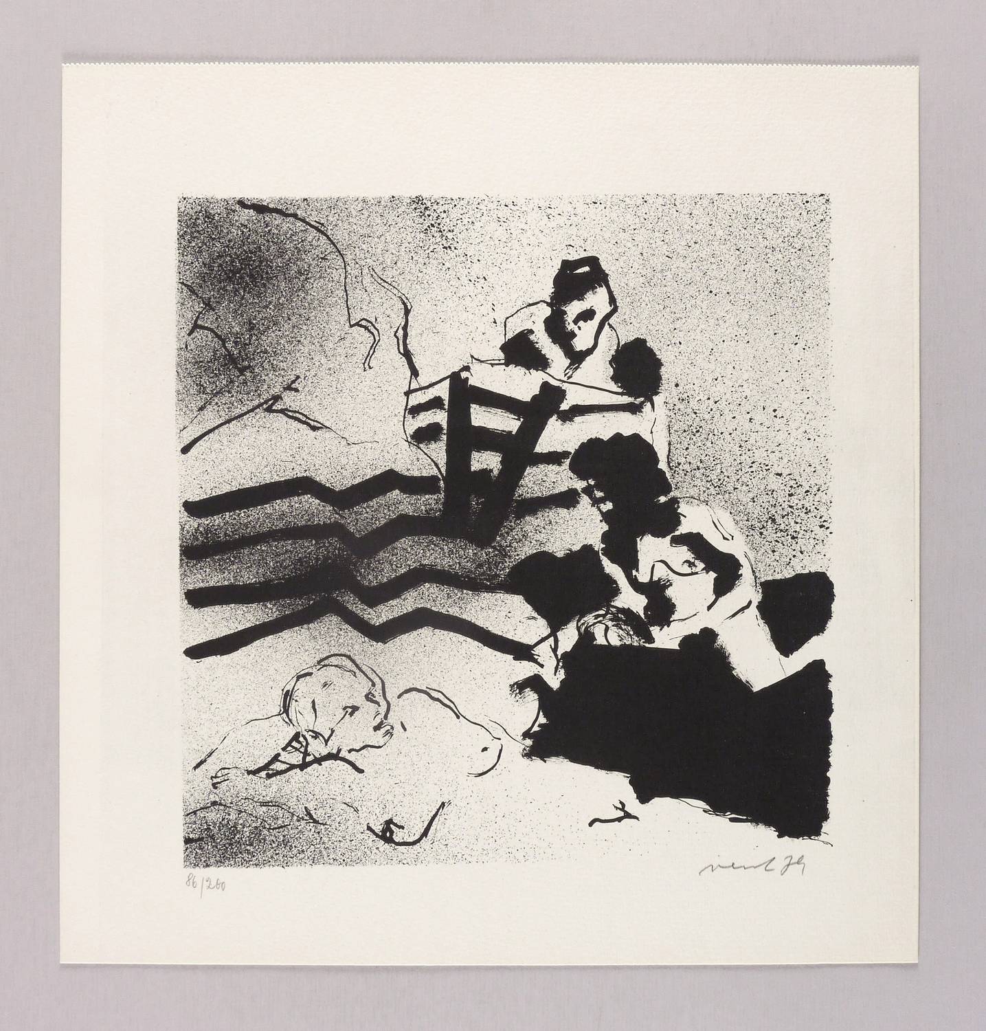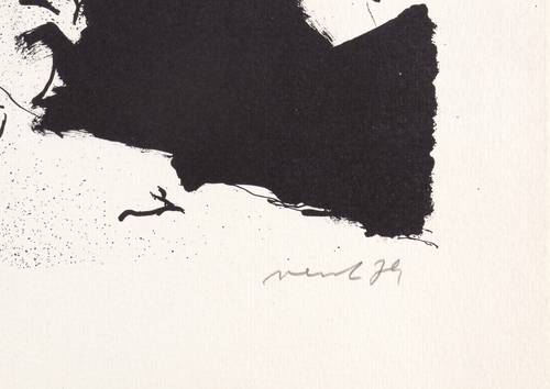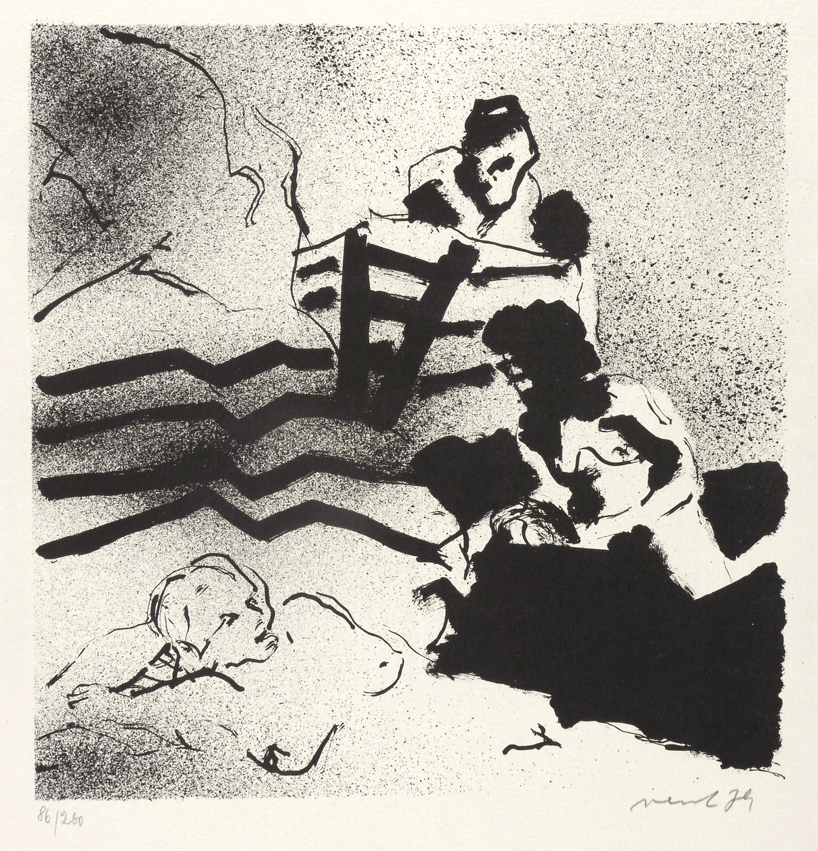 1979. Qffsetlithografie / Pinsellithografie, partiell gespritzt, in Schwarz, auf hartem hellchamois Velin. – Originale Künstlergrafik, von Hans Vent. – Auflage Exemplar Nr. 86/200. – 27,2 x 26,7 cm (Darstellung / Druckbild), 37 x 35 cm (Blatt).