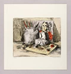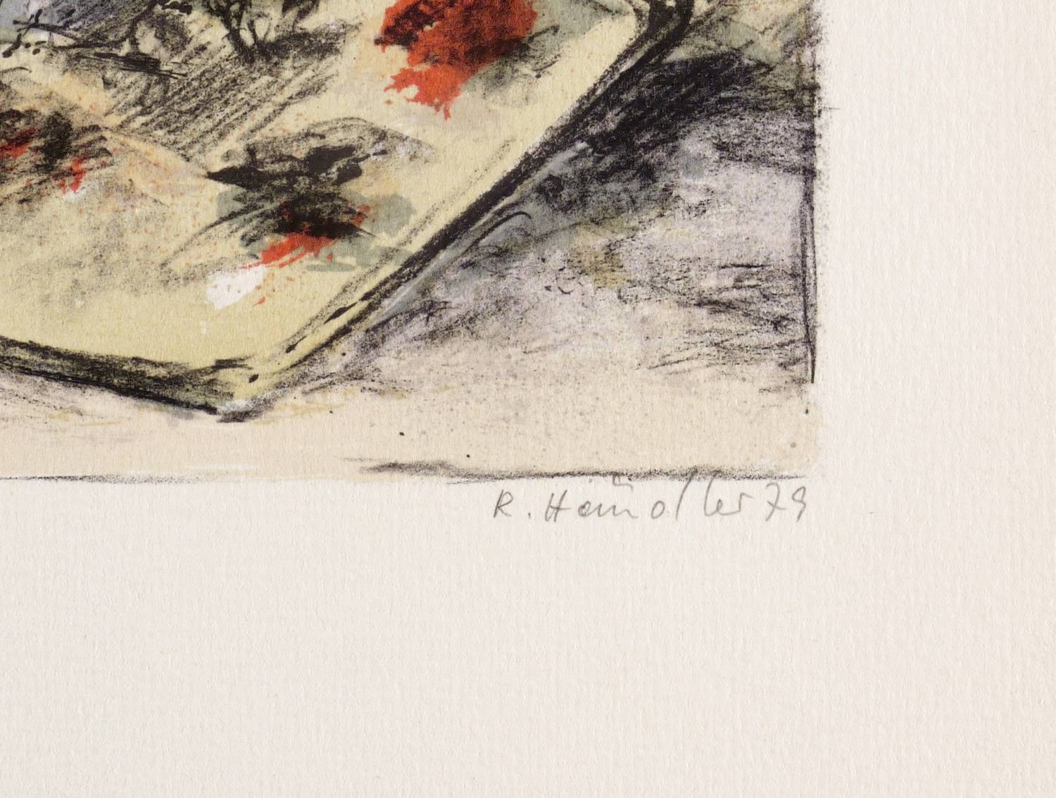 1979. Farboffsetlithografie / Kreide- & Pinsellithografie, in 6 Farben, auf hellem Maschinenkarton. – Originale Künstlergrafik, von Rolf Händler. – Auflage Exemplar Nr. 85/200. – 22,2 x 27,3 cm (Darstellung / Druckbild), 37 x 35 cm (Blatt).