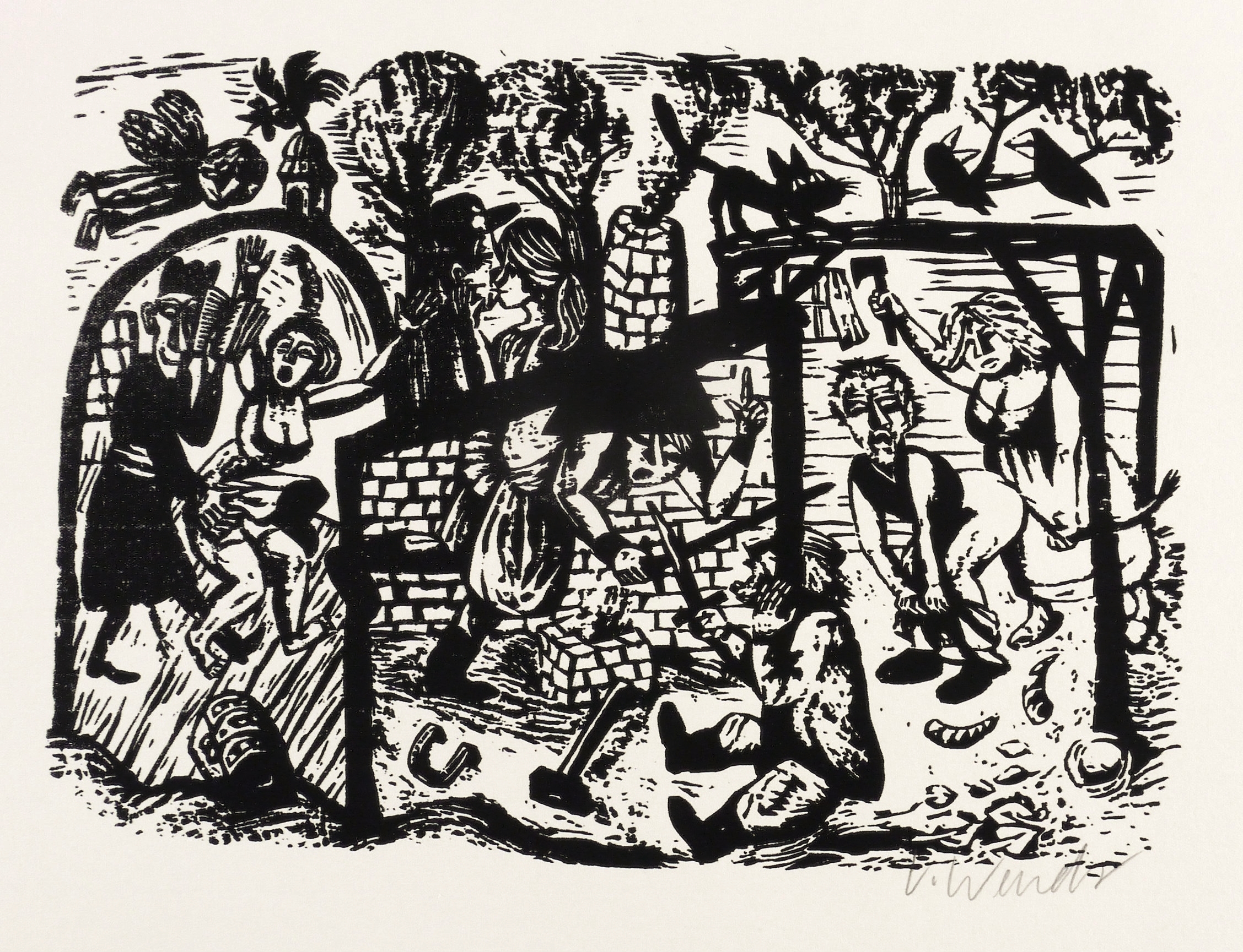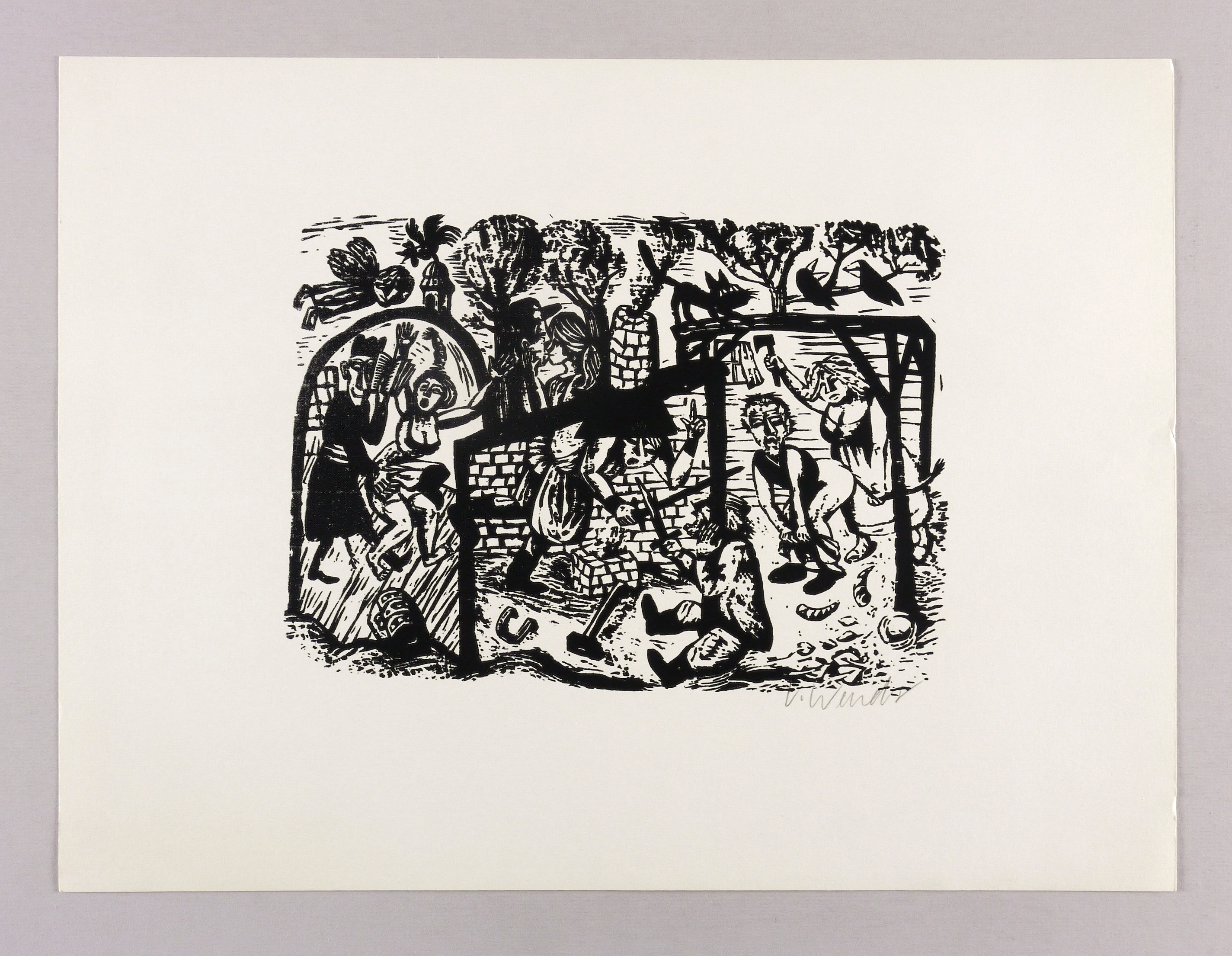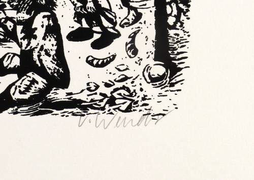 1974. Holzschnitt, in Schwarz, auf hellchamois Velin. – Originale Künstlergrafik, von Volker Wendt. – 21,8 x 29,8 cm (Darstellung / Druckstock), 38 x 51 cm (Blatt).