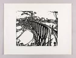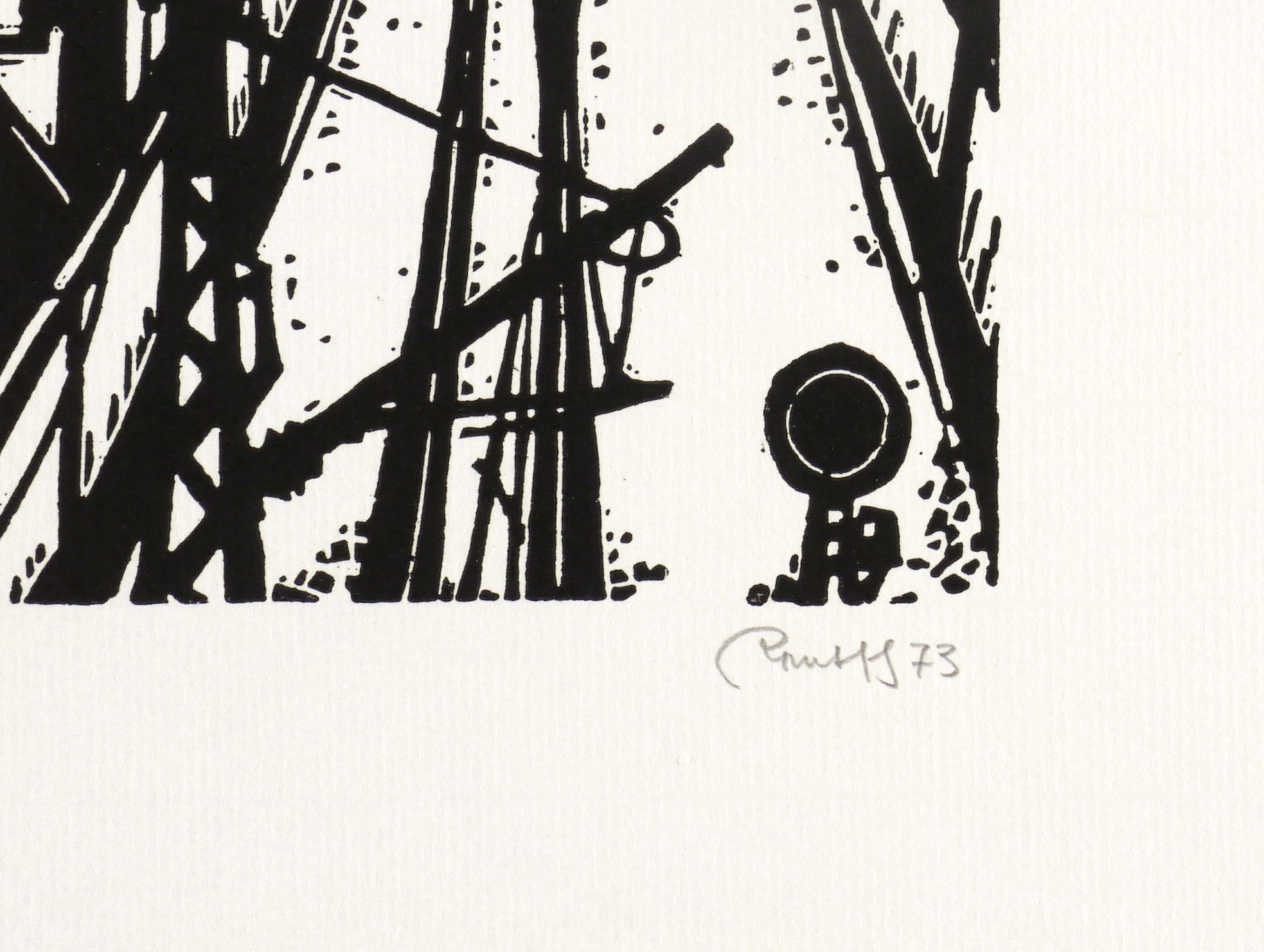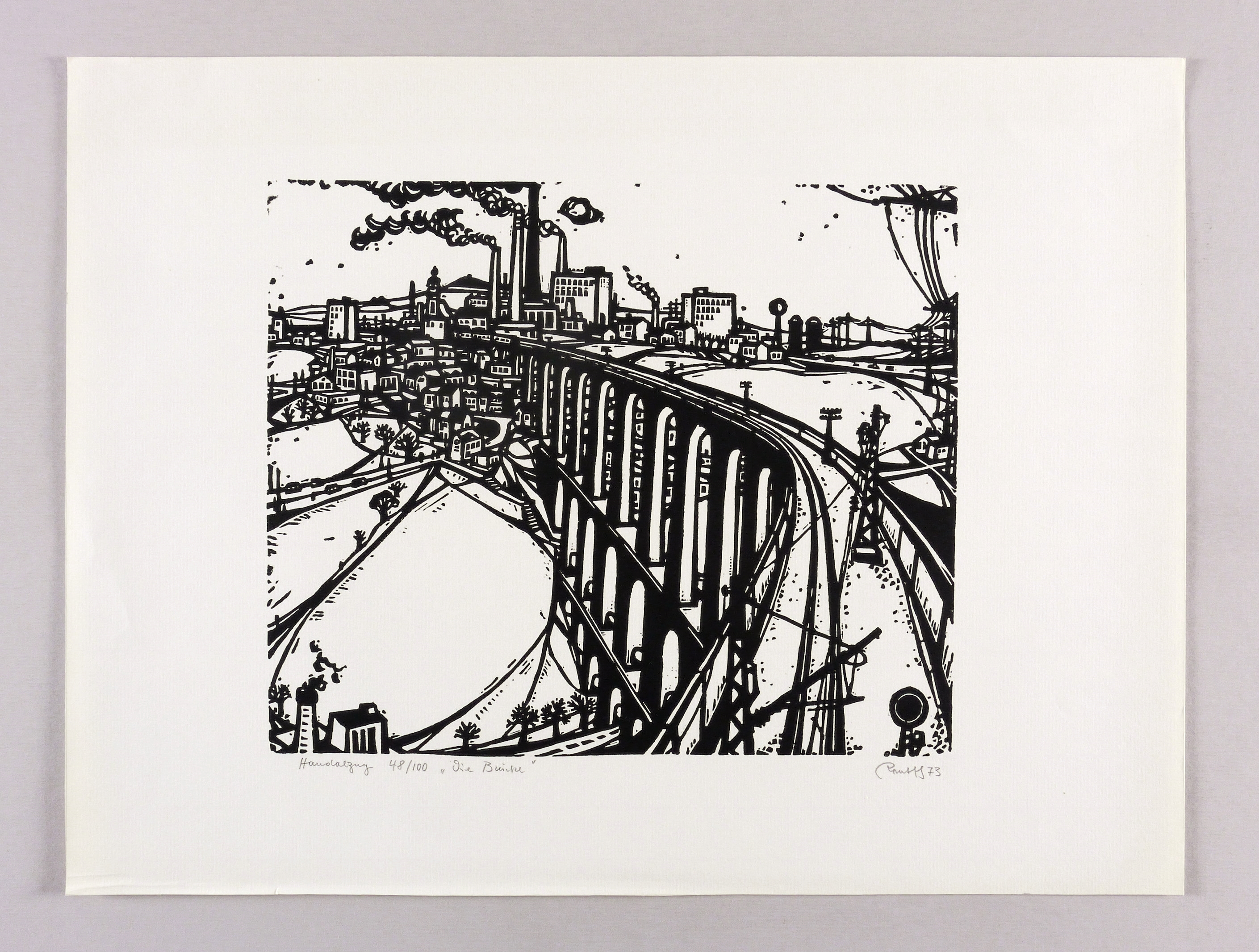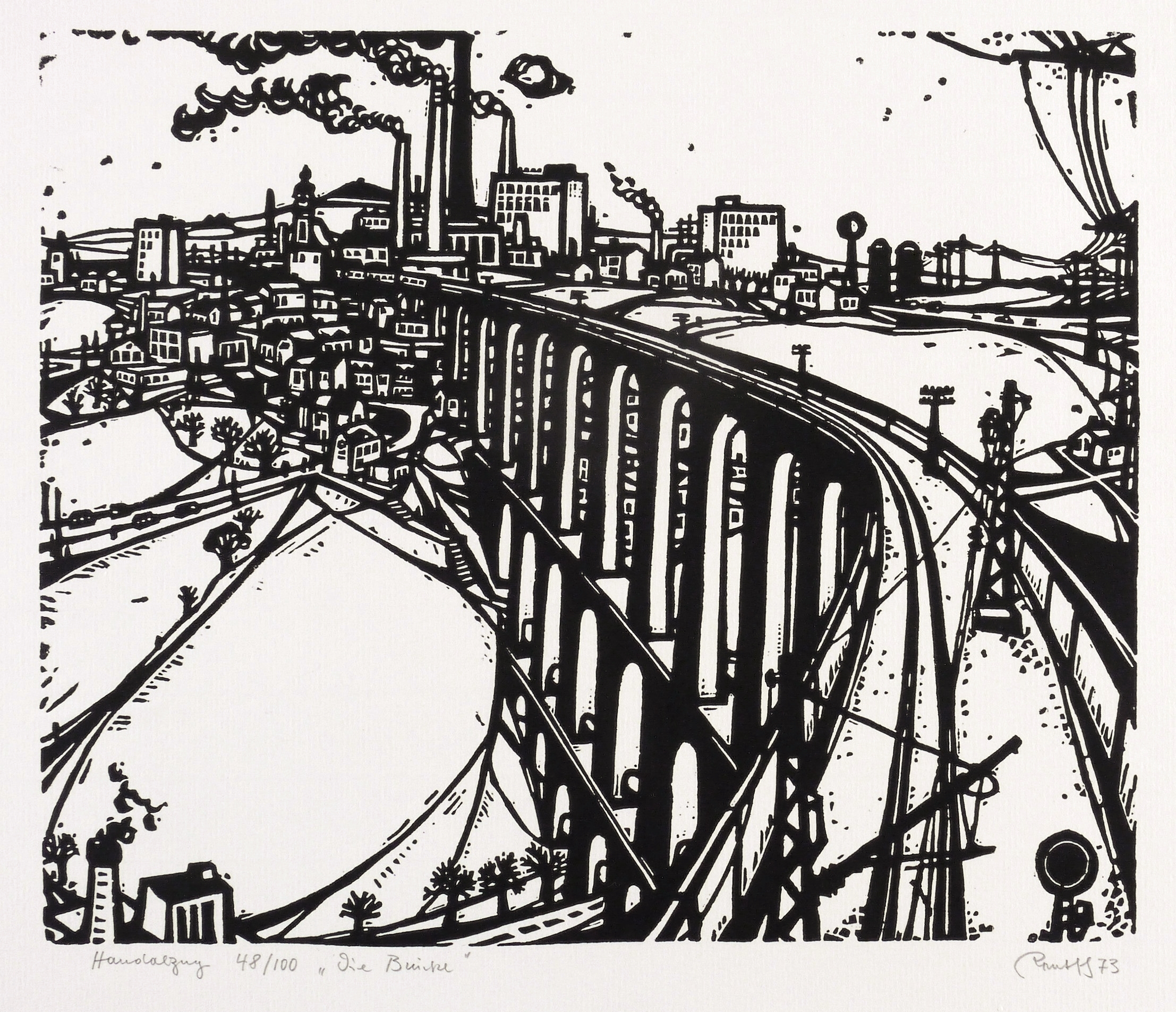 Rechts unten in Bleistift signiert und datiert: ″Rentsch 73″. Links Auflagenbezeichnung und Titel: ″48/100 // Die Brücke″. Dazu bezeichnet: ″Handdruck″. – Eigenhändiger Handabzug des Künstlers. – Der untere Blattrand links leicht bestoßen. Sonst shr guter Zustand.