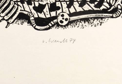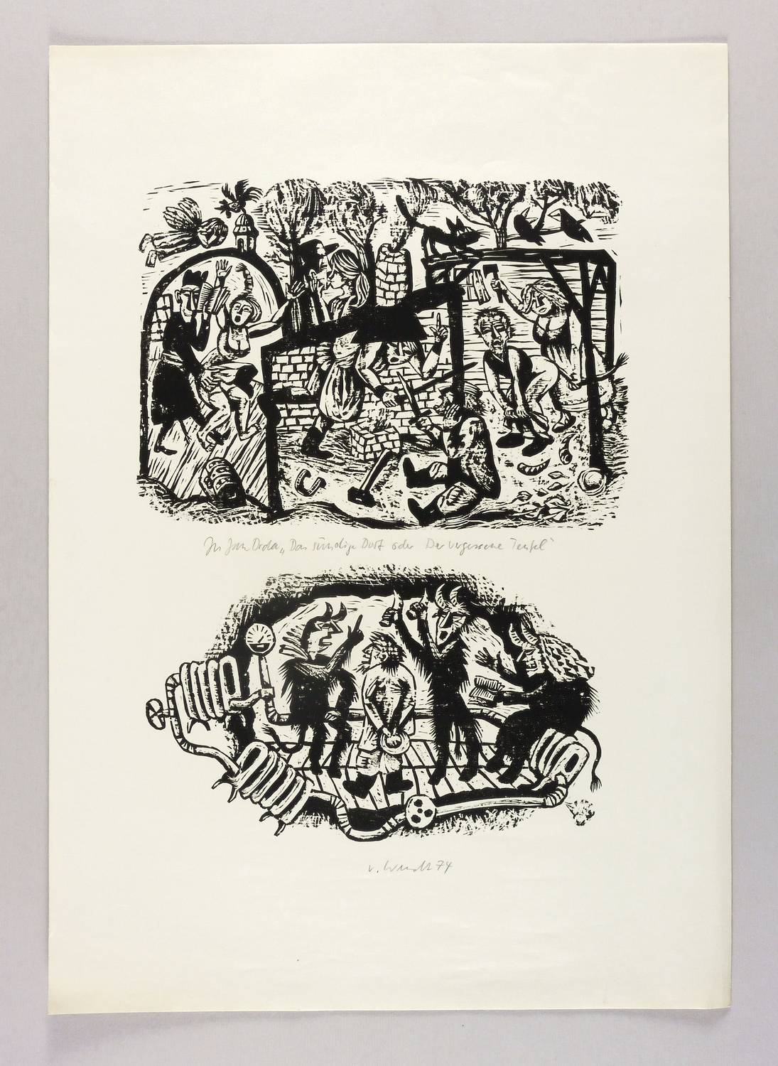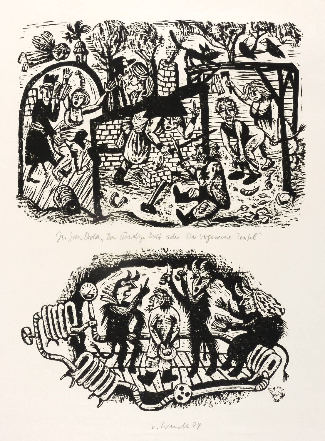 Unterhalb in Bleistift signiert und datiert: ″V. Wendt 74″. Oben Titel: ″zu Jan Drda 'Das sündige Dorf oder Der vergessene Teufel'″. – Sehr guter Zustand.