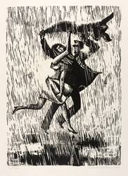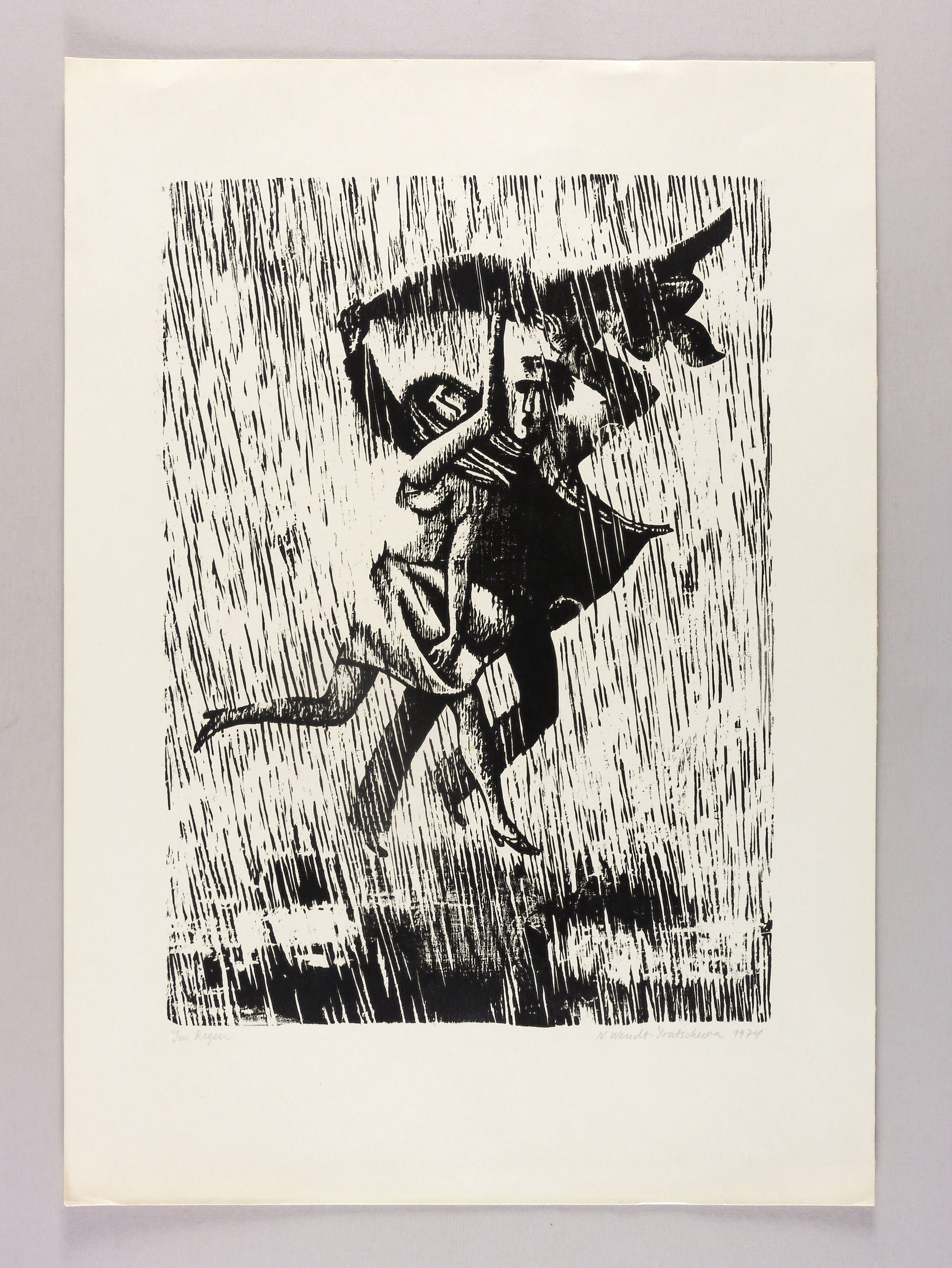 Rechts unten in Bleistift signiert und datiert: ″N. Wendt-Jontschewa 1974″. Links Titel: ″Im Regen″. Verso Stempel der Plauener Grafikgemeinschaft. – Sehr guter Zustand.