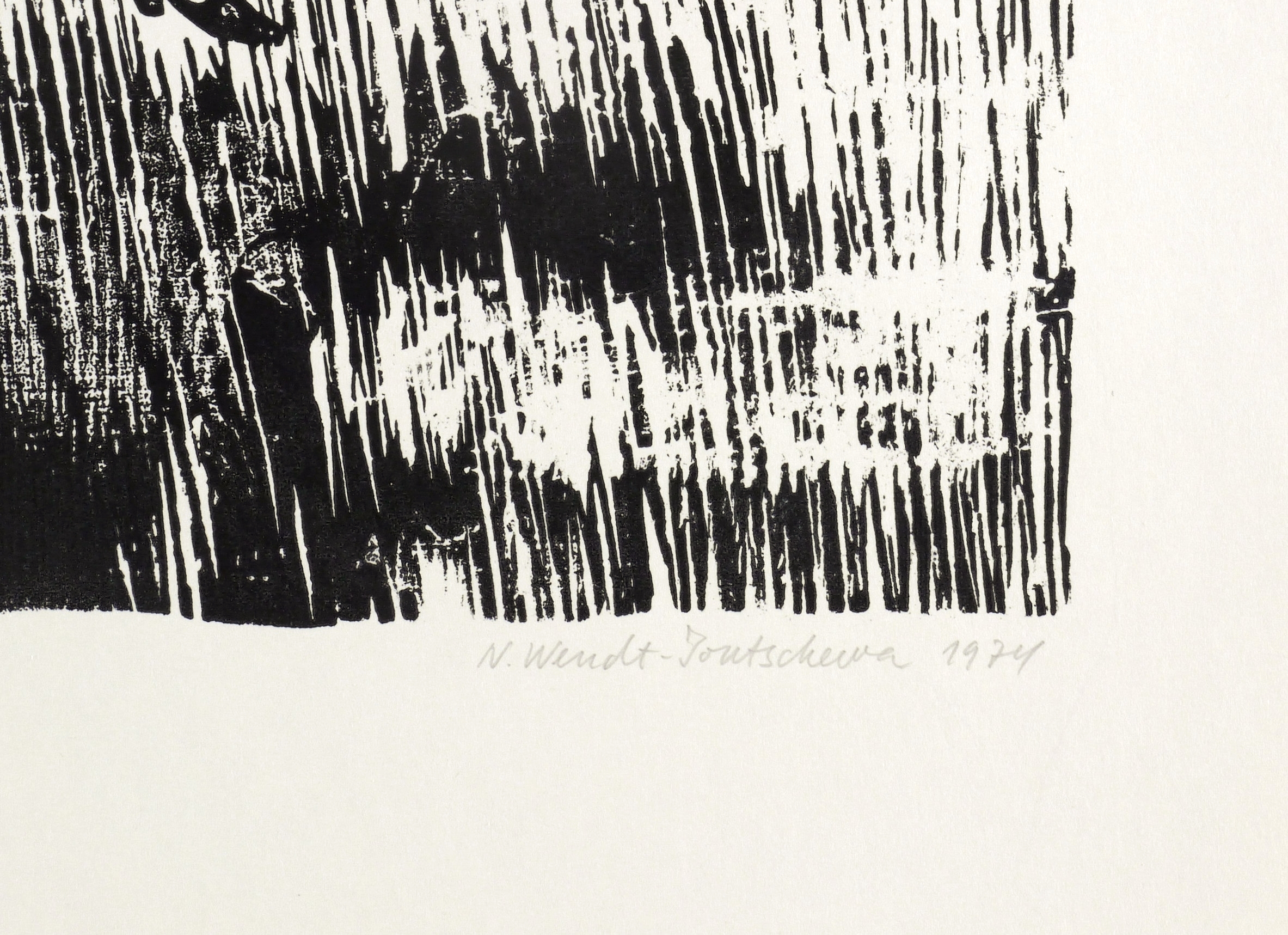 1974. Holzschnitt, in Schwarz, auf glattem hellchamois Velin. – Originale Künstlergrafik, von Newena Wendt-Jontschewa. – 44,4 x 31,8 cm (Darstellung / Druckbild), 60 x 43 cm (Blatt).