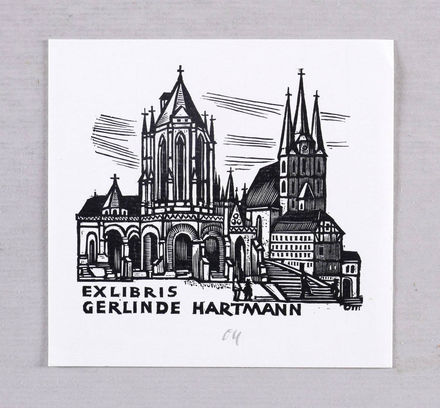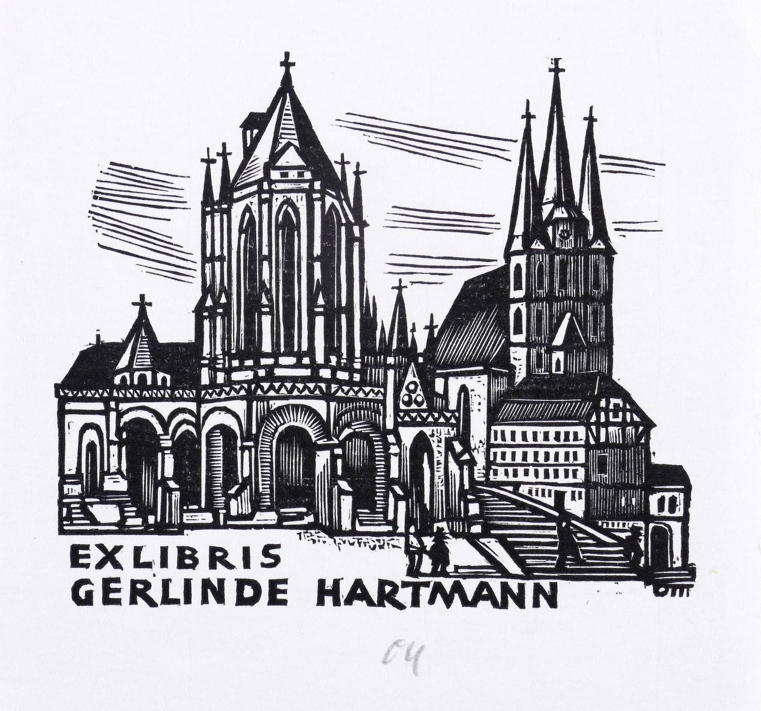 Unterhalb in Bleistift signiert: ″Ott″. Im Druckstock geschnittene Inschrift und Signatur: ″EXLIBRIS GERLINDE HARTMANN // OTT″. – Historisierende Stadtansicht von Erfurt mit dem Dom und der Serverikirche. – Ohne Mängel. Sehr guter Zustand.