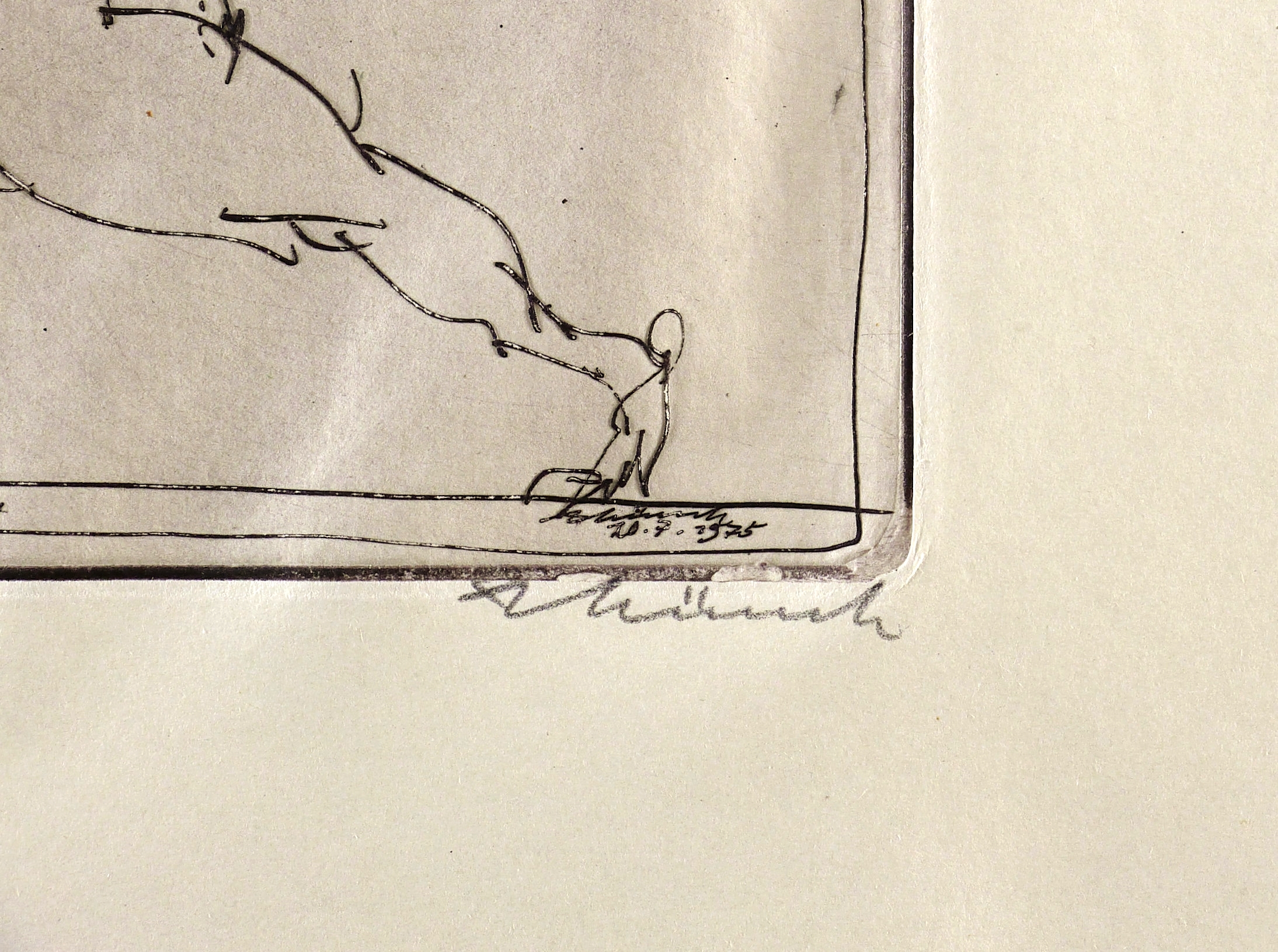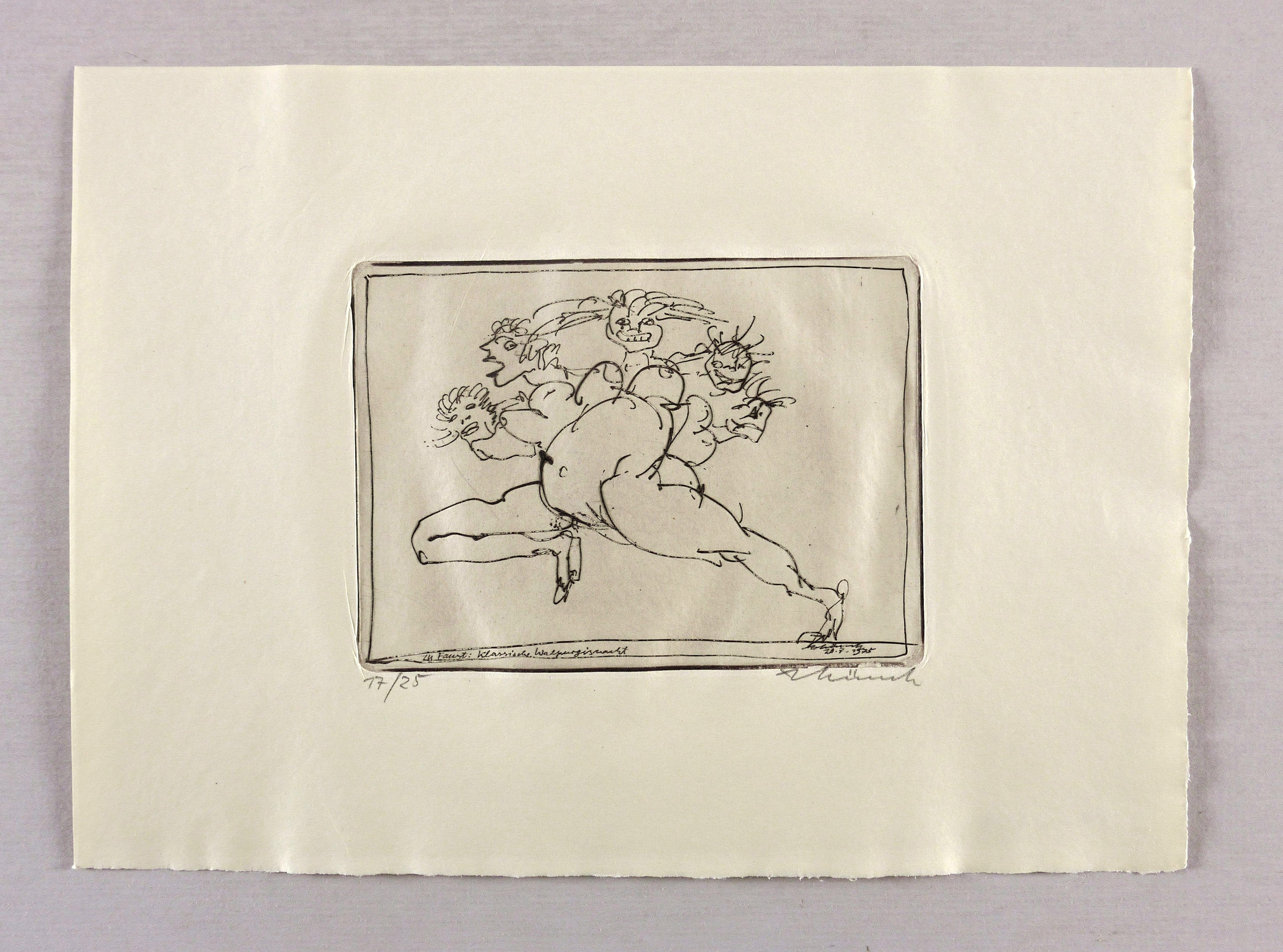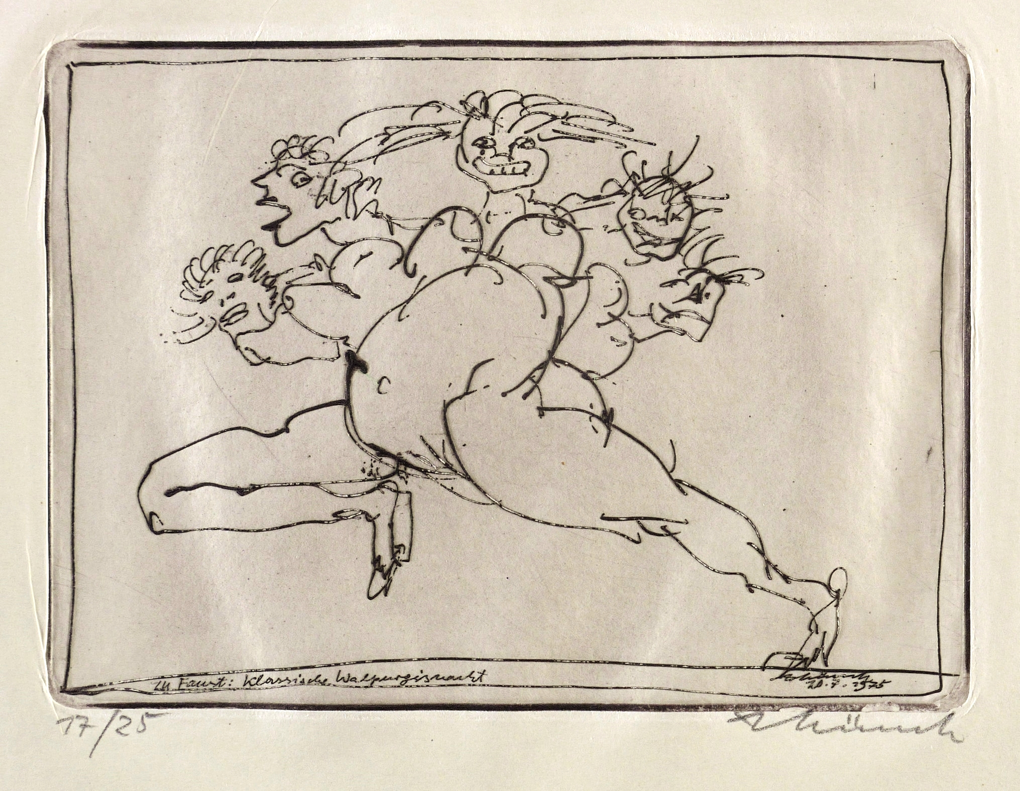 Rechts unten in Bleistift signiert: ″AMünch″. Links Auflagenbezeichnung: ″17/25″. In der Platte rechts unten zusätzlich Signatur und Datum: ″Münch 20.7.1975″. Links Inschrift: ″zu Faust: Klassische Walpurgisnacht″. – Tadellos. Sehr guter Zustand.