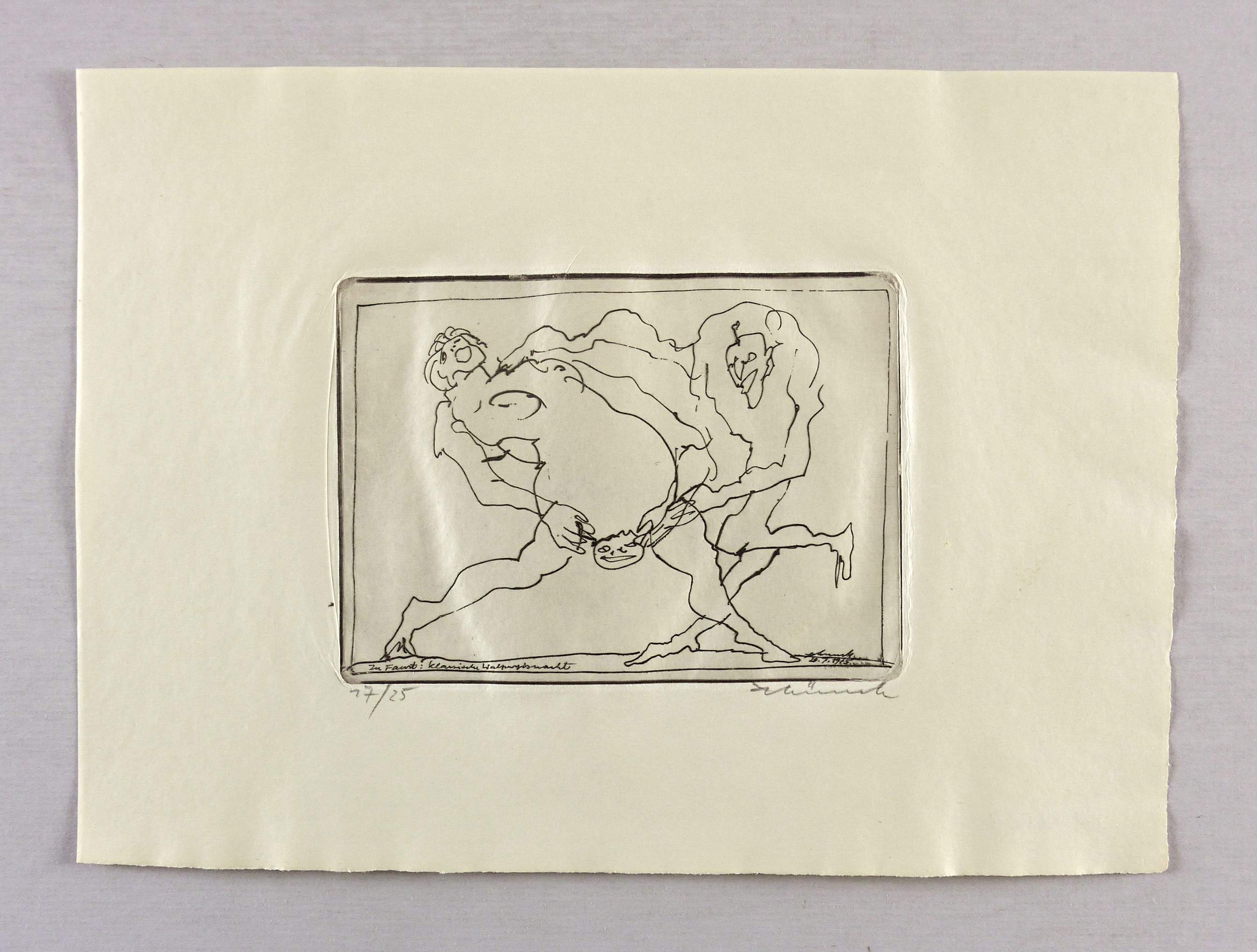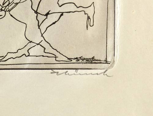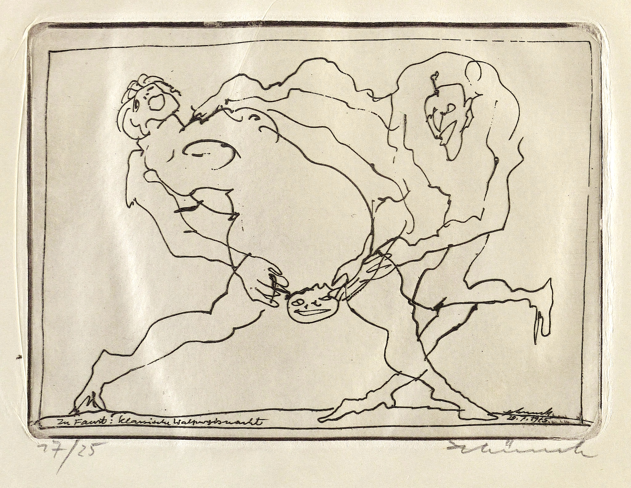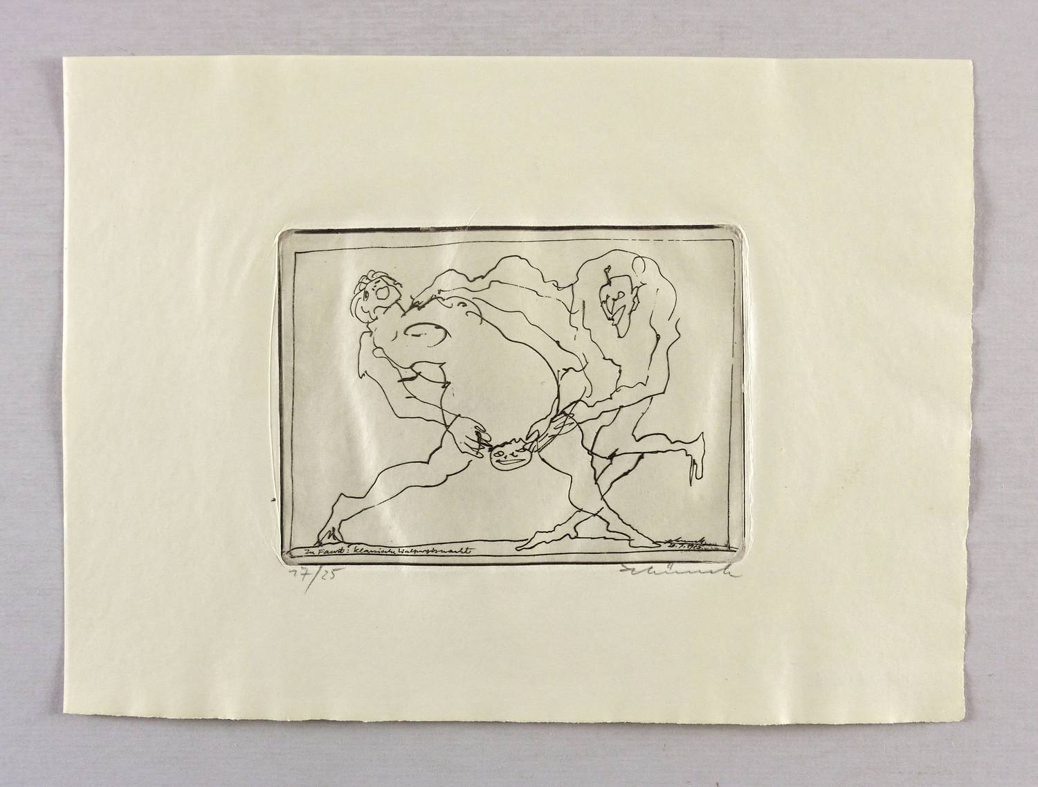 Rechts unten in Bleistift signiert: ″AMünch″. Links Auflagenbezeichnung: ″17/25″. In der Platte rechts unten zusätzlich Signatur und Datum: ″Münch 20.7.1975″. Links Inschrift: ″zu Faust: Klassische Walpurgisnacht″. – Tadellos. Sehr guter Zustand.