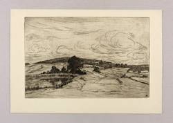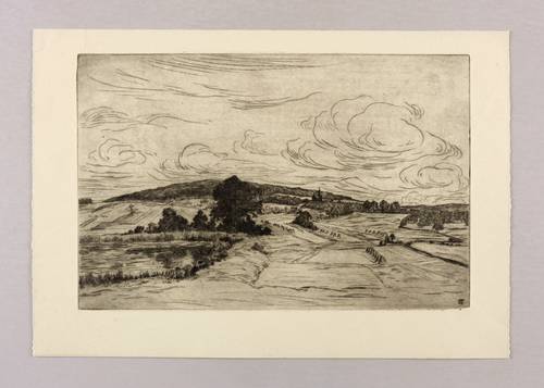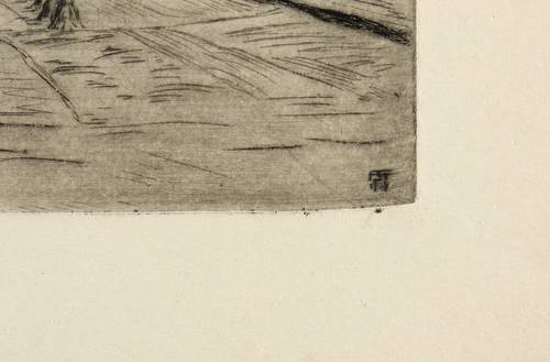 1919. Radierung / Strichätzung, mit Plattenton, in Schwarz, auf gelbem Velin. – Originale Künstlergrafik, von Ferdinand Steiniger. – 19,8 x 30,3 cm (Darstellung / Platte), 26 x 37 cm (Blatt).