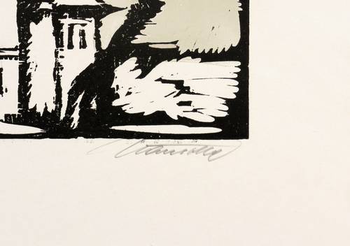 1972. Farblinolschnitt, in Beige & Schwarz, auf glattem hellchamois Velin. – Originale Künstlergrafik, von Horst Hausotte. – 15,3 x 25,3 cm (Darstellung / Druckbild), 31 x 37 cm (Blatt).