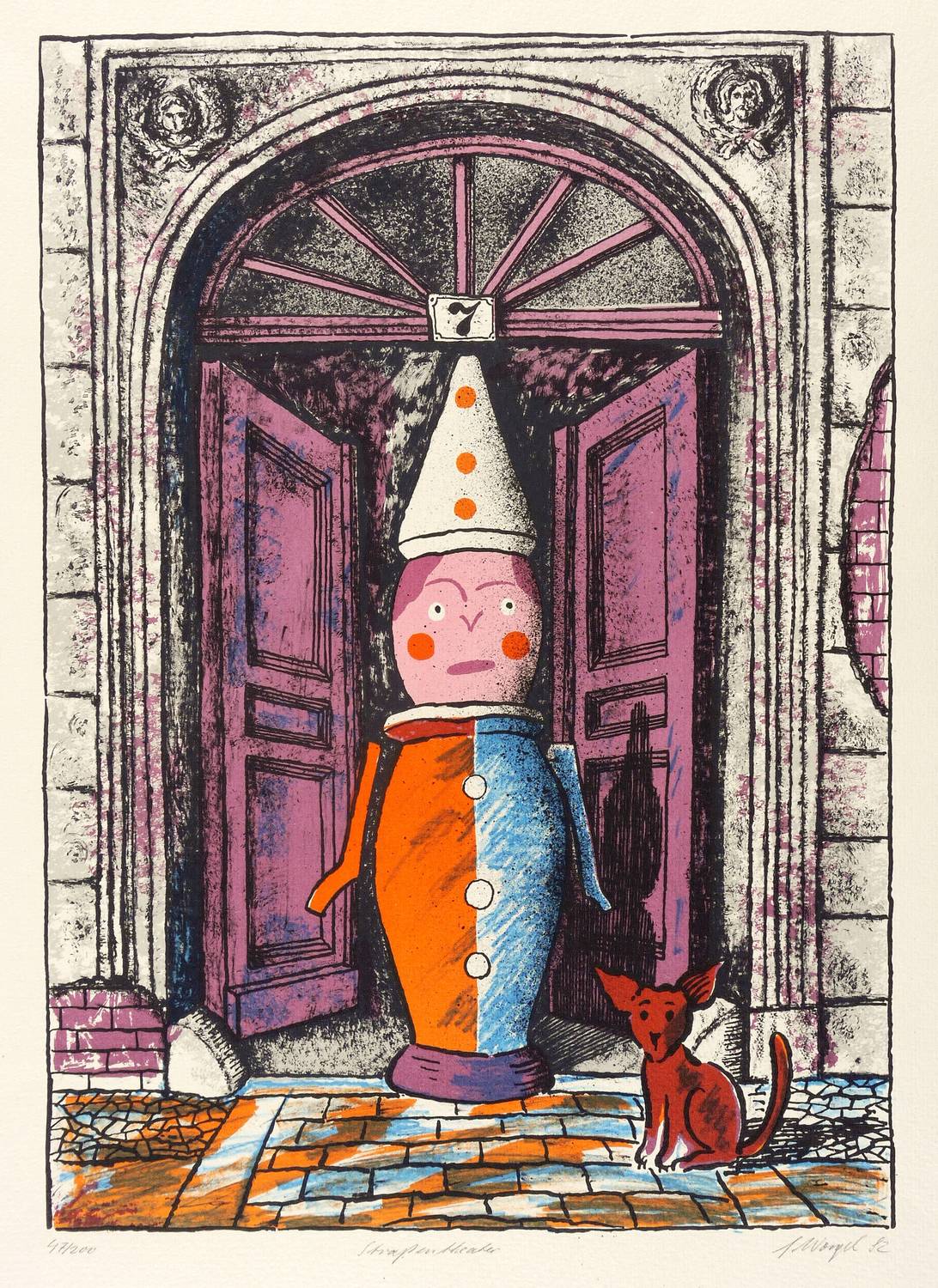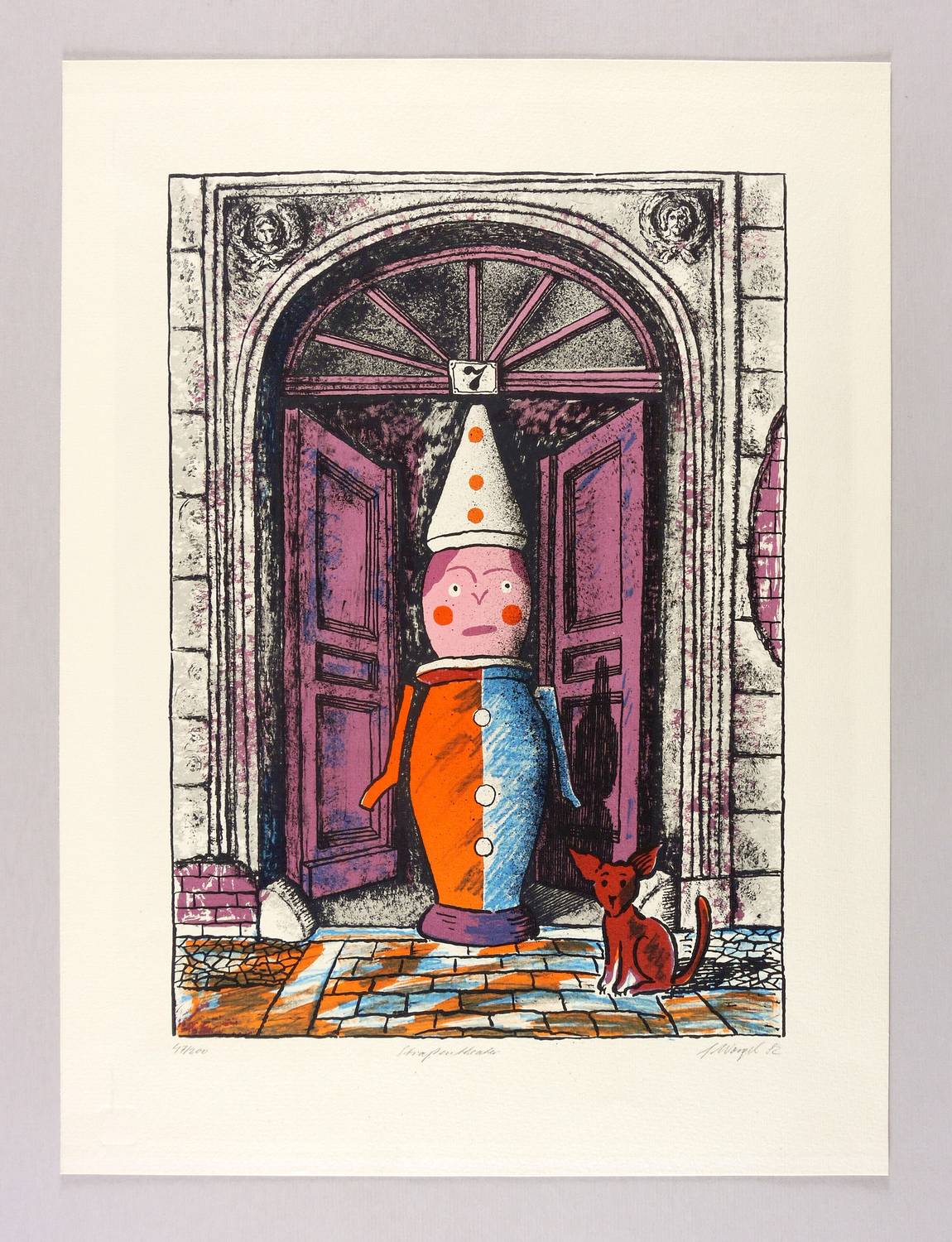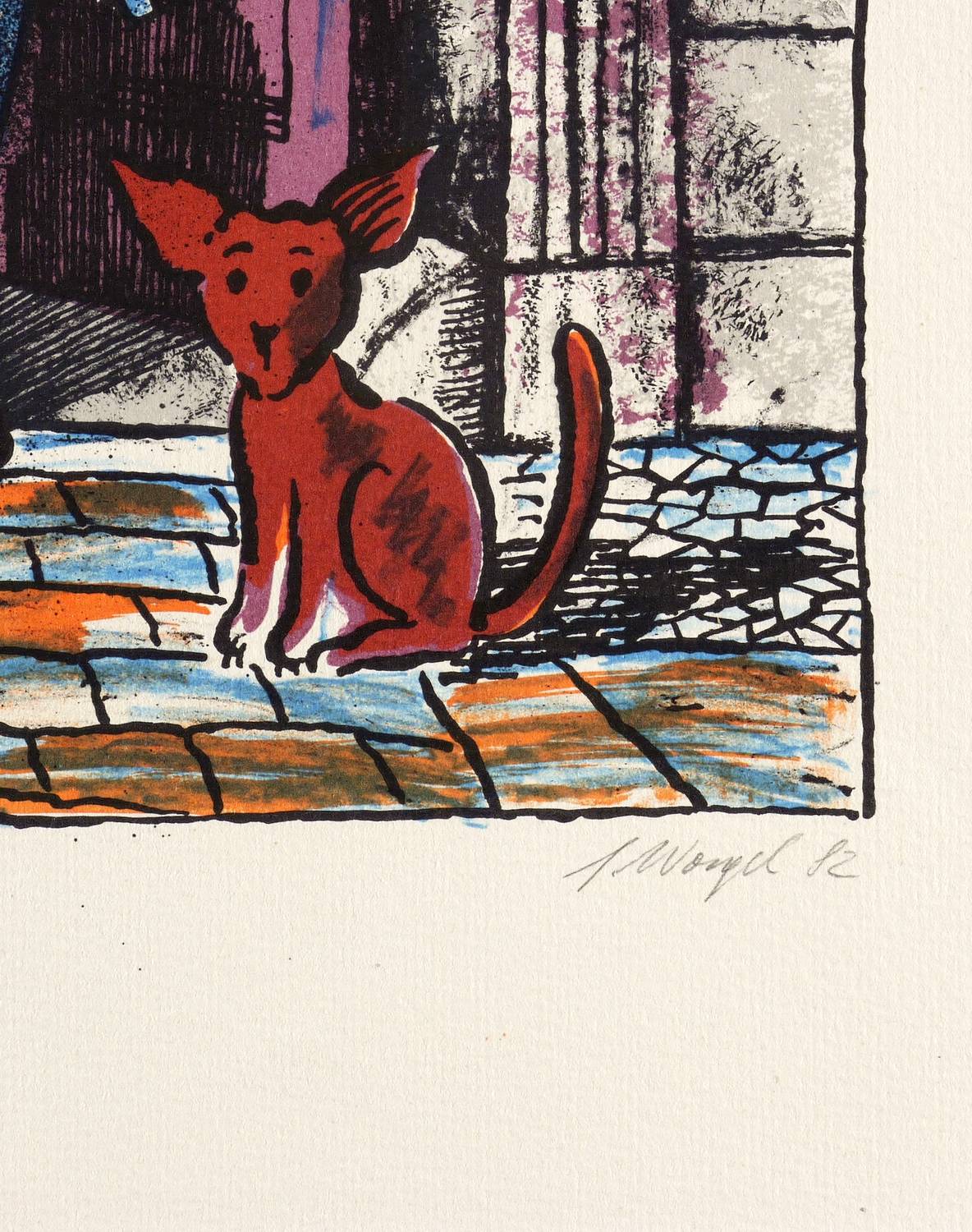 Rechts unten in Bleistift unleserlich signiert und datiert: ″[Schorgel?] 82″. Links Auflagenbezeichnung: ″47/200″. Mittig Titel: ″Straßentheater″. Trockenstempel der Grafik-Edition des Staatlichen Kunsthandels der DDR. – Edition des Staatlichen Kunsthandels zur IX. Kunstausstellung der DDR in Dresden 1982/1983. – Sehr guter Zustand.