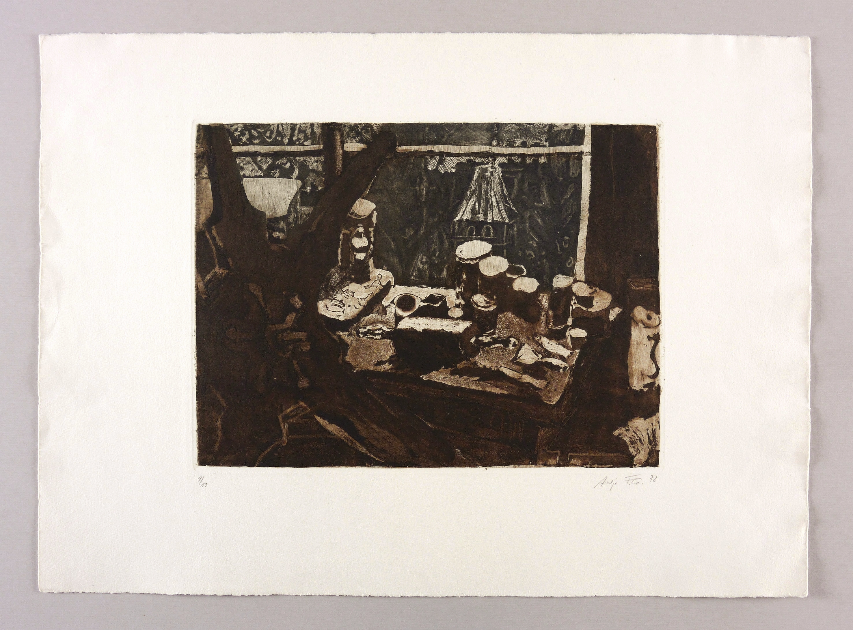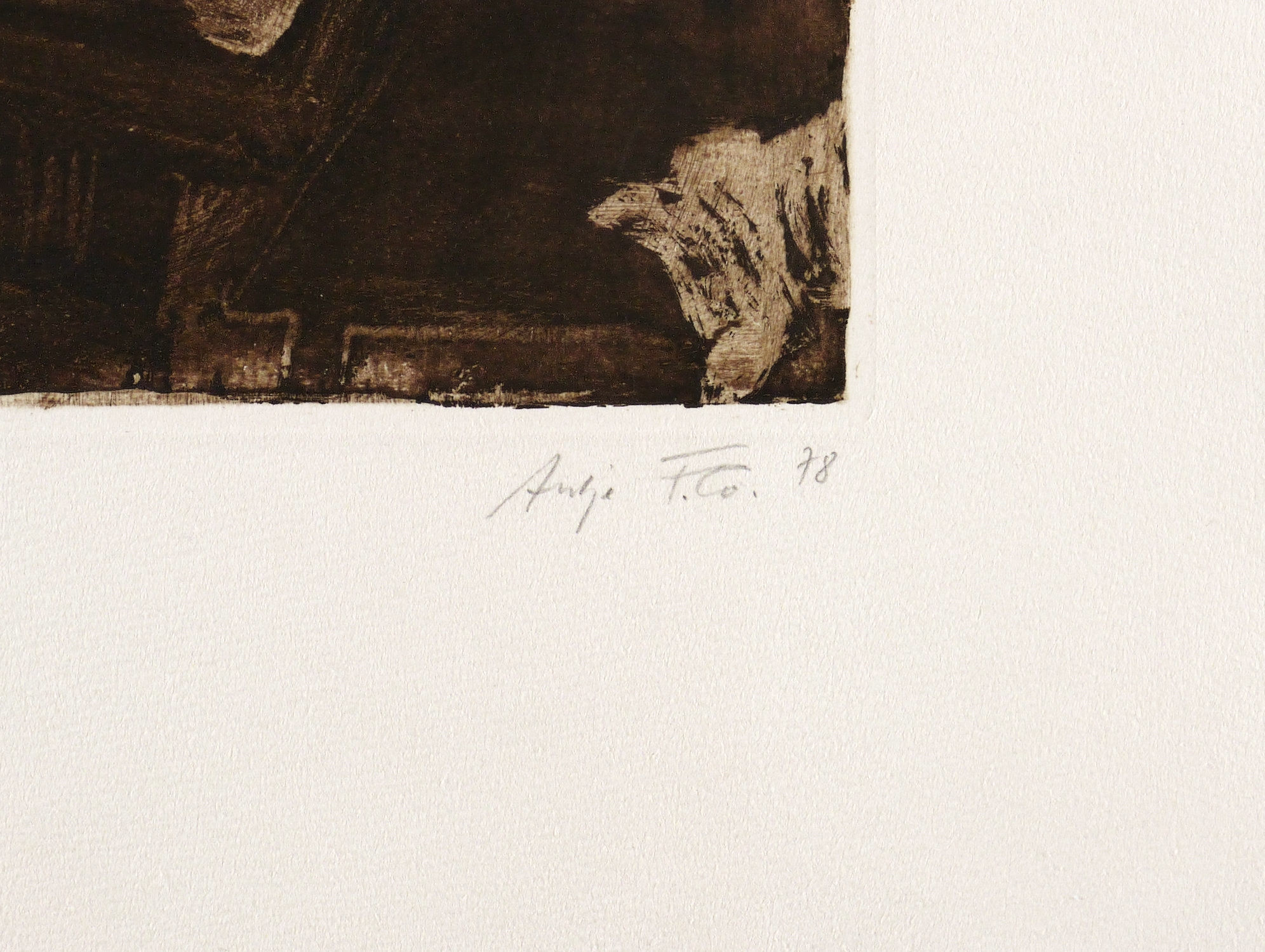 Rechts unten in Bleistift signiert und datiert: ″Antje F.-Co. 78″. Links Auflagenbezeichnung: ″1/13″. Verso Titel: ″Druckerei-Stilleben″. – Sehr guter Zustand.