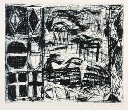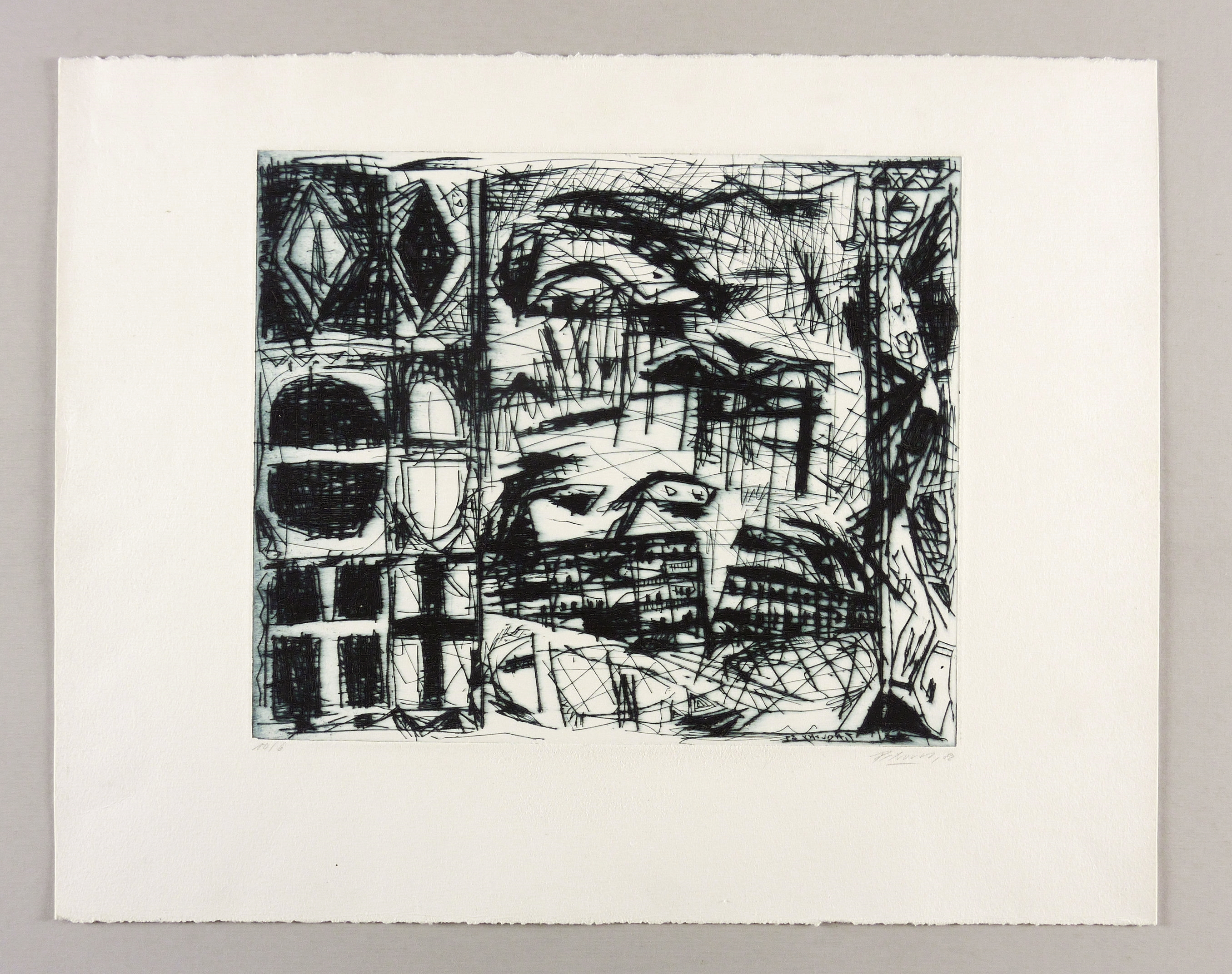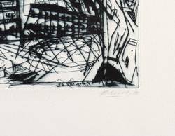 1982. Radierung / Kaltnadel, in Schwarzblau, auf kräftigem weißlichem Velin. – Originale Künstlergrafik, von Wolfgang Petrovsky. – Auflage Exemplar Nr. 6/10. – 27,1 x 32,2 cm (Darstellung / Platte), 40 x 51 cm (Blatt).