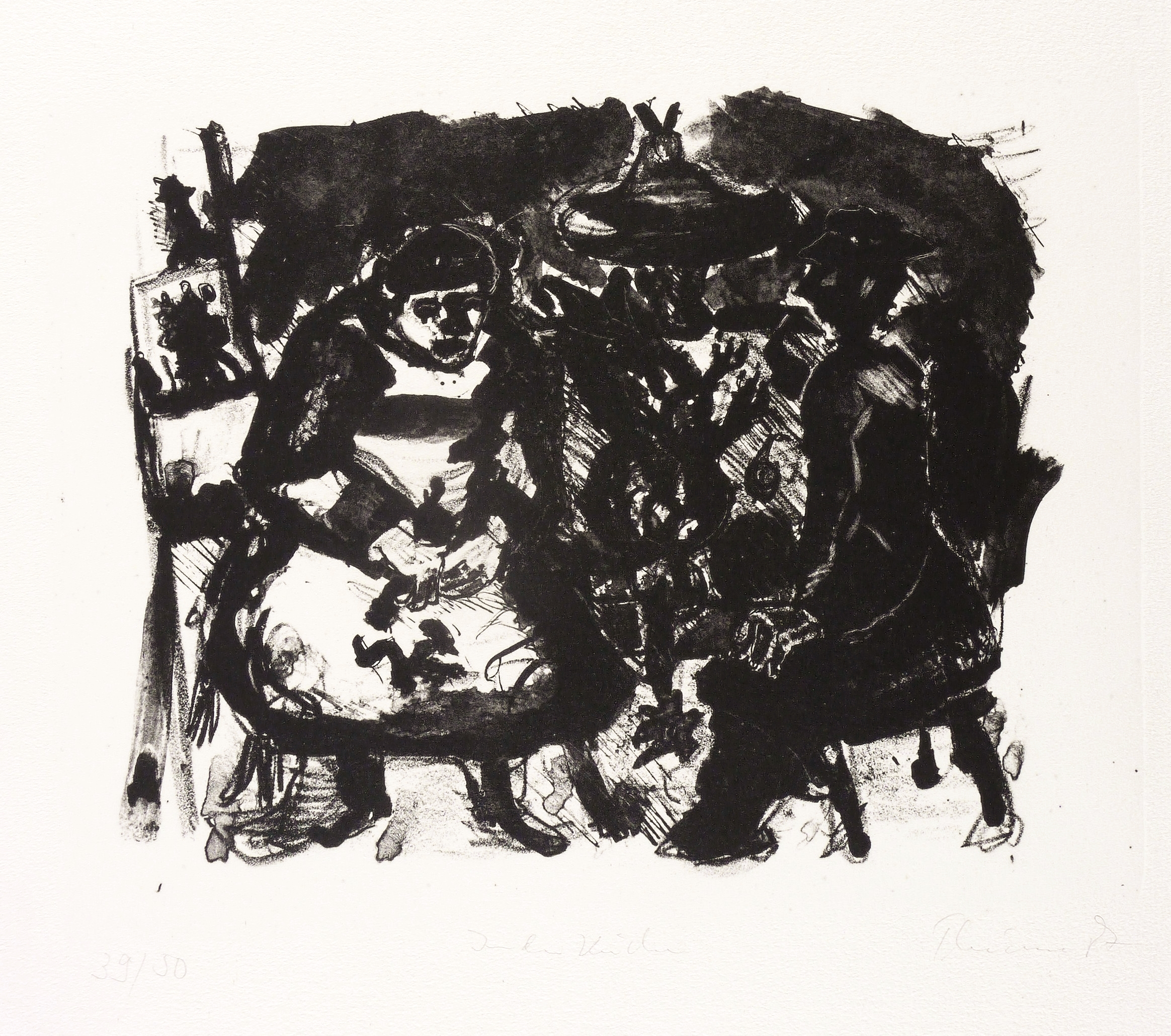 1997. Lithografie / Kreide- & Pinsellithografie, partiell geschabt, in Schwarz, auf hellchamois Hahnemühle. – Originale Künstlergrafik, von Andreas Thieme. – Auflage Exemplar Nr. 39/50. – 22,5 x 27,2 cm (Darstellung / Druckbild), 54 x 40 cm (Blatt).