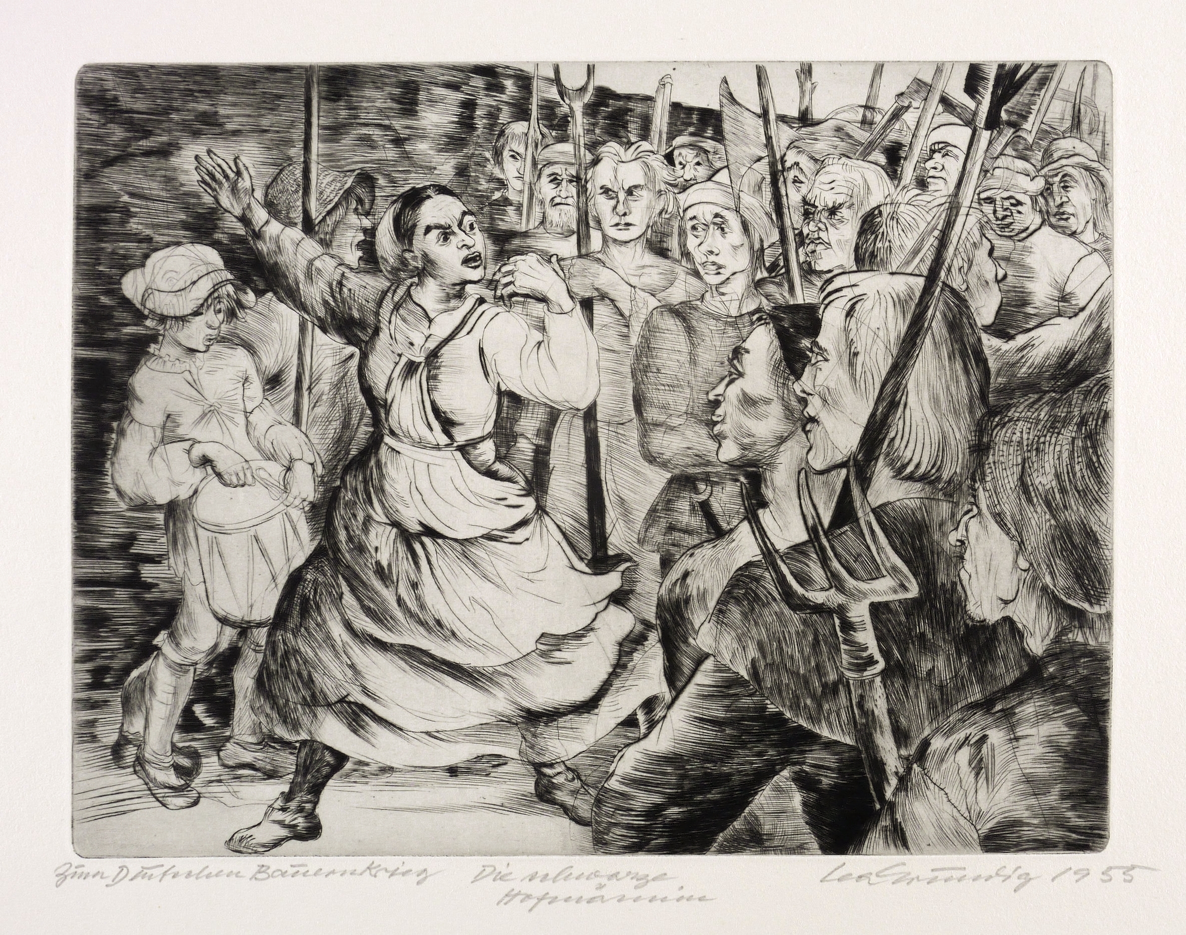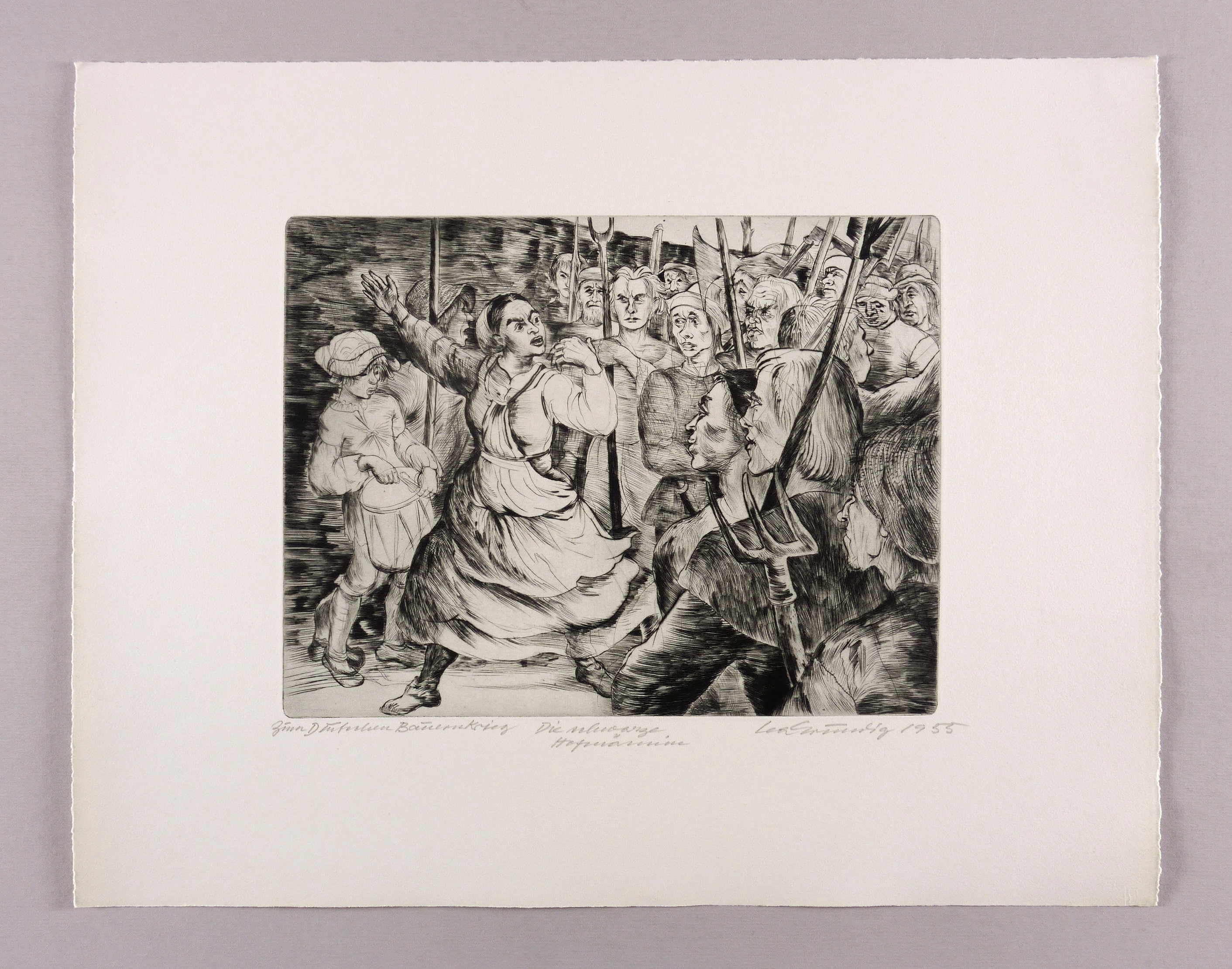 Rose 125. – Rechts unten in Bleistift signiert und datiert. ″Lea Grundig 1955 [sic!]″. Links Titel: ″Zum Deutschen Bauernkrieg / Die schwarze Hofmännin″. – Blatt Nr. 8 aus der Radier-Folge ″Zum Deutschen Bauernkrieg″. – Die Figur der ″Hofmännin″ als verstecktes Porträt der Hilde Benjamin, seit 1953 Minister für Justiz der DDR und verantwortlich für politische Schauprozesse und Todesurteile. – Provenienz: Sammlung Gerlint Söder und Erhard Frommhold, Dresden. – Originalrandiges unbeschnittenes Exemplar. Sehr guter Zustand.