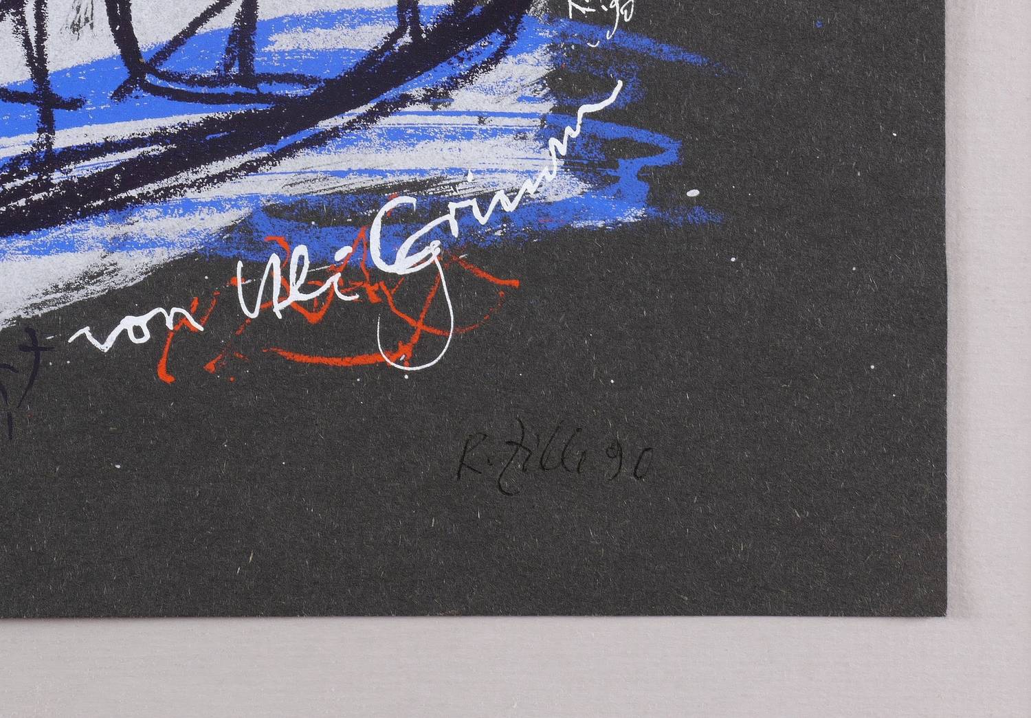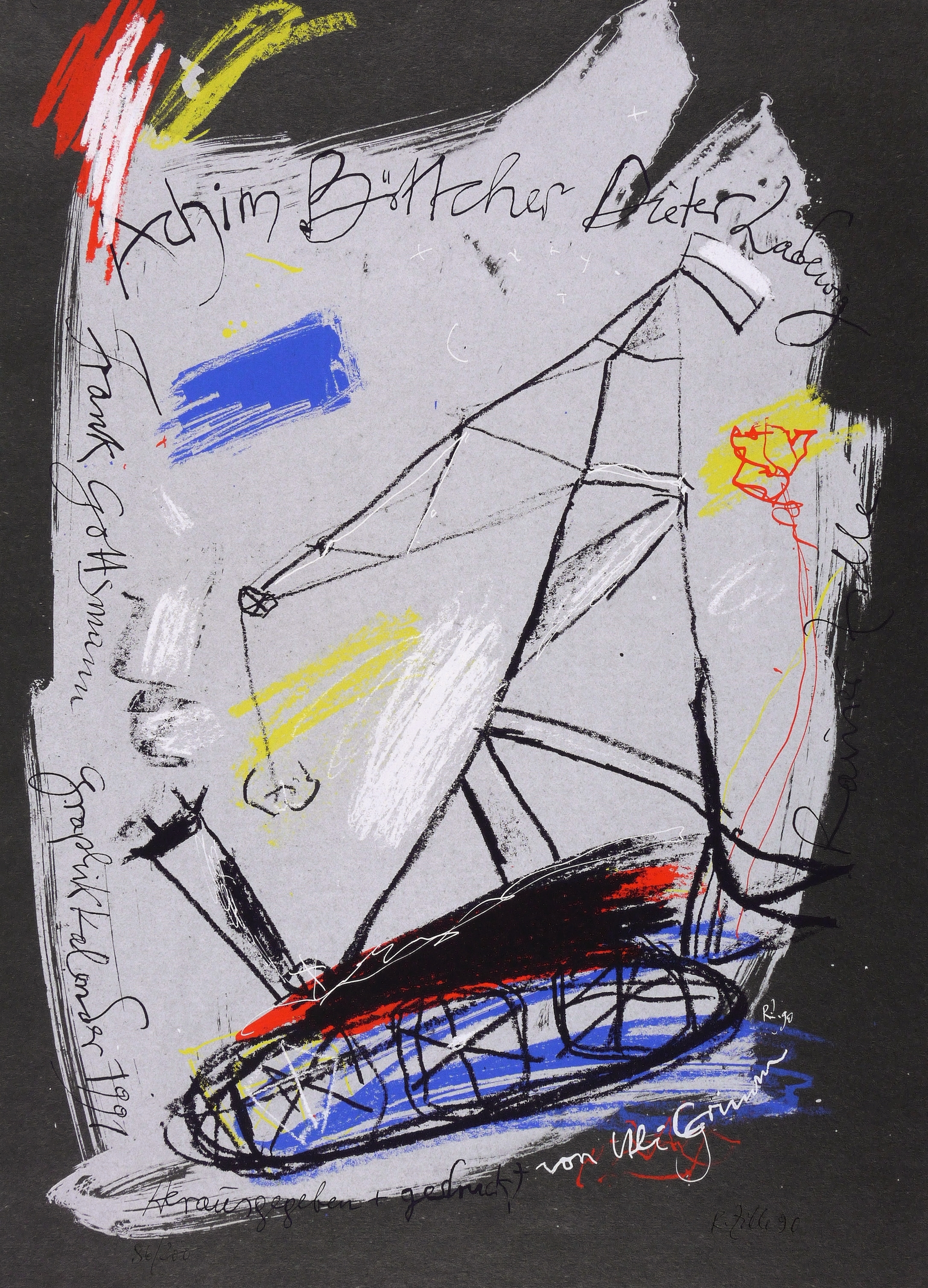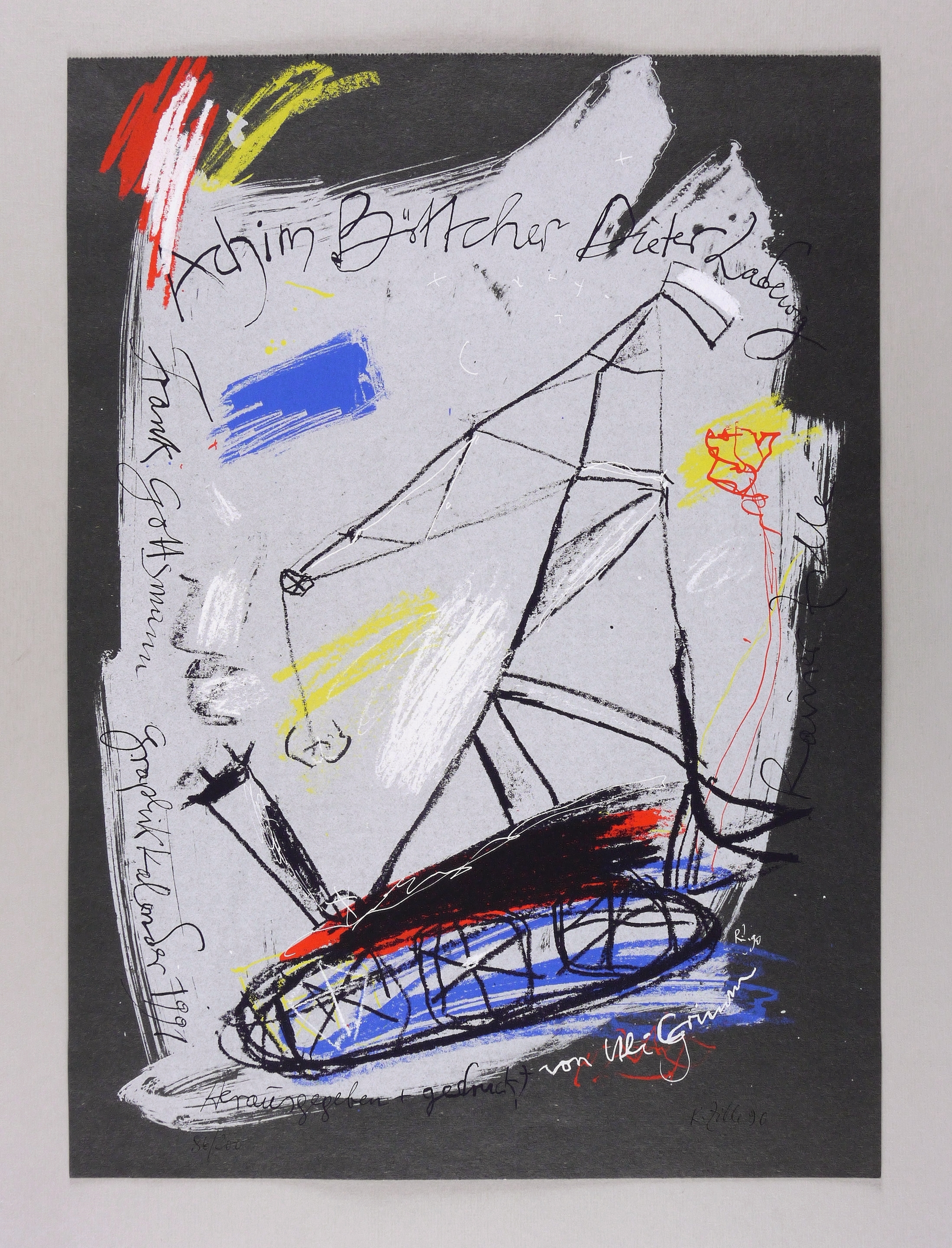 Links unten in Kugelschreiber signiert und datiert: ″R. Zille 90″. Links Auflagenbezeichnung: ″86/200″. Diverse Inschriften. – Originalgrafisches Deckblatt für den Grafikkalender 1990 der Künstler: Achim Böttcher, Dieter Ladewig und Frank Gottsmann. – Tadellos. Sehr guter Zustand.