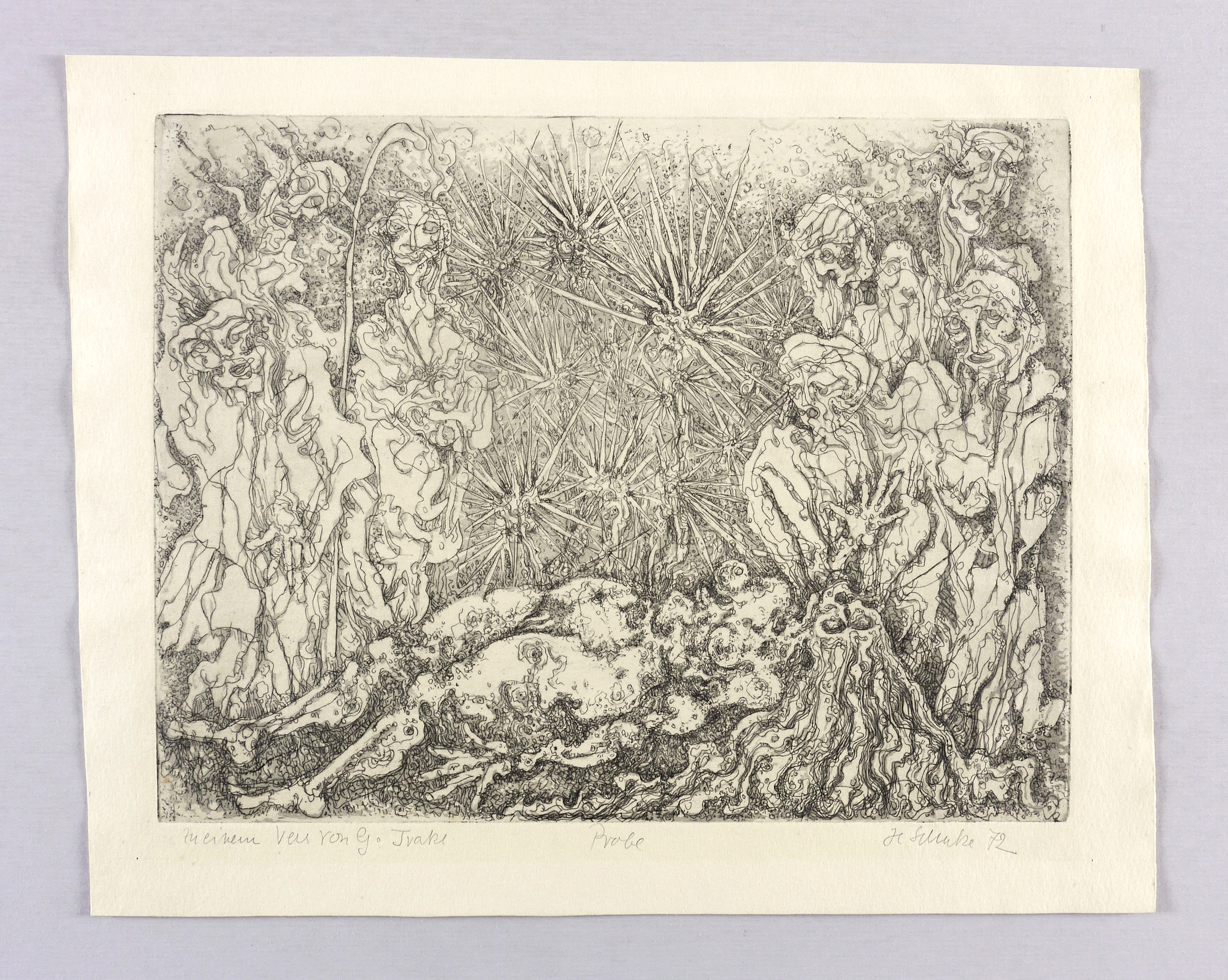 Rechts unten in Bleistift signiert und datiert: ″H. Schulze 72″. Mittig Auflagenbezeichnung: ″Probe″. Links Titel: ″Zu einem Vers von G. Trakl″. – Sehr guter Zustand.