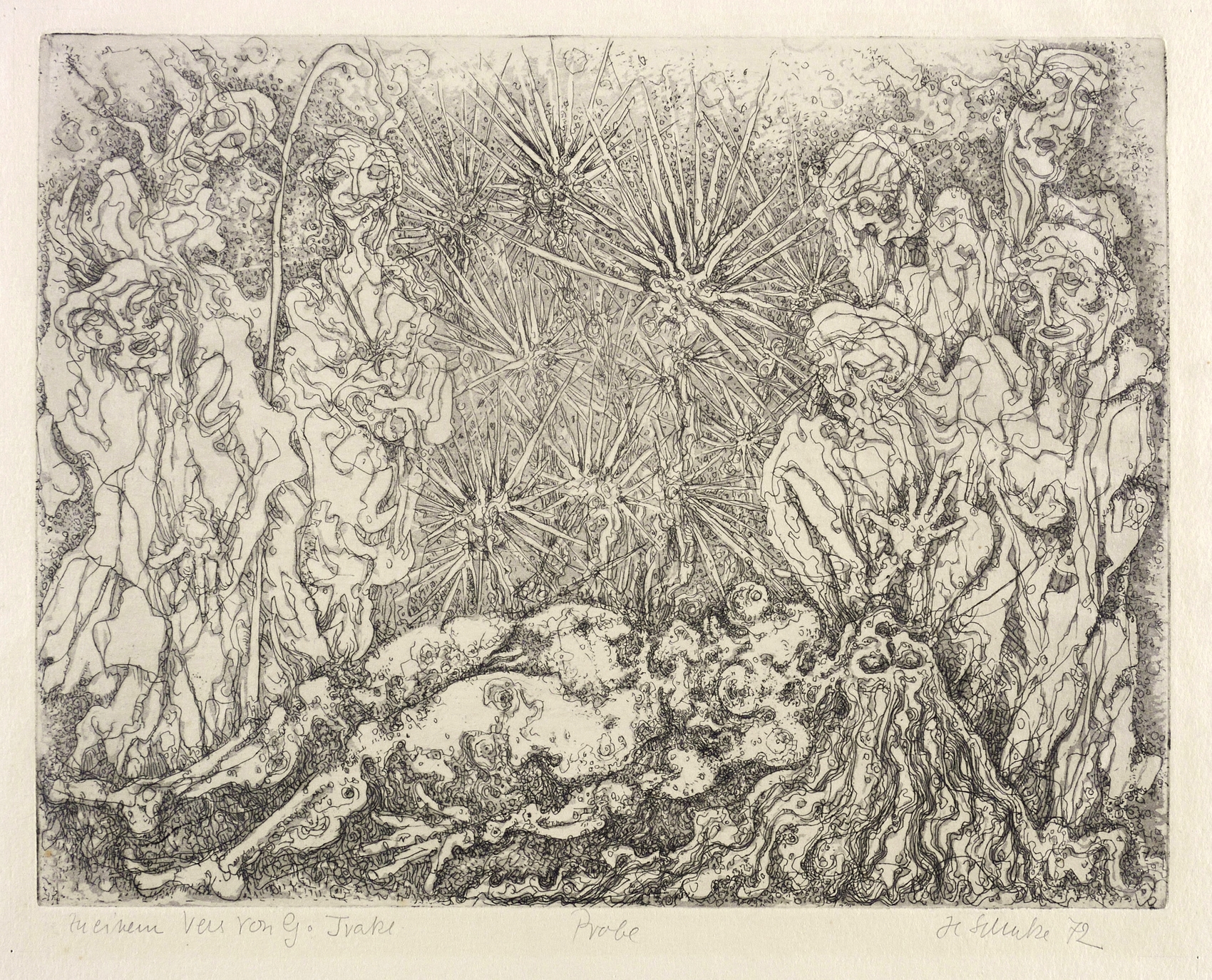 1972. Radierung / Aquatinta & Strichätzung, in Schwarz, auf chamois Velinkarton. – Originale Künstlergrafik, von Hans Schulze. – Probedruck. – 24,2 x 31,3 cm (Darstellung / Druckbild), 30 x 37 cm (Blatt).