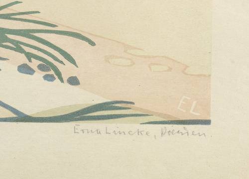 Rechts unten in Bleistift signiert: ″Erna Lincke, Dresden″. Links Technikbezeichnung: ″Farbiger Holzschnitt″. Im Druckstock rechts unten geschnittenes Monogramm: ″EL″. – Sehr guter Zustand.