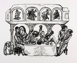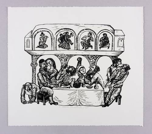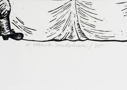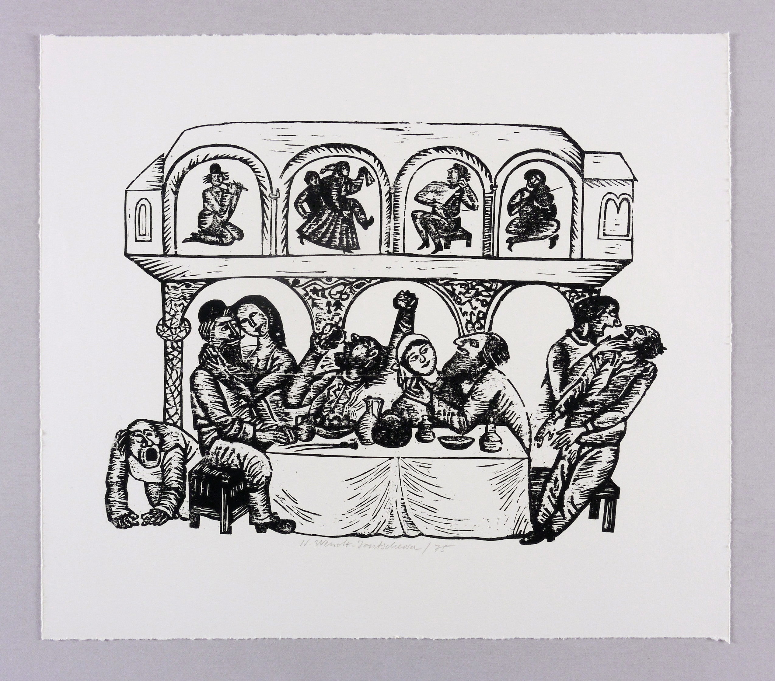 1975. Holzschnitt, in Schwarz, auf hellchamois Velin. – Originale Künstlergrafik, von Newena Wendt-Jontschewa. – 24,3 x 32,5 cm (Darstellung / Druckbild), 35 x 40 cm (Blatt).