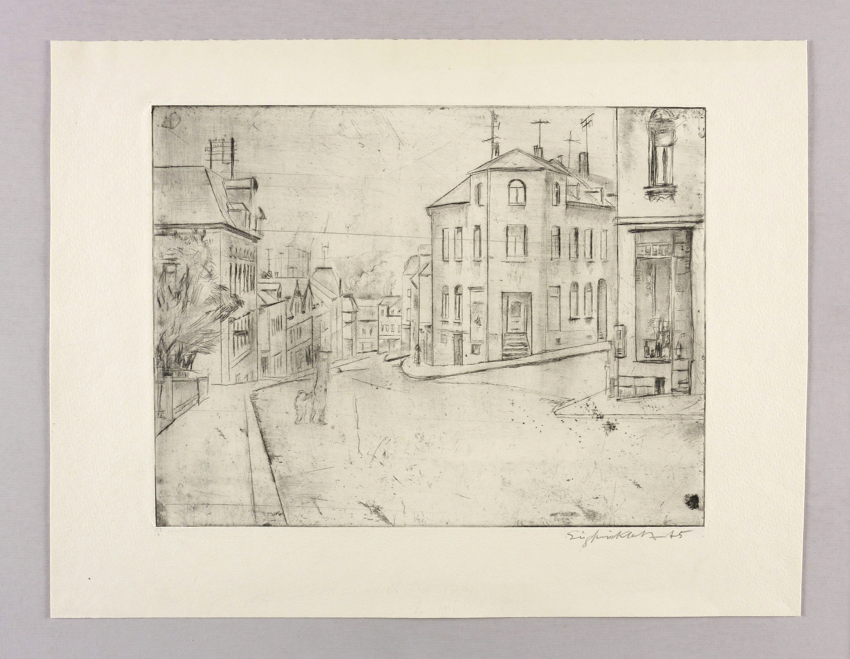 1972/1975. Radierung / Kaltnadel, mit Plattenton, in Schwarz, auf hartem chamois Weißenborn. – Originale Künstlergrafik, von Siegfried Klotz. – 24,7 x 32,3 cm (Darstellung / Platte), 34 x 45 cm (Blatt).