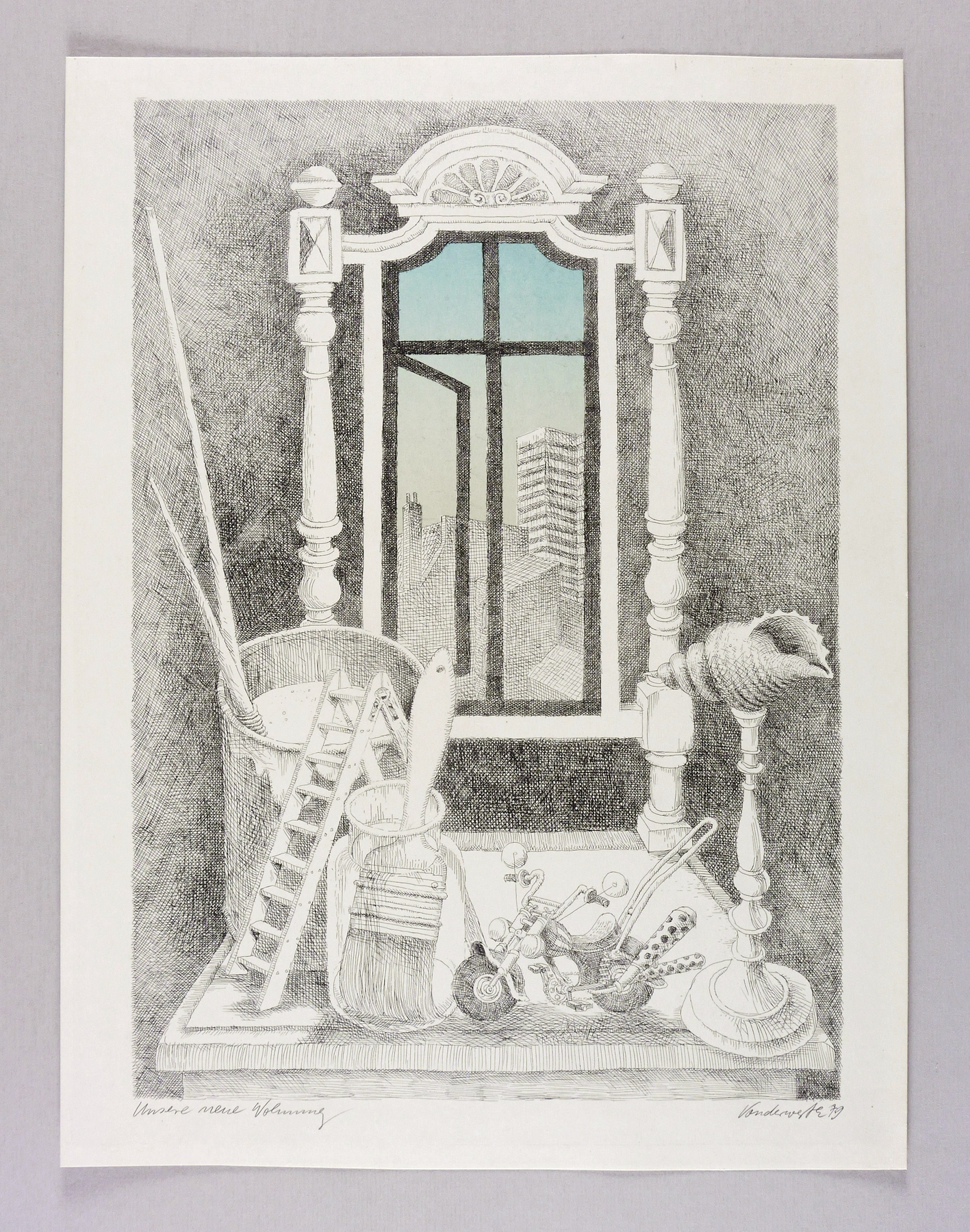 1979. Farblithografie / Feder- & Pinsellithografie, in 3 Farben, mit Iris-Druck, auf hellchamois Velinkarton. – Originale Künstlergrafik, von Klaus Vonderwerth. – 41,2 x 29,2 cm (Darstellung / Druckbild), 46 x 35 cm (Blatt).