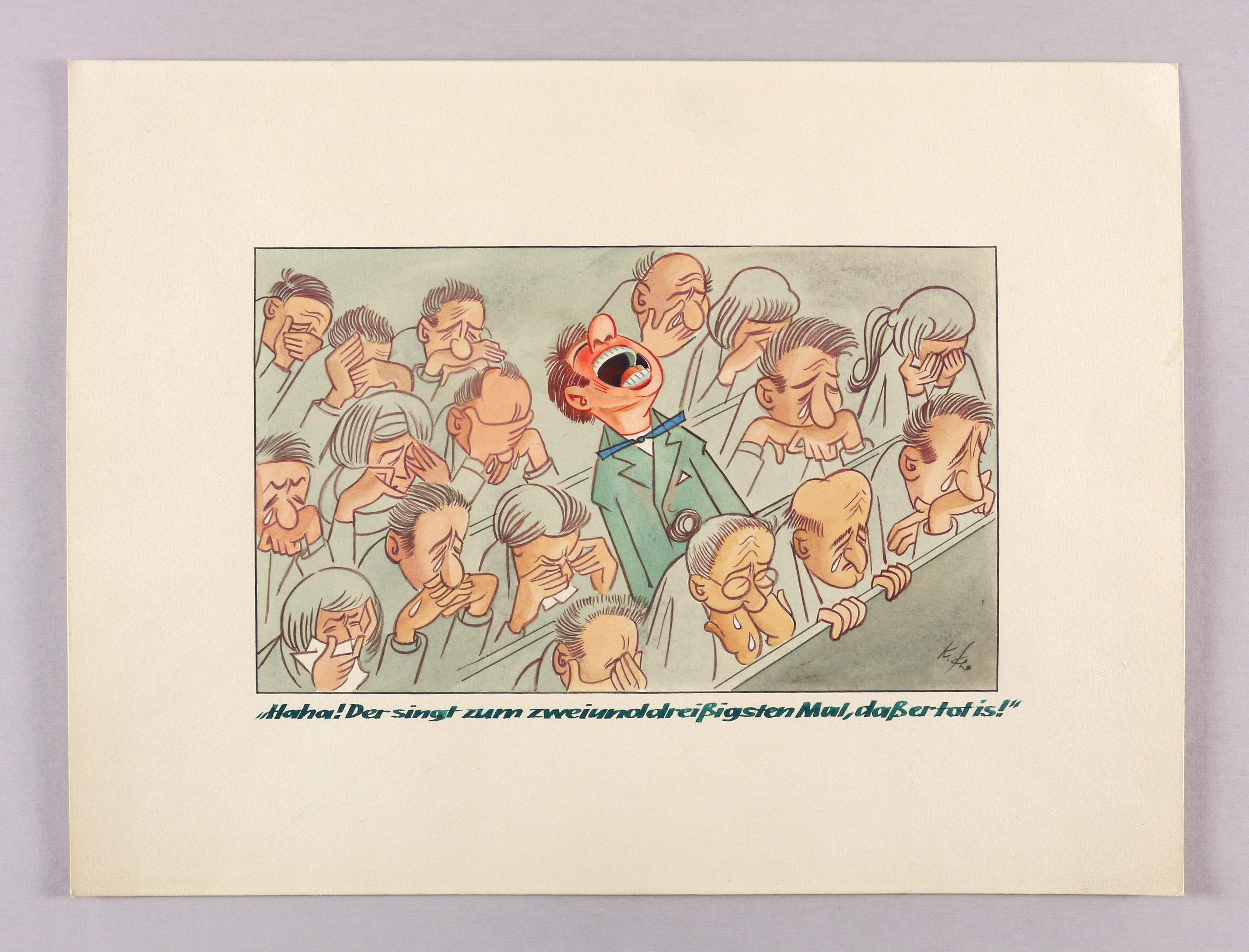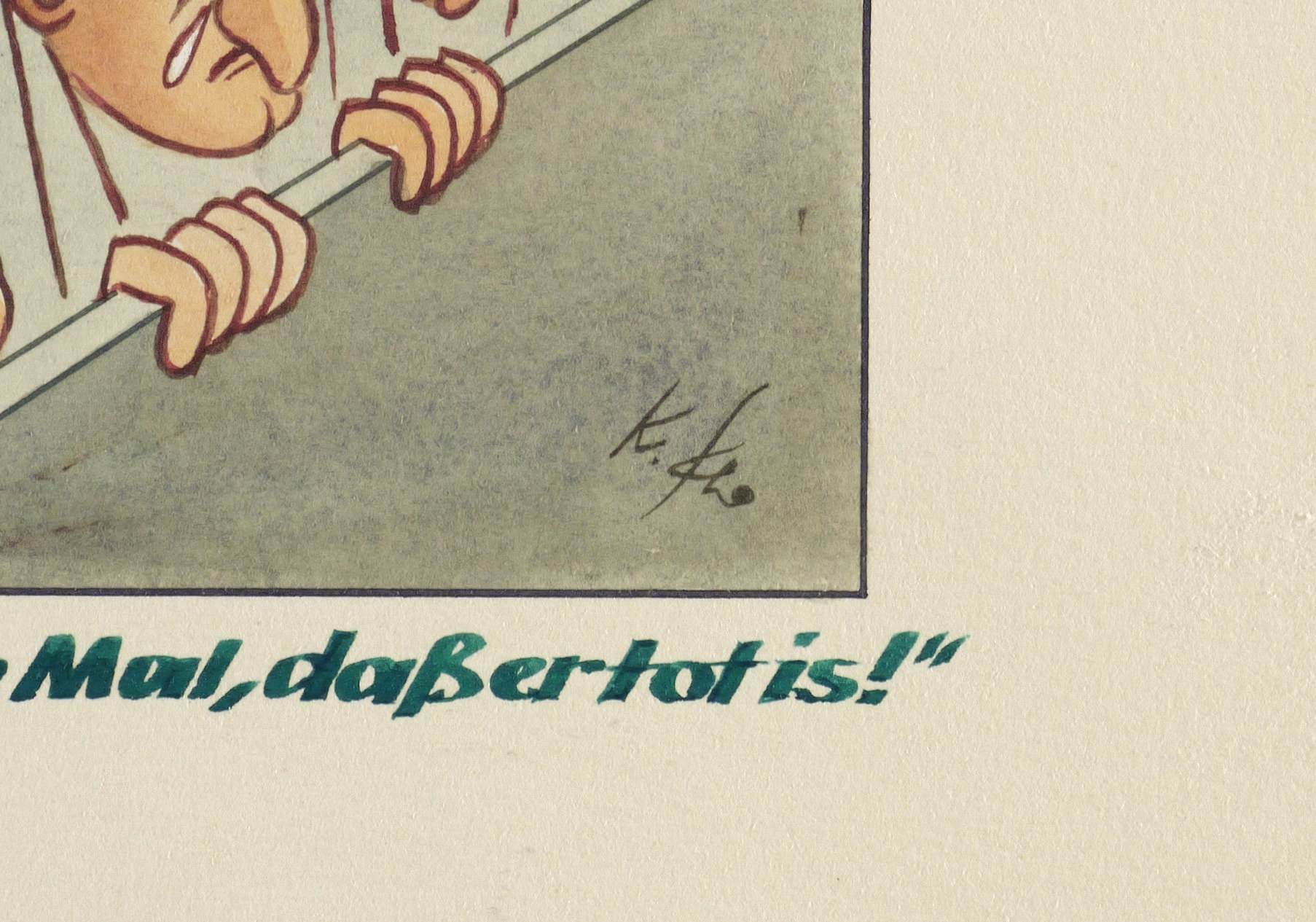 Links unten signiert: ″[K. Fho?]″. Unterhalb Inschrift: ″Haha! Der singt zum zweiunddreißigsten Mal, dass er tot is!″ – Sehr guter Zustand.