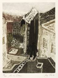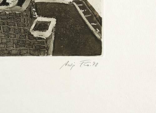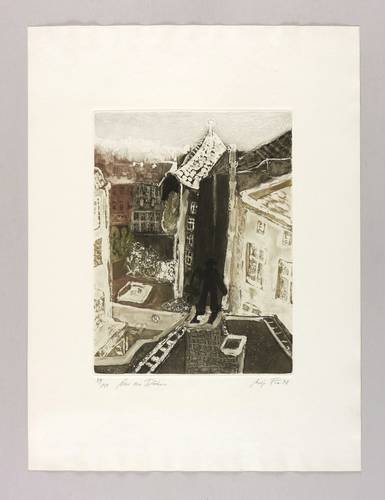 Rechts unten in Bleistift signiert und datiert: ″Antje F.-Co. 78″. Links Auflagenbezeichnung: ″81/150″. Dazu Titel: ″Über den Dächern″. – Beigabe: 4 Seiten aus der Zeitschrift ″Für Dich″ (17, 1979), mit einer Anzeige des Staatlichen Kunsthandels der DDR zur Edition dieser Farbaquatinta, inklusive einem Interview von Inge Karl mit der Künstlerin. – Sehr guter Zustand.