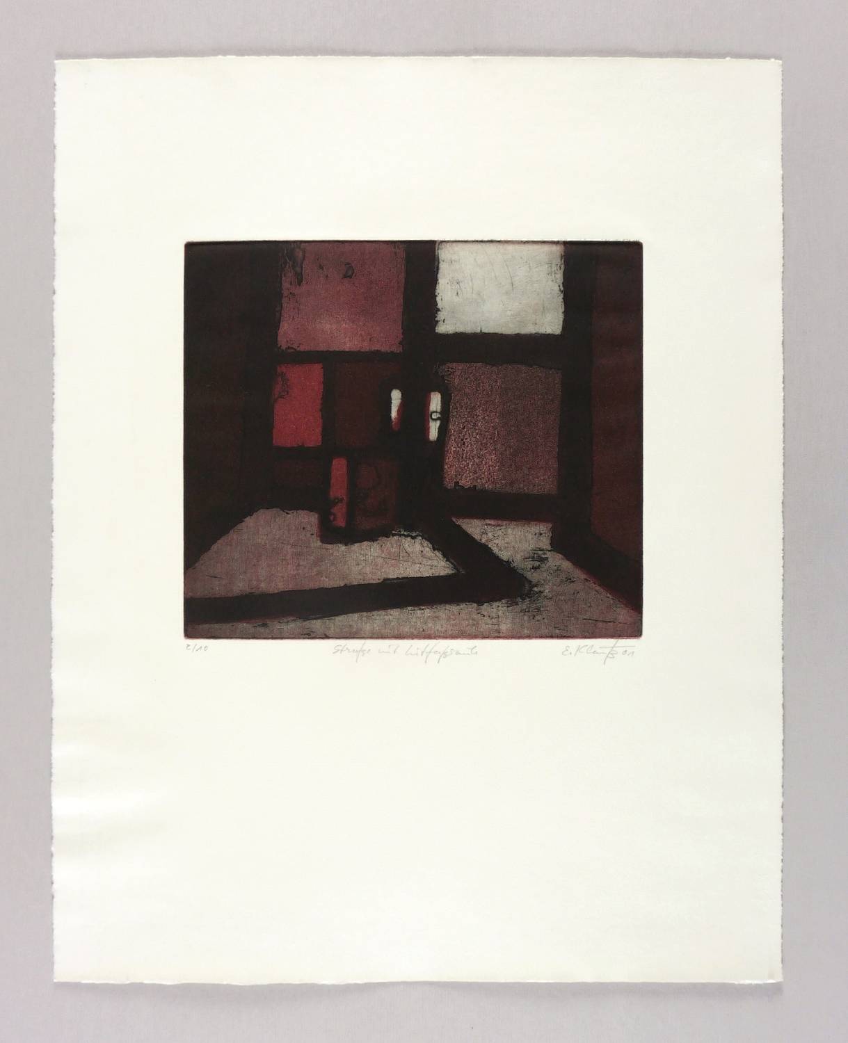 Rechts unten in Bleistift signiert und datiert: ″E. Klauß 01″. Links Auflagenbezeichnung: ″2/10″. Mittig Titel: ″Straße mit Litfaßsäule″. Wasserzeichen der Hahnemühle. – Sehr guter Zustand.