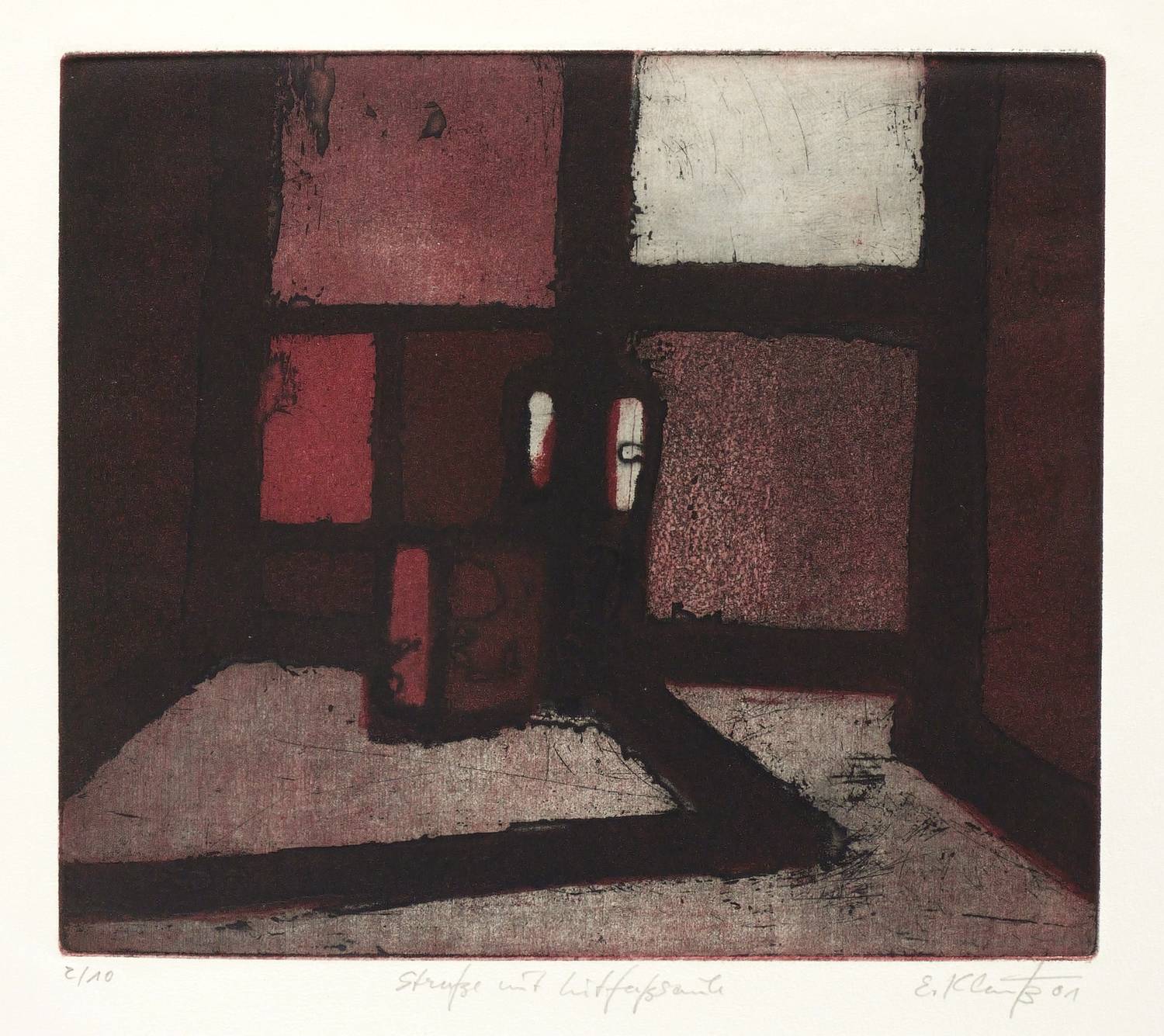2001. Farbradierung / Aquatinta, auf weichem hellchamois Hahnemühle. – Originale Künstlergrafik, von Eberhard Klauß. – Unikat. – 21,5 x 24,7 cm (Darstellung / Platte), 50 x 40 cm (Blatt).