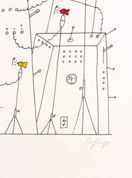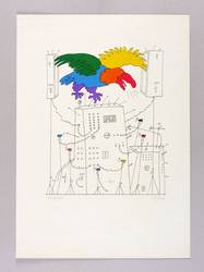 1978. Farblithografie / Feder- & Pinsellithografie, in 7 Farben, auf glattem hellchamois Velinkarton. – Originale Künstlergrafik, von Manfred Bofinger. – Auflage 100 Exemplare. – 29,5 x 24,4 cm (Darstellung / Druckbild), 49 x 35 cm (Blatt).
