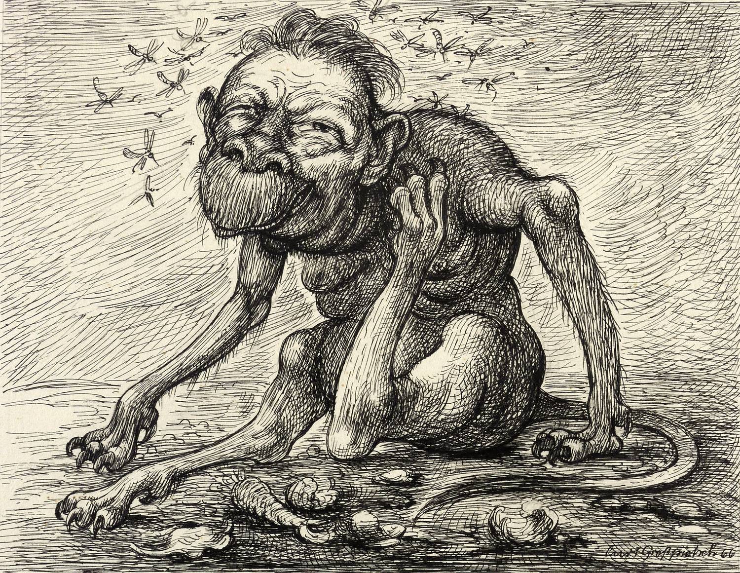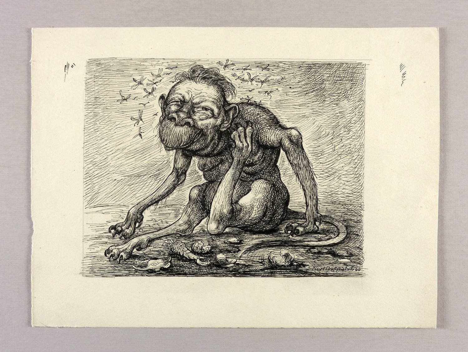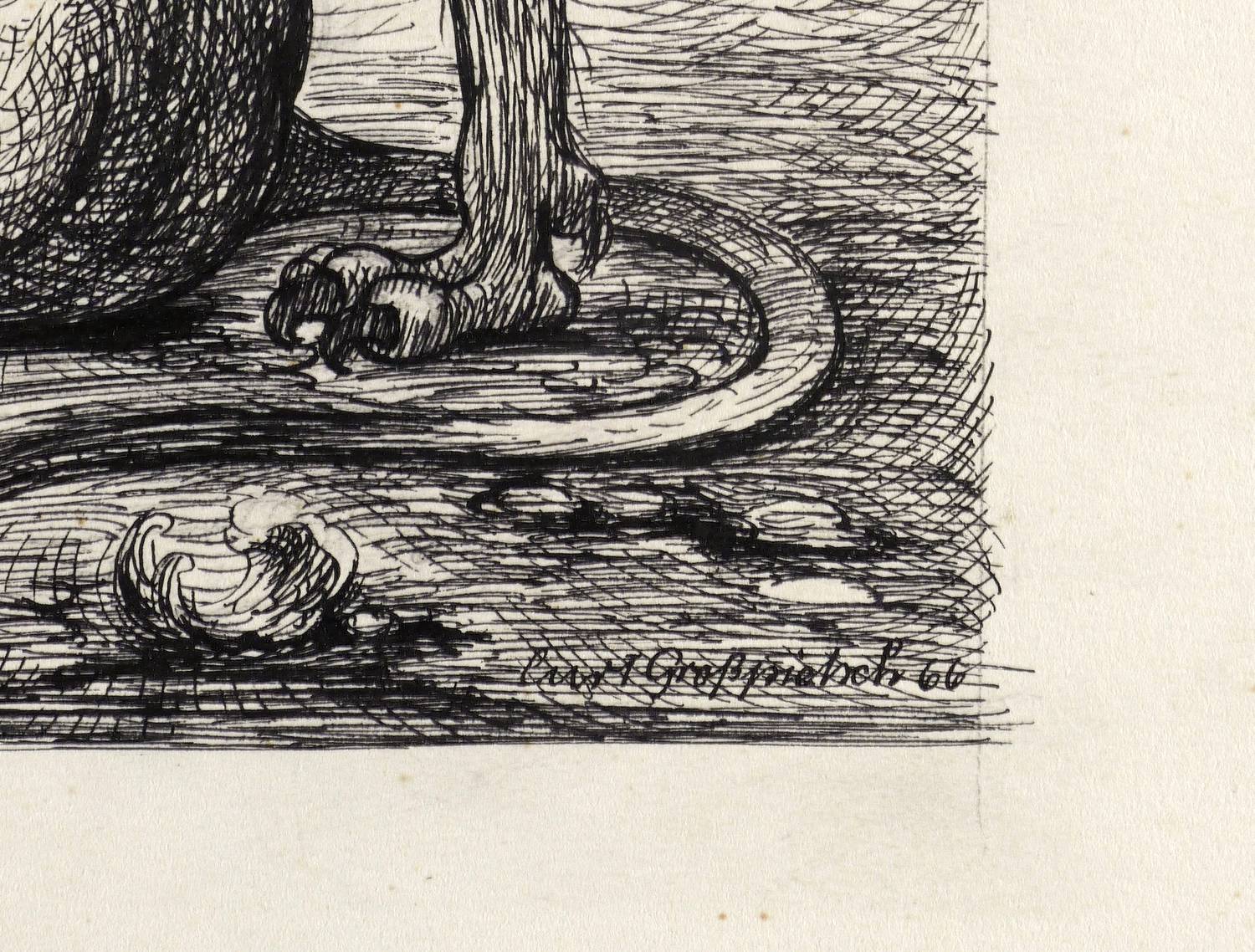 1966. Zeichnung / Federzeichnung, in schwarzer Tusche, auf hellchamois Velinkarton. – Originale Künstlergrafik, von Curt Großpietsch. – Unikat. – 17,8 x 22,8 cm (Darstellung), 25 x 34 cm (Blatt).