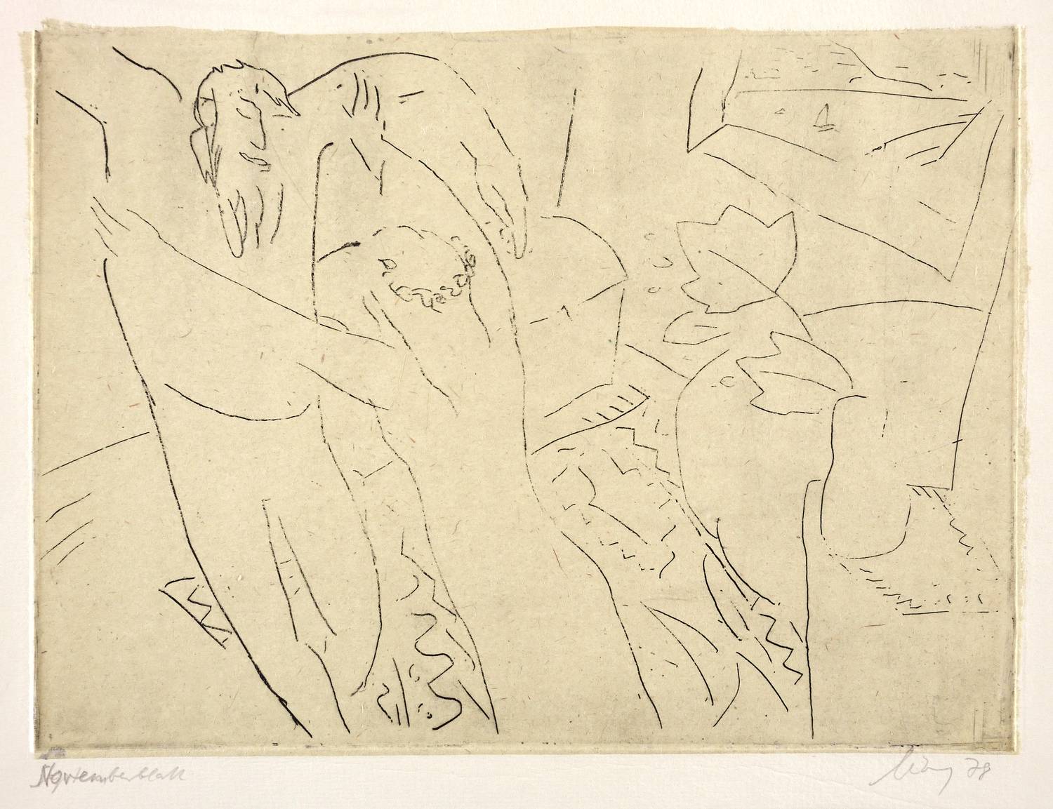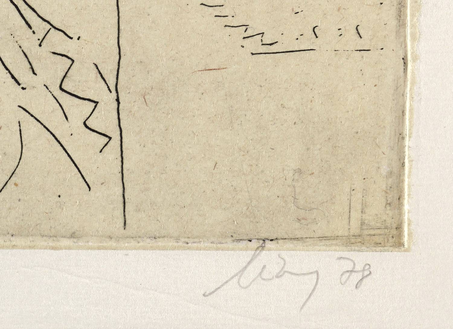 1978. Radierung / Strichätzung, in Schwarz, auf gewalztem gelbem China, auf Velinkarton. – Originale Künstlergrafik, von Helge Leiberg. – 21,8 x 30,0 cm (Darstellung / Platte), 26 x 33 cm (Blatt).