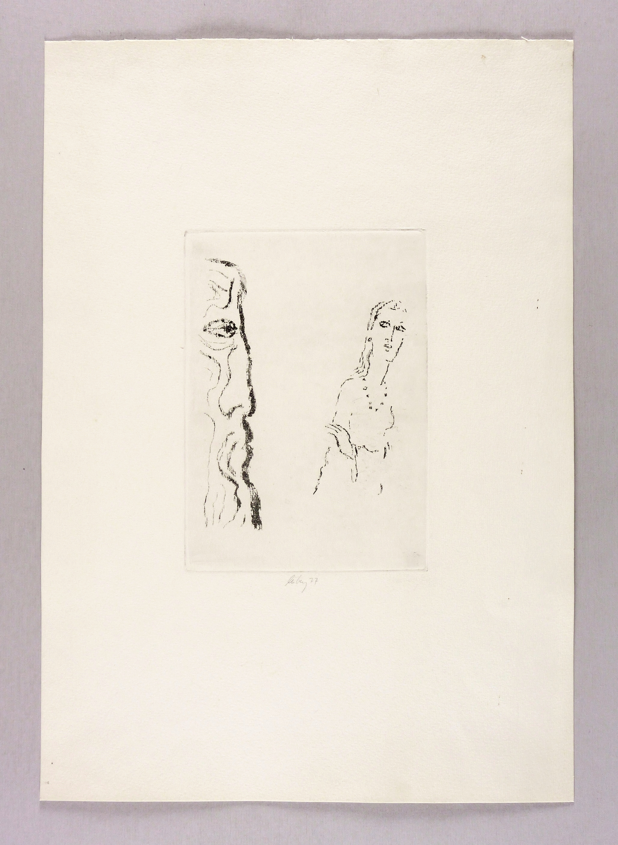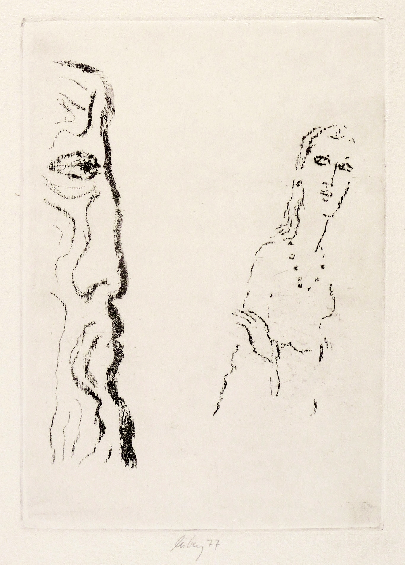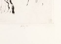 1977. Radierung / Vernis mou, in Schwarz, auf hellchamois Weißenborn. – Originale Künstlergrafik, von Helge Leiberg. – 21,8 x 15,5 cm (Darstellung / Platte), 49 x 34 cm (Blatt).