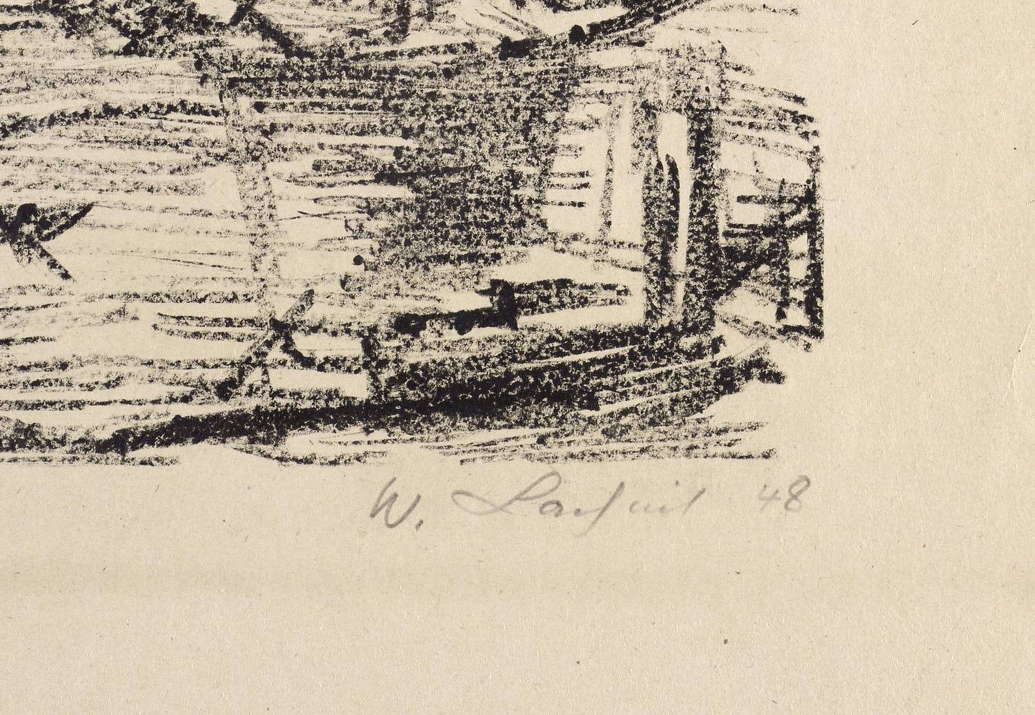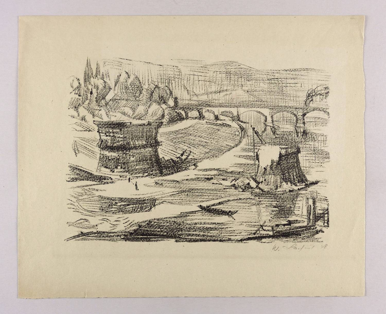 1948. Lithografie / Kreidelithografie, in Schwarz, auf festem steingrau getöntem Velinkarton. – Originale Künstlergrafik, von Wilhelm Lachnit. – 28,5 x 40,0 cm (Darstellung / Druckbild), 44 x 53 cm (Blatt).