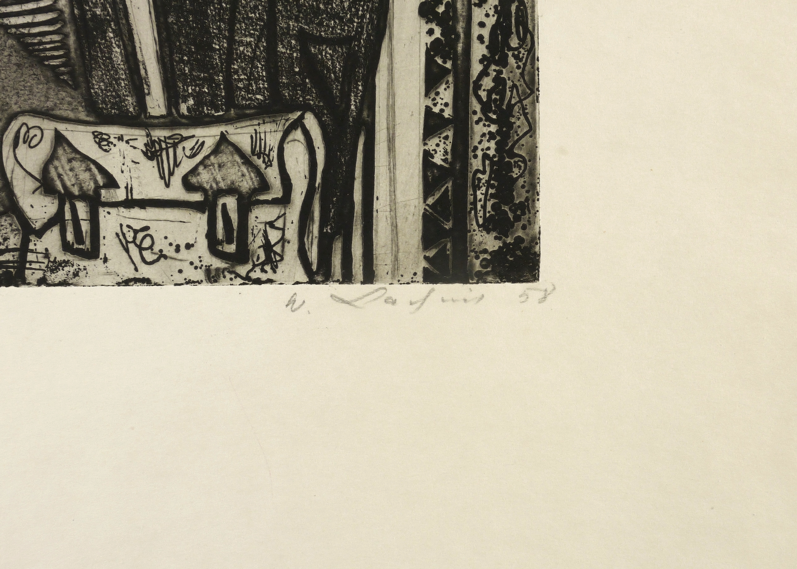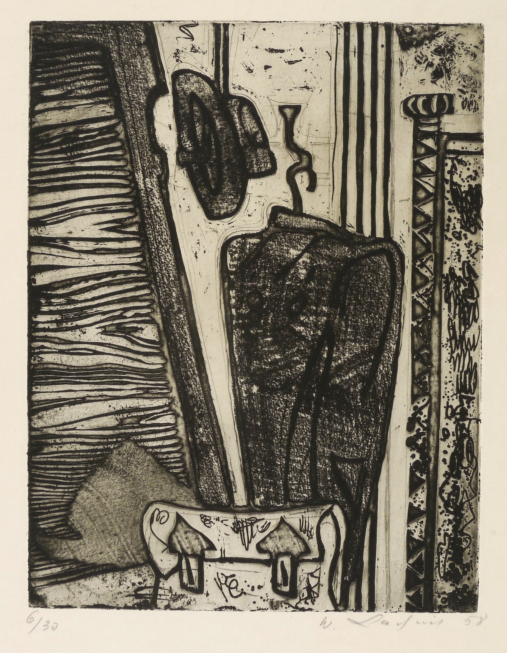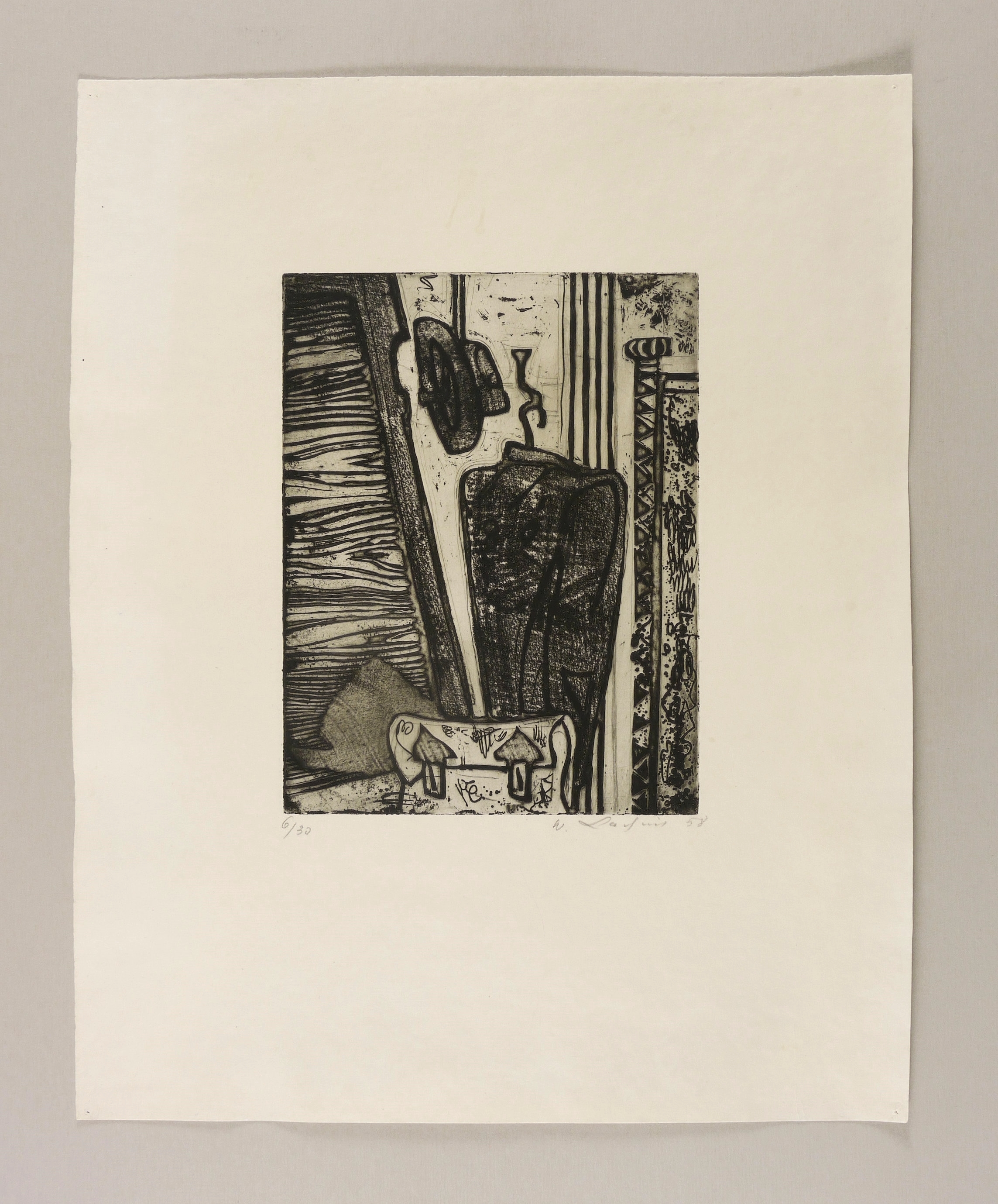 1958. Radierung / Vernis mou, Aquatinta & Kaltnadel, in Schwarz, auf glattem chamois Velinkarton. – Originale Künstlergrafik, von Wilhelm Lachnit. – Auflage Exemplar Nr. 6/30. – 24,5 x 18,8 cm (Darstellung / Platte), 48 x 38 cm (Blatt).