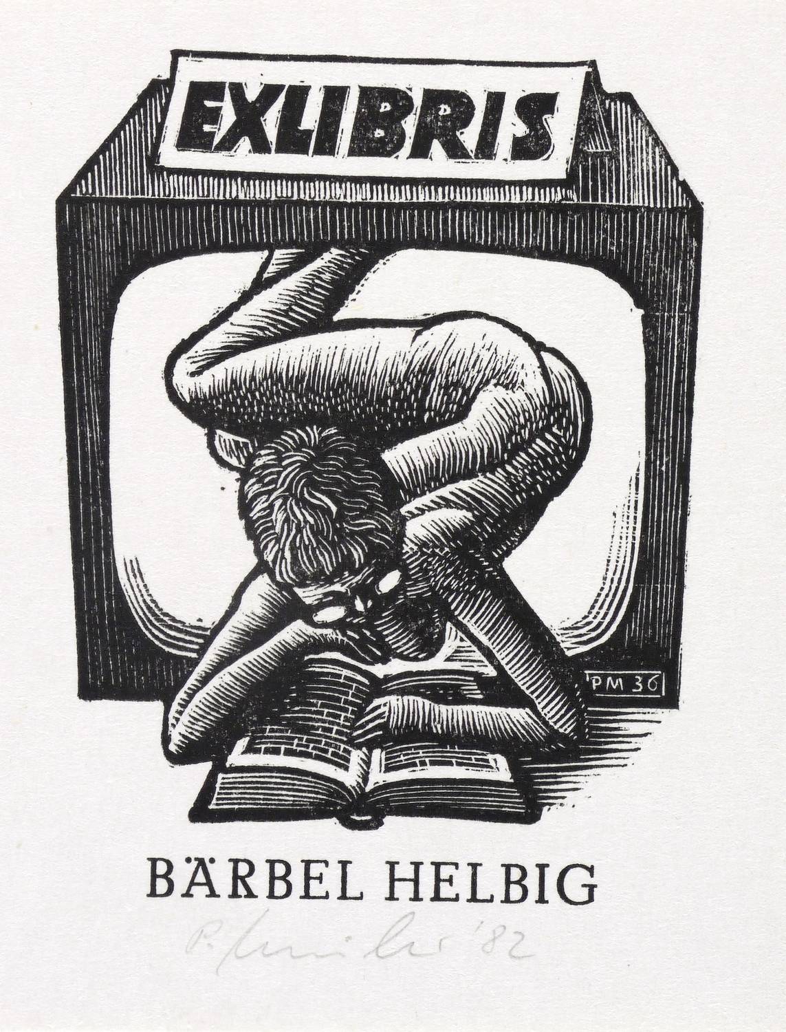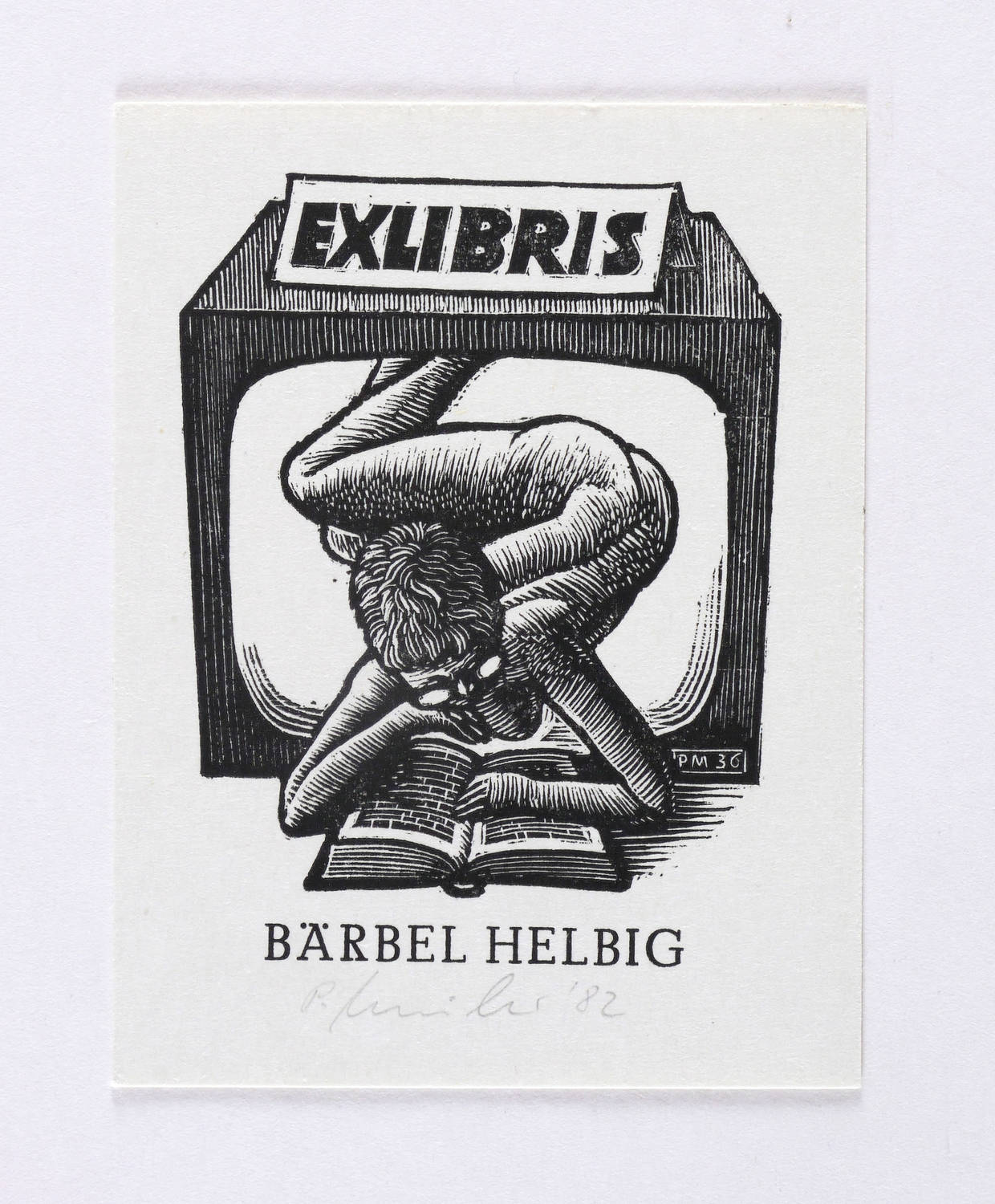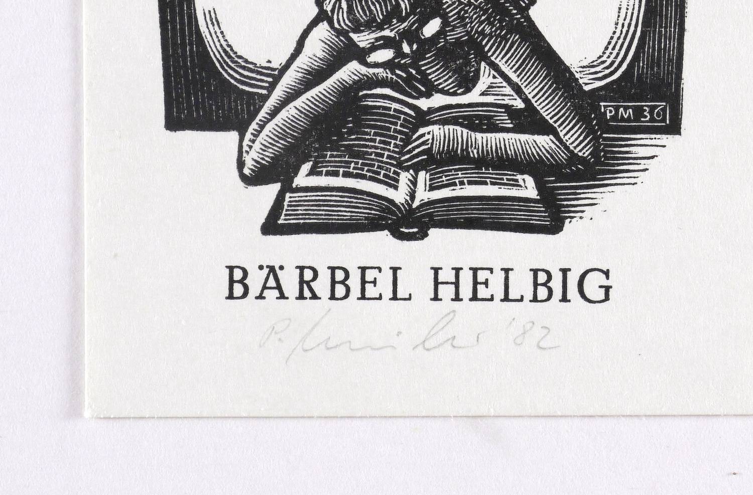 1982. Holzschnitt, in Schwarz, auf weißem Velinkarton. – Exlibris, von Peter Müller. – 6,8 x 5,1 cm (Darstellung / mit Schrift), 8,6 x 6,5 cm (Blatt).