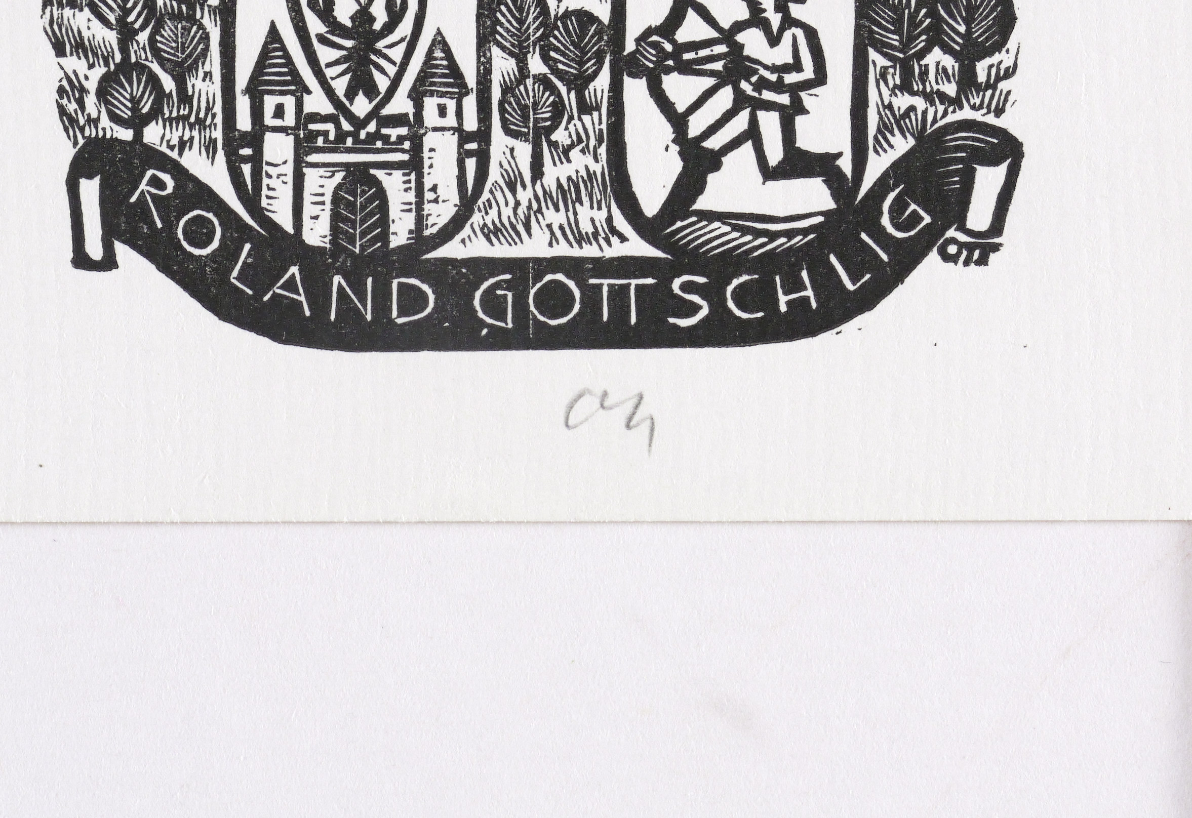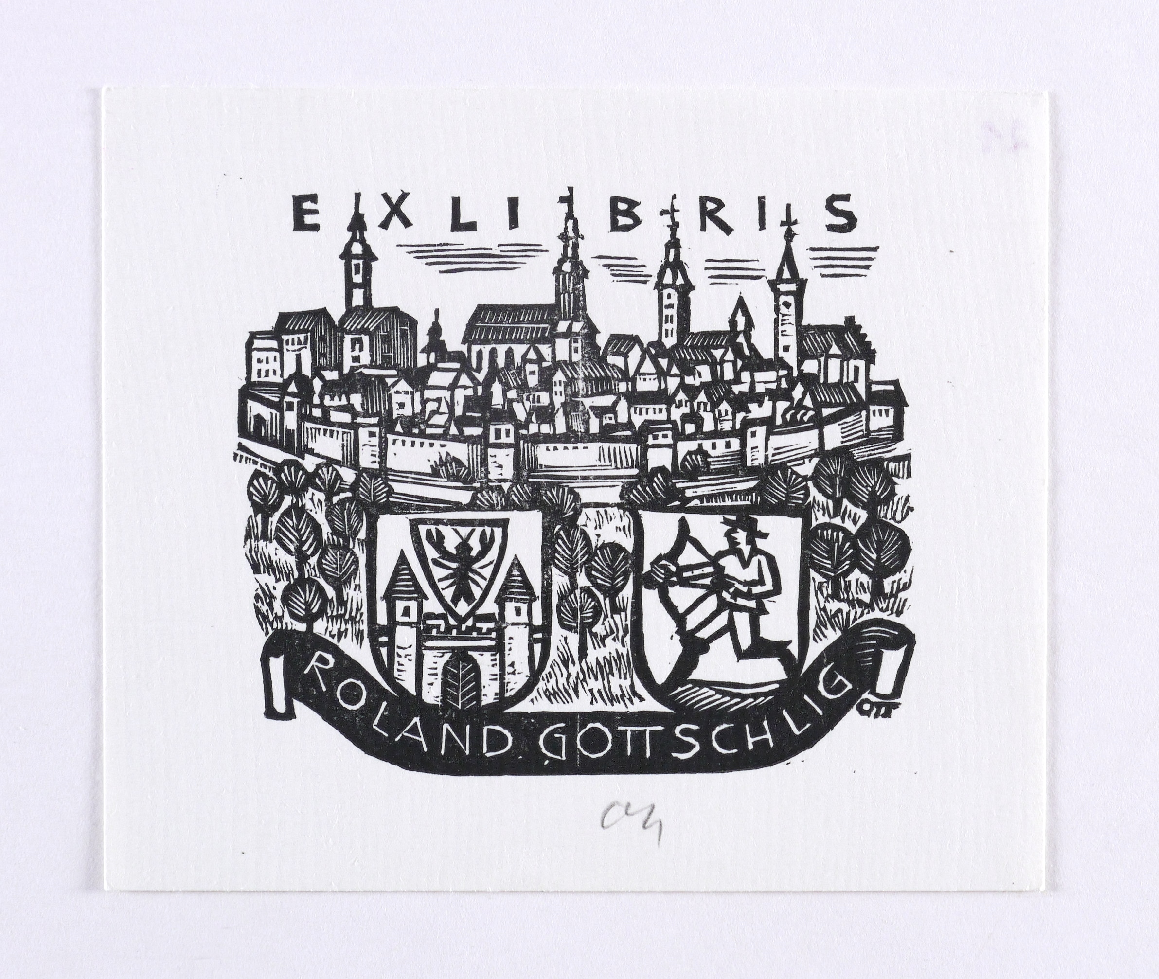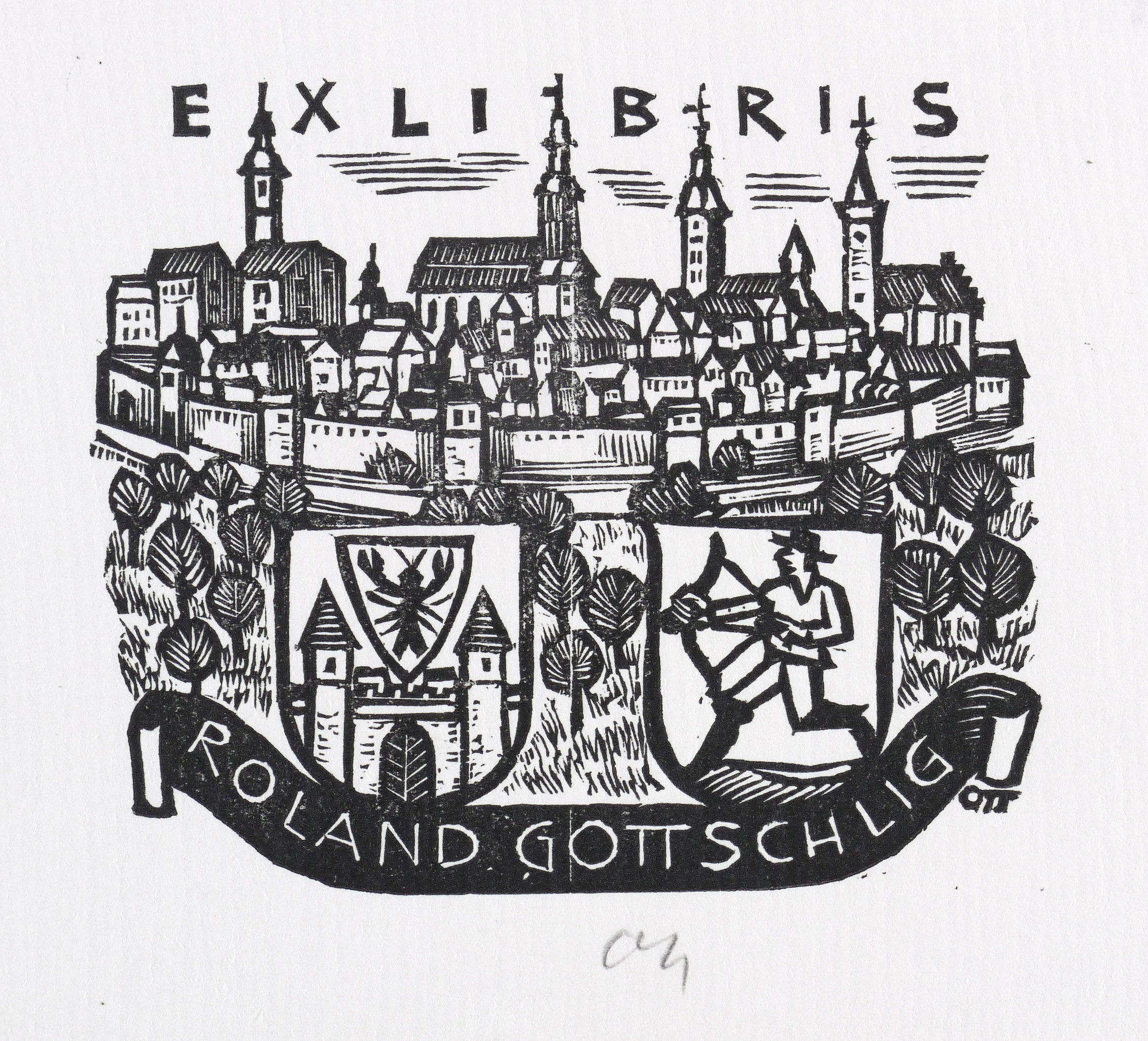 Unterhalb in Bleistift signiert: ″Ott″. Im Druckstock geschnittene Inschrift und Signatur: ″EXLIBRIS ROLAND GOTTSCHLIG // OTT″. – Historisierende Stadtansicht Cottbus mit den Stadtwappen von Cottbus und Morsleben im Vordergrund. – Ohne Mängel. Sehr guter Zustand.