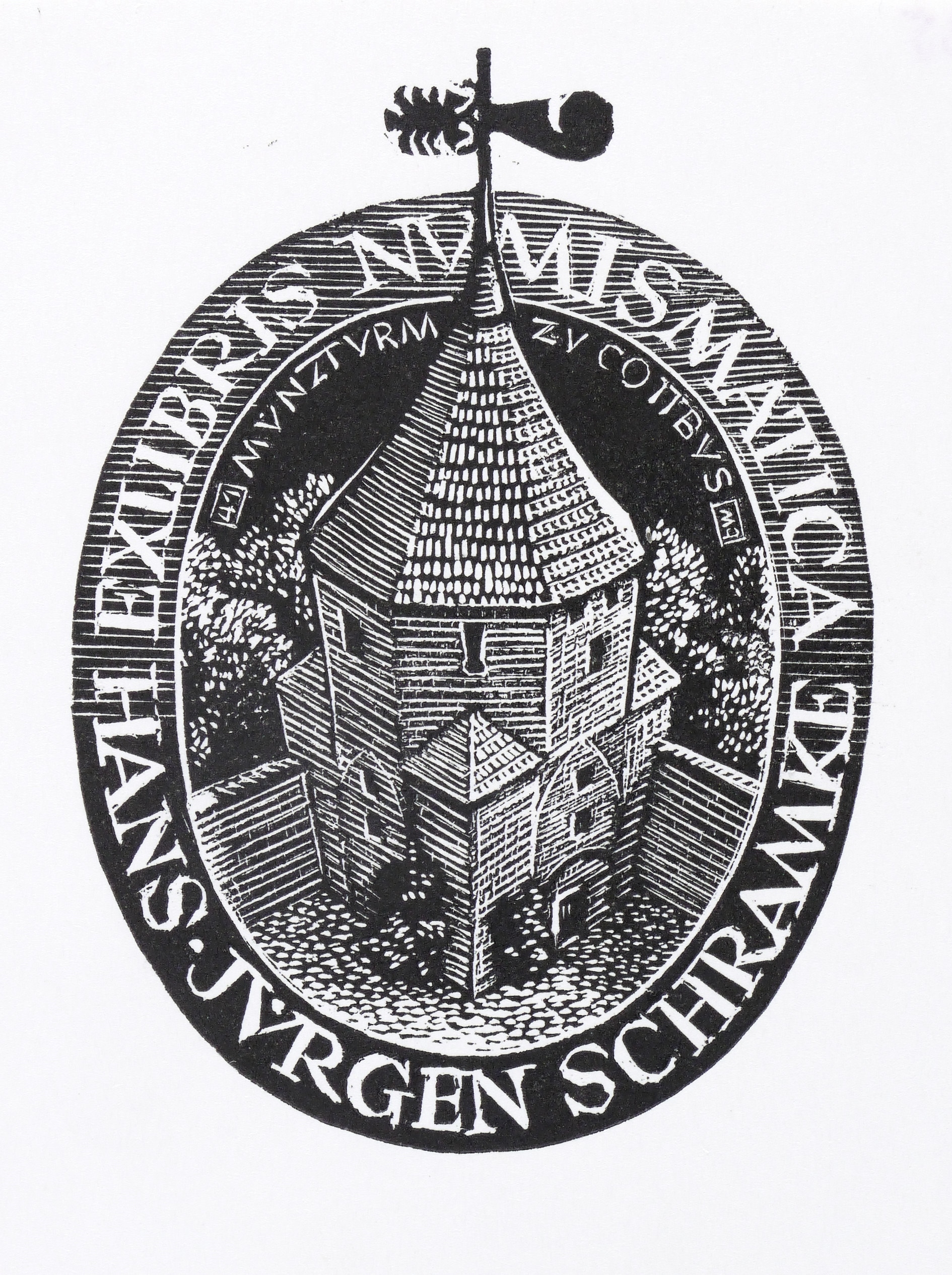 Nicht handsigniert. Inschrift: ″EXLIBRIS NUMISMATICA HANS- JÜRGENSCHRAMKE // MÜNZTURM ZU COTTBUS″. – Sehr guter Zustand.