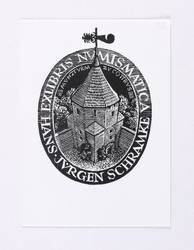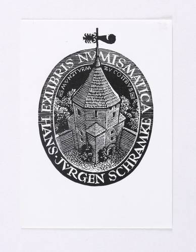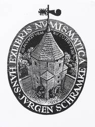 Deutscher Grafiker. – „Exlibris numismatica Hans-Jürgen Schramke (Münzturm Cottbus)”.