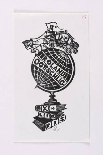 Schmid, Hubert. – „Exlibris Roland Gottschlig (Reisekutsche auf Globus)”.