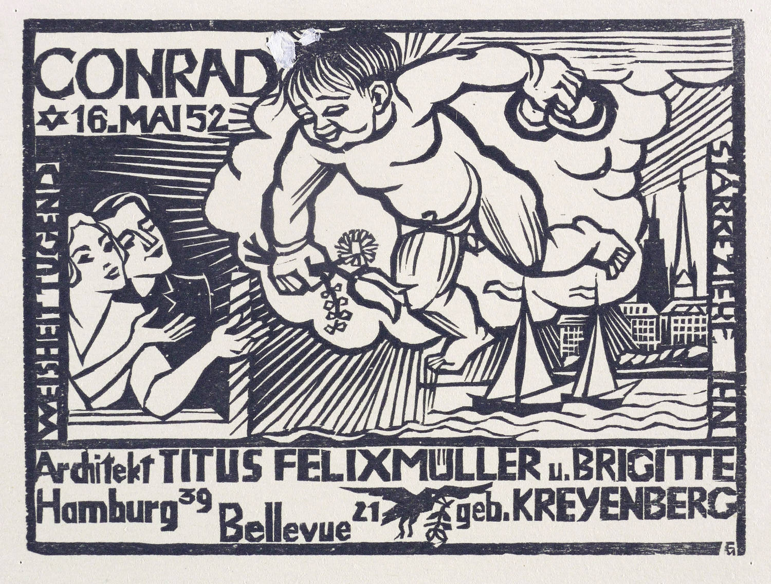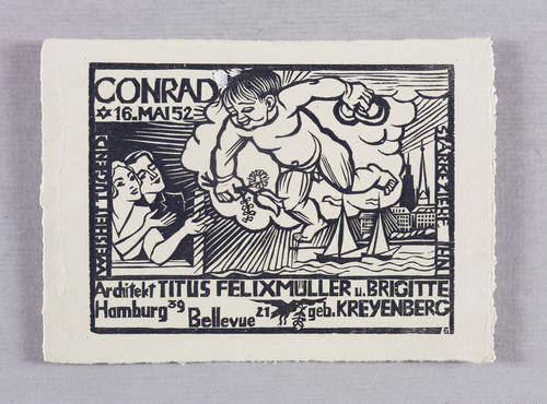 1952. Holzschnitt, in Anthrazit, auf kräftigem chamois Velinkarton. – Originale Künstlergrafik, von Conrad Felixmüller. – 8,9 x 12,0 cm (Darstellung / Druckstock), 10,8 x 14,8 cm (Blatt).