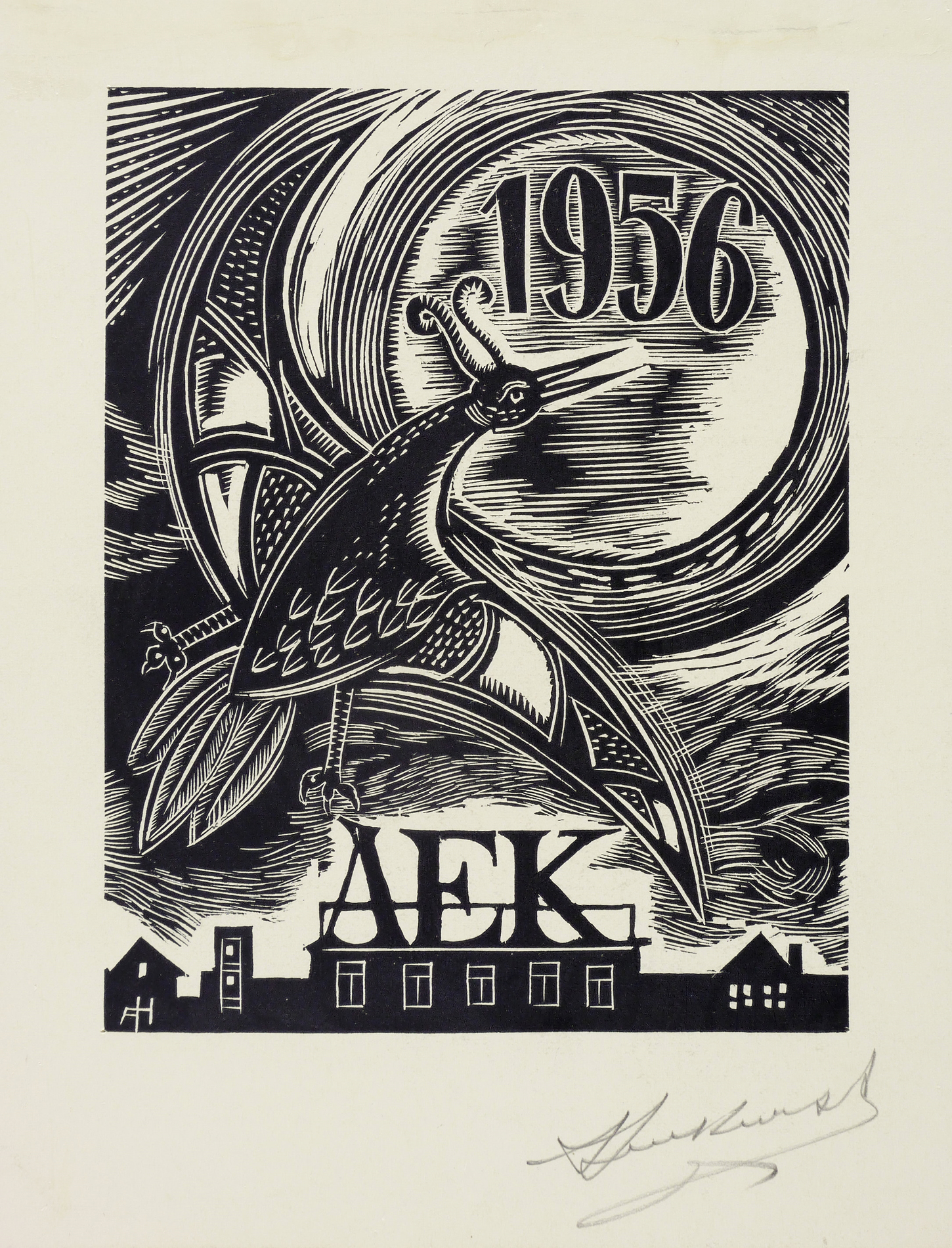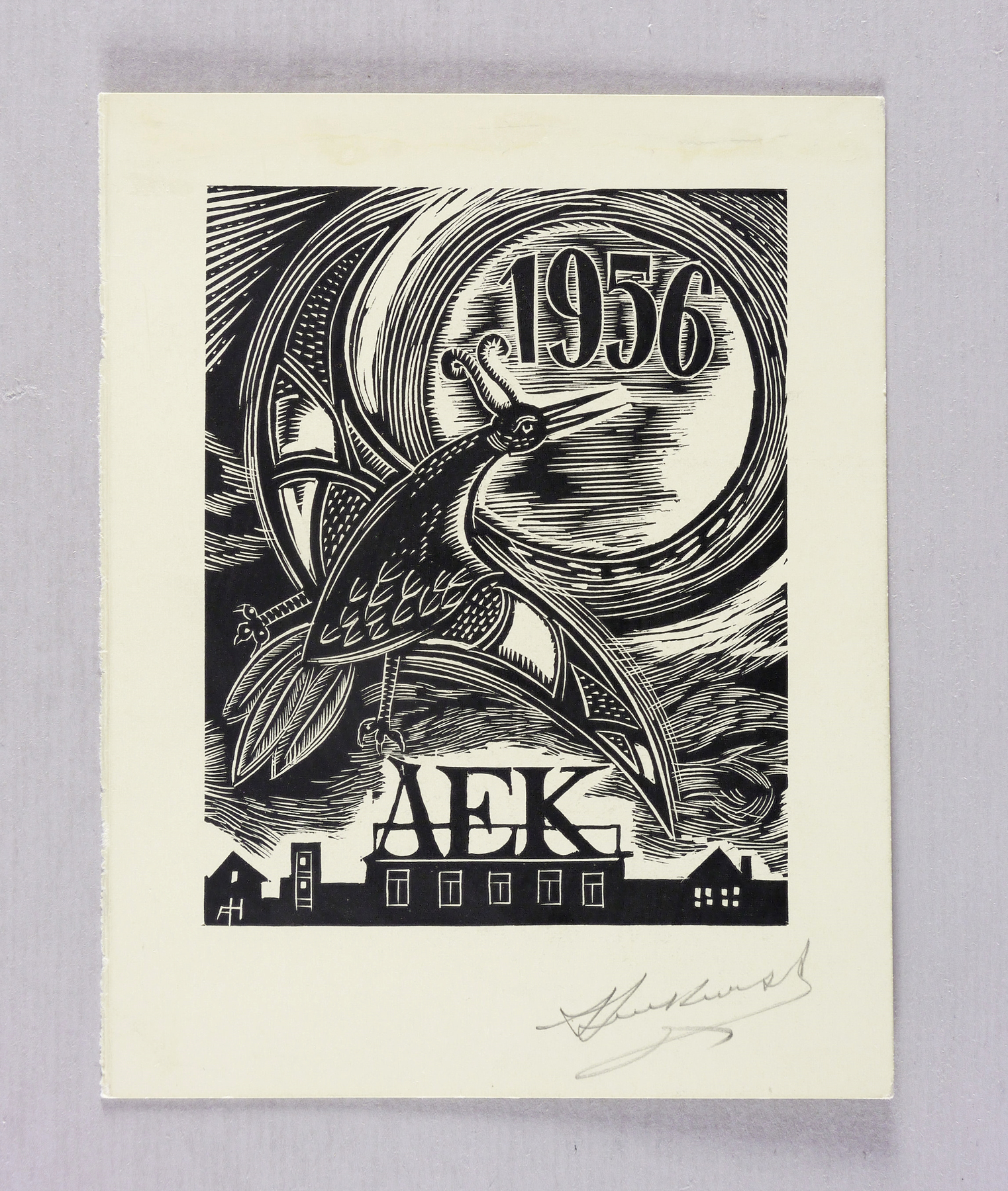 1955. Holzschnitt, in Schwarz, auf gelbem Velinkarton. – Originale Künstlergrafik, von Antoon Herckenrath. – 11,2 x 8,8 cm (Darstellung / Druckstock), 15,3 x 12,0 cm (Blatt).