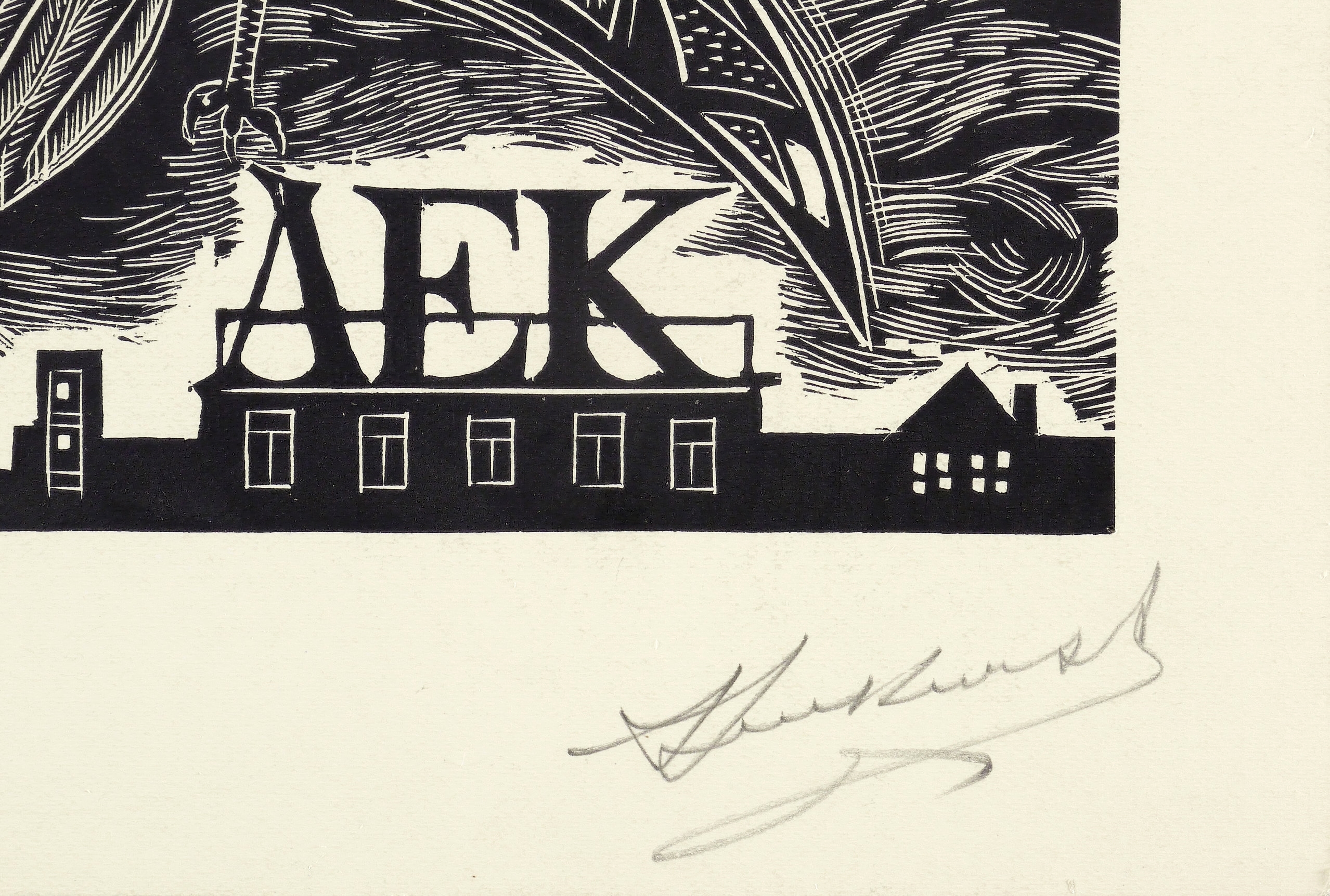 Rechts unten in Bleistift signiert: ″A. Herckenrath″. Im Druckstock Jahr und Initiale: ″1956 // AEK″. Verso Sammlernotizen. – Leichte Leimspuren im oberen Blattrand. Insgesamt guter Zustand.