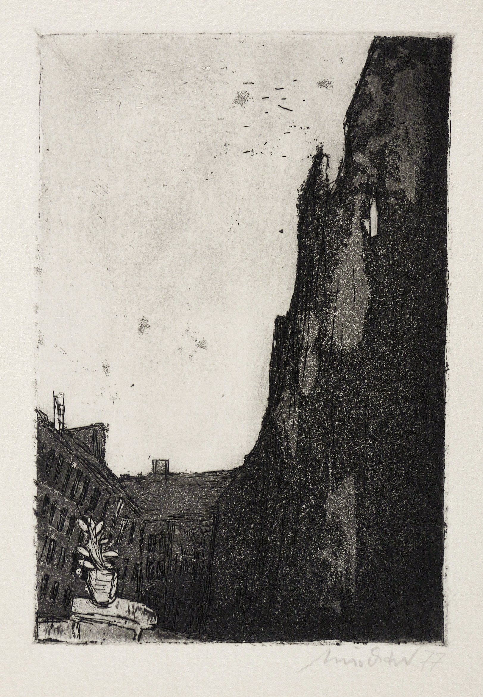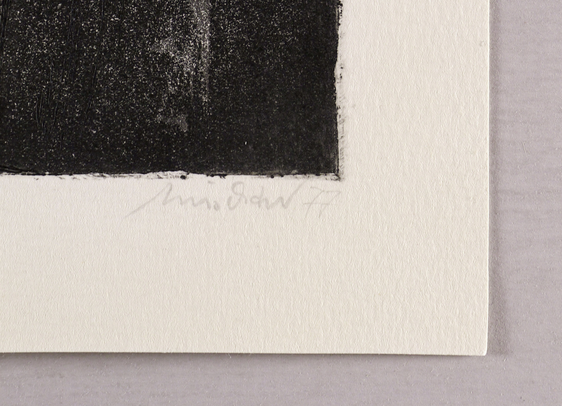 1977. Radierung / Strichätzung & Aquatinta, in Schwarz, auf hartem hellchamois Weißenborn. – Originale Künstlergrafik, von Peter Muschter. – 15,3 x 10,4 cm (Darstellung / Platte), 21 x 15 cm (Blatt).
