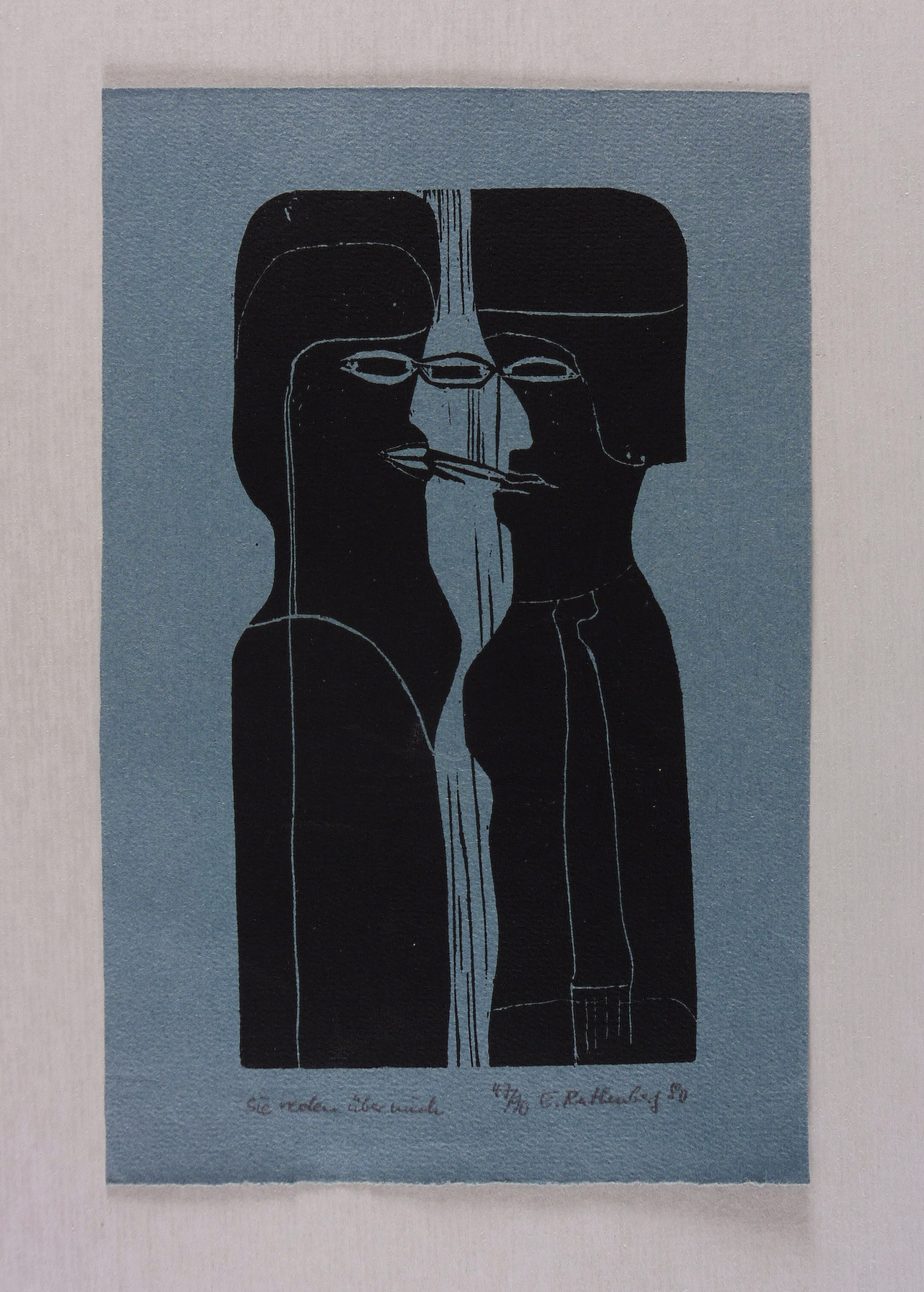 Rechts unten in Bleistift signiert und datiert: ″E. Ruthenberg 1980″. Links Auflagenbezeichnung und Titel: ″Sie reden über mich // 47/90″. – Sehr guter Zustand.