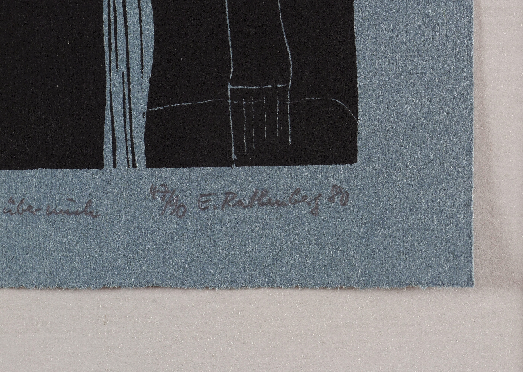 1980. Linolschnitt, in Schwarz, auf rauem graublau getöntem Bütten. – Originale Künstlergrafik, von Eckehart Ruthenberg. – Auflage Exemplar Nr. 47/90. – 19,3 x 10,1 cm (Darstellung / Druckbild), 25 x 16 cm (Blatt).