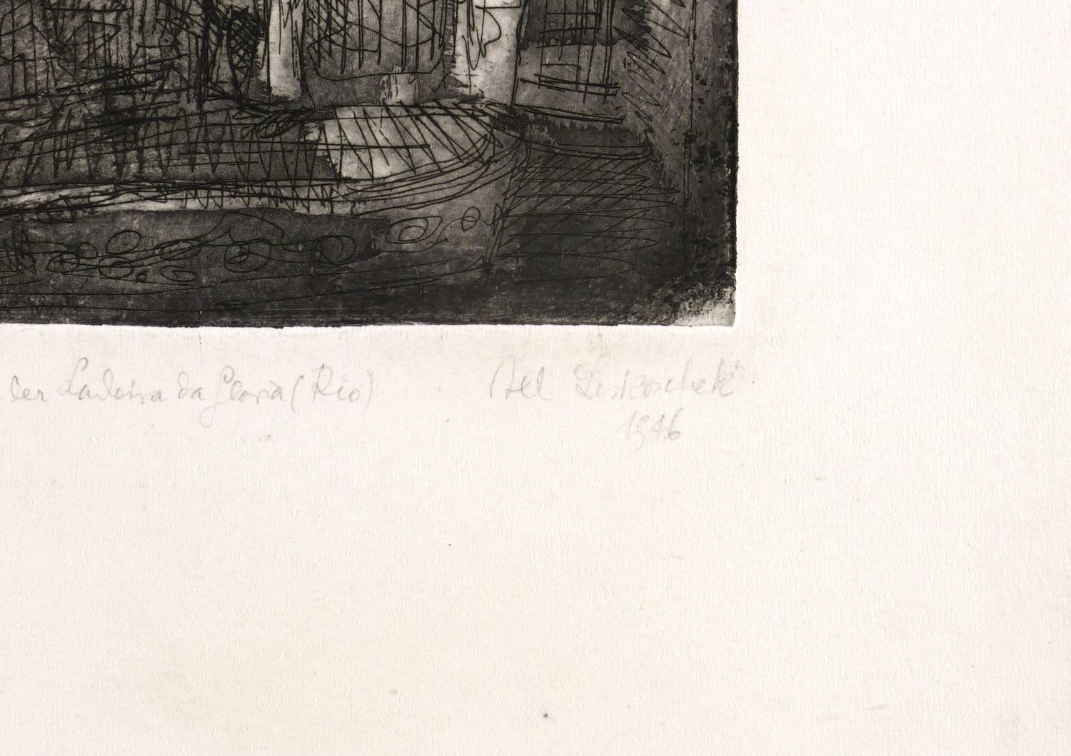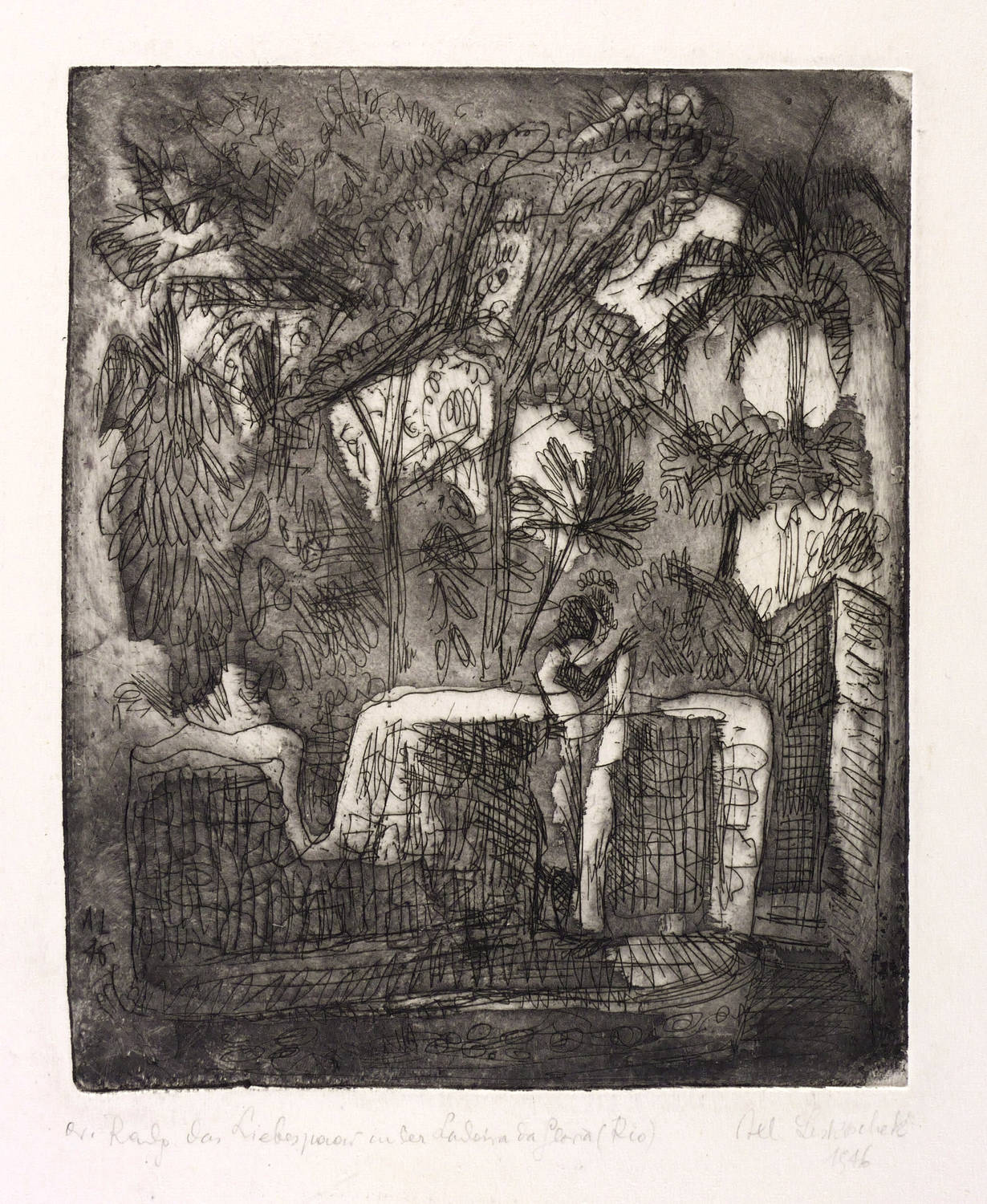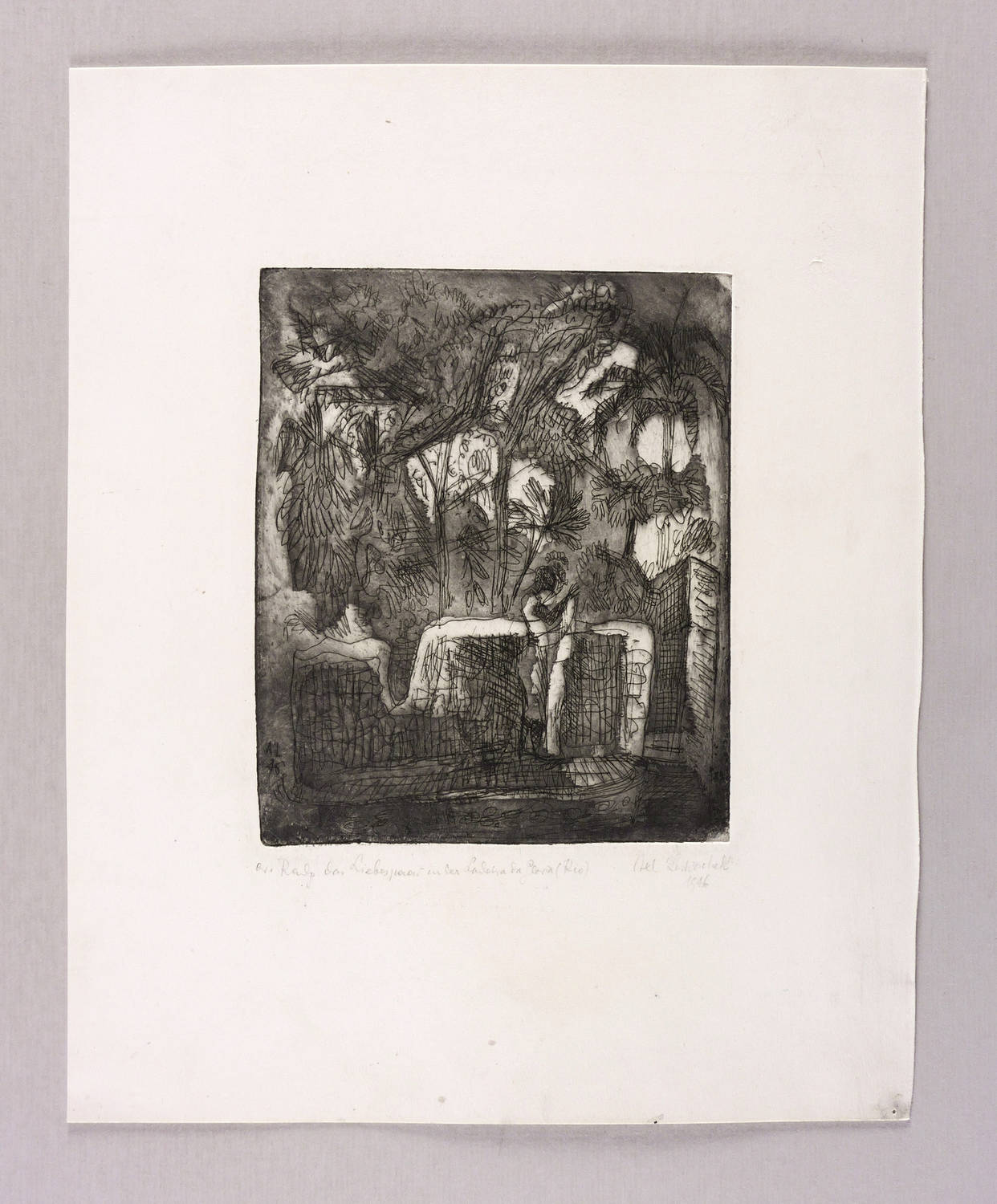Rechts unten in Bleistift signiert und datiert: ″Axl Leskoschek 1946″. Links bezeichnet: ″or. Radg. 'Das Liebespaar in der Ladeira da Gloria (Rio)'″. In der Platte links unten Monogramm und Jahr: ″AL 46″. – Provenienz: Sammlung Erhard Frommhold, Dresden. Frommhold war langjähriger Lektor, Cheflektor und Verlagsleiter des Verlag der Kunst in Dresden. – Sehr guter Zustand.