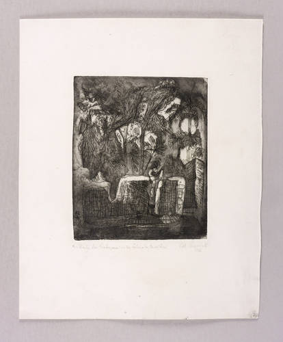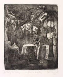 1946. Radierung / Aquatinta & Strichätzung, partiell geschliffen, in Schwarz, auf festem hellgelbem Velinkarton. – Originale Künstlergrafik, von Axl Leskoschek. – 18,4 x 15,2 cm (Darstellung / Platte), 34 x 28 cm (Blatt).