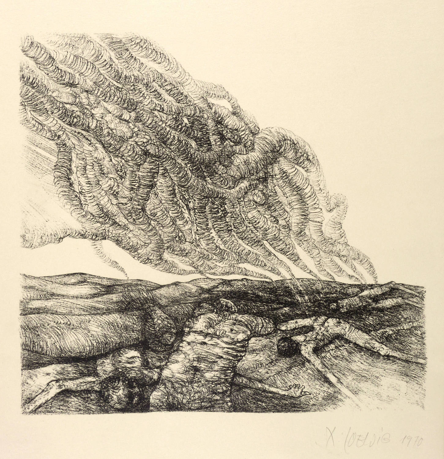 1970. Lithografie / Kreidelithografie, in Schwarz, auf festem chamois Velinkarton. – Originale Künstlergrafik, von Roger Loewig. – Auflage 50 Exemplare. – 26,1 x 27,7 cm (Darstellung / Druckbild), 43 x 32 cm (Blatt).
