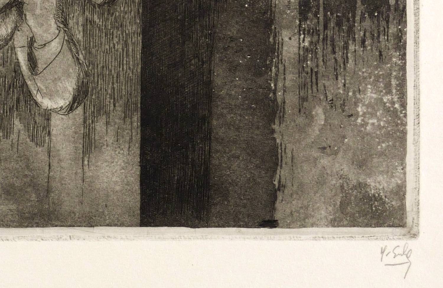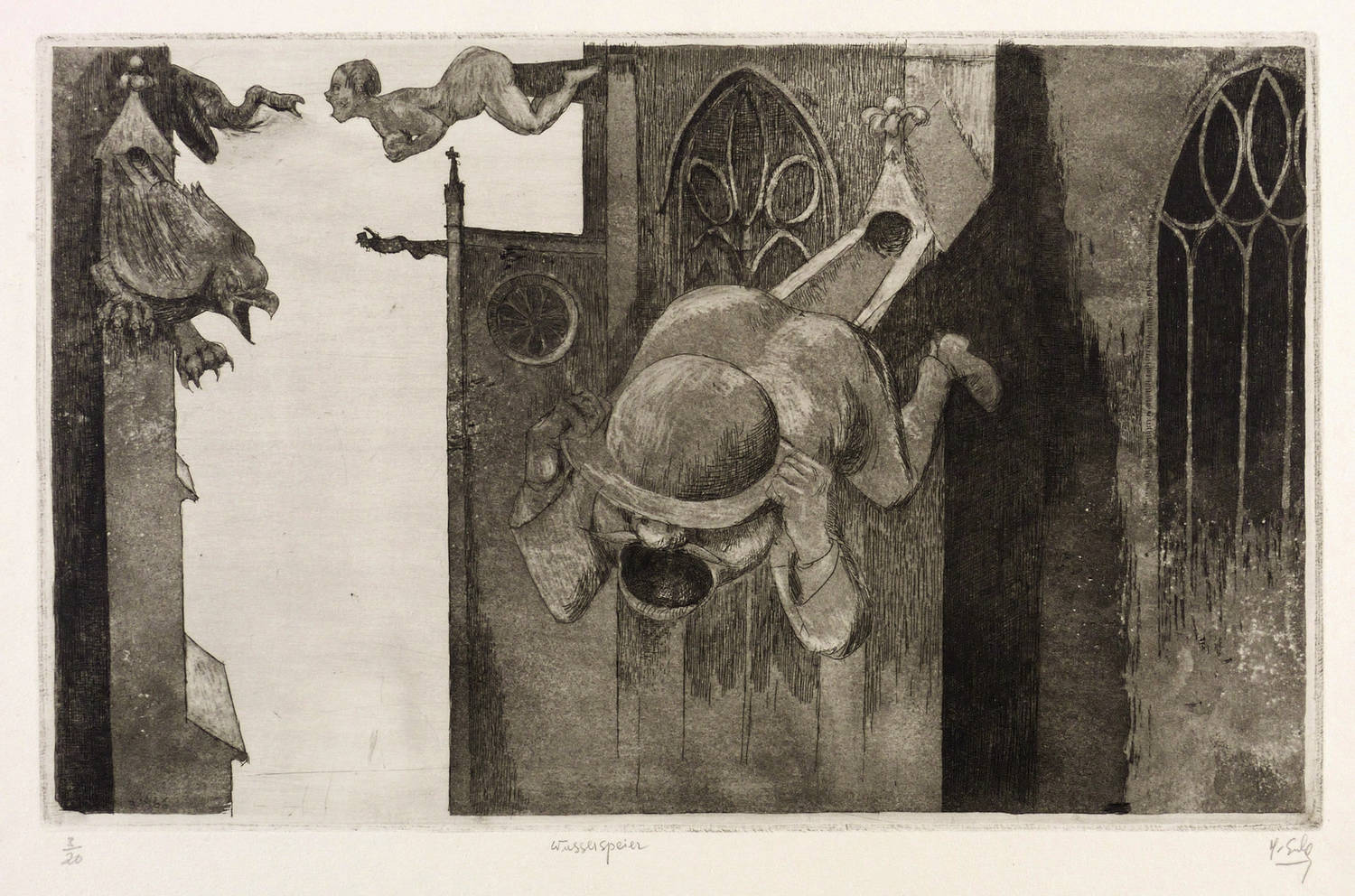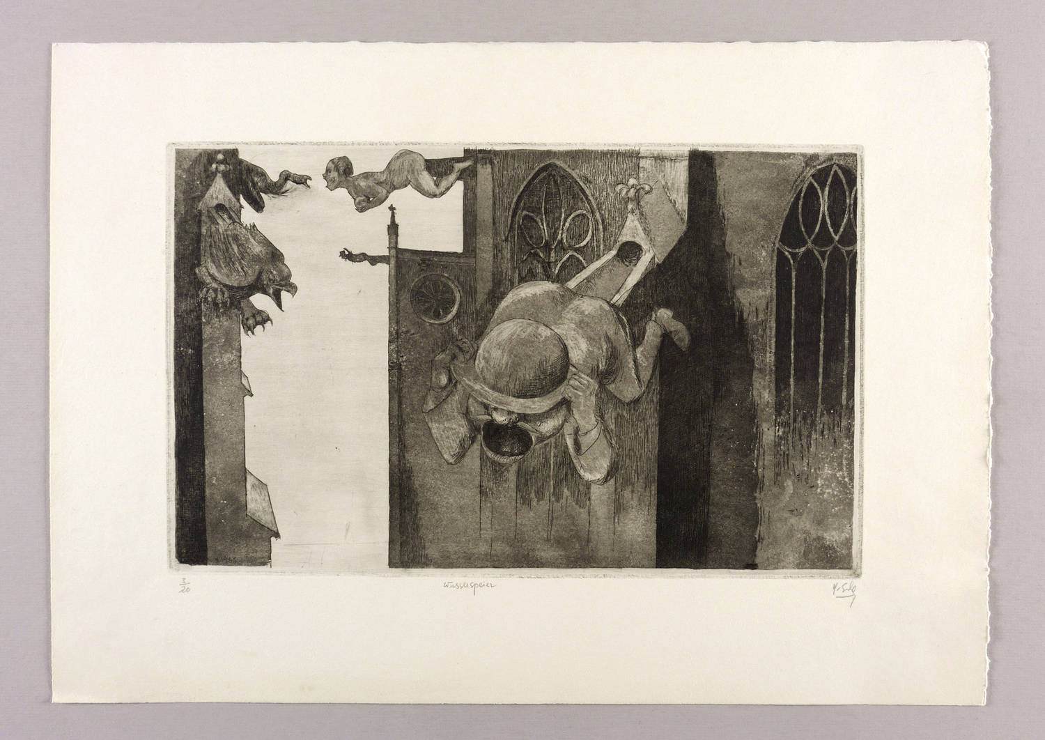 Rechts unten in Bleistift signiert: ″H. Escher″. Links Auflagenbezeichnung: ″13/20″. Mittig Titel: ″Wasserspeier″. In der Platte links unten datiert: ″3.1966″. – Provenienz: Sammlung Erhard Frommhold, Dresden. Frommhold war Cheflektor und Verlagsleiter des Verlag der Kunst in Dresden. – Sehr guter Zustand.