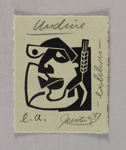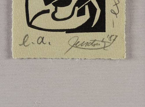 1987. Linolschnitt, in Schwarz, auf gelbgrau getöntem Hahnemühle. – Exlibris, von Hendrik Hause. – Künstlerexemplar (e.a.). – 4,8 x 4,3 cm (Darstellung / Druckbild), 7,5 x 6,0 cm (Blatt).